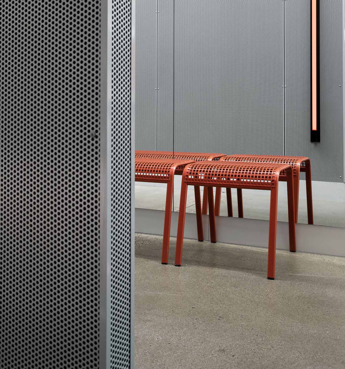 传承品牌和经验,由Mim Design打造的FoxFit(墨尔本一家女性健身会所)力求在充满活力的环境中激发个人成就,使其适应客户及其需求。 受到设施的市区位置和工业历史的影响,Mim Design提出了一种叙述,将健身环境的实际严格要求与“休闲”生活方式的出现和合意性结合在一起。 为了激发生气和动力,工作室利用了色彩的力量-火热的橙色和充满活力的霓虹灯-营造了动感。Mim Design的女性团队主要从访客动机、实用性和静修性的角度进行追踪,从而借鉴自己的健身经验为设计提供依据。