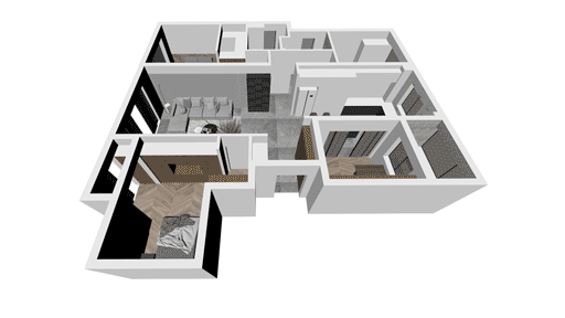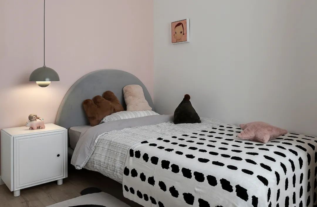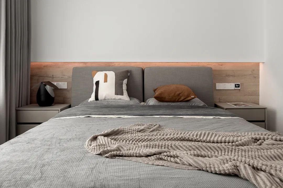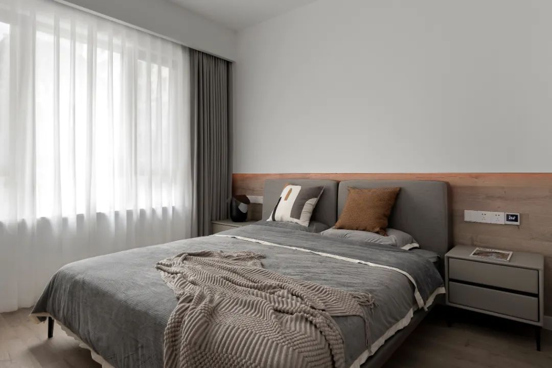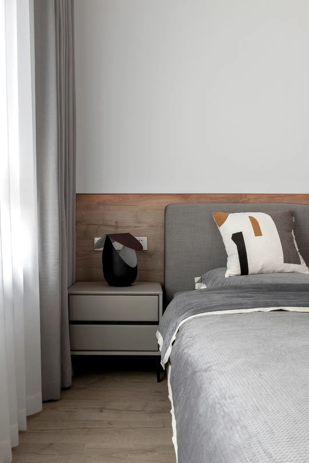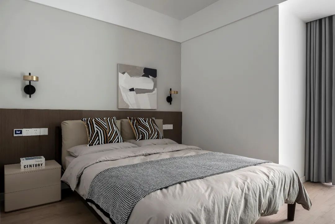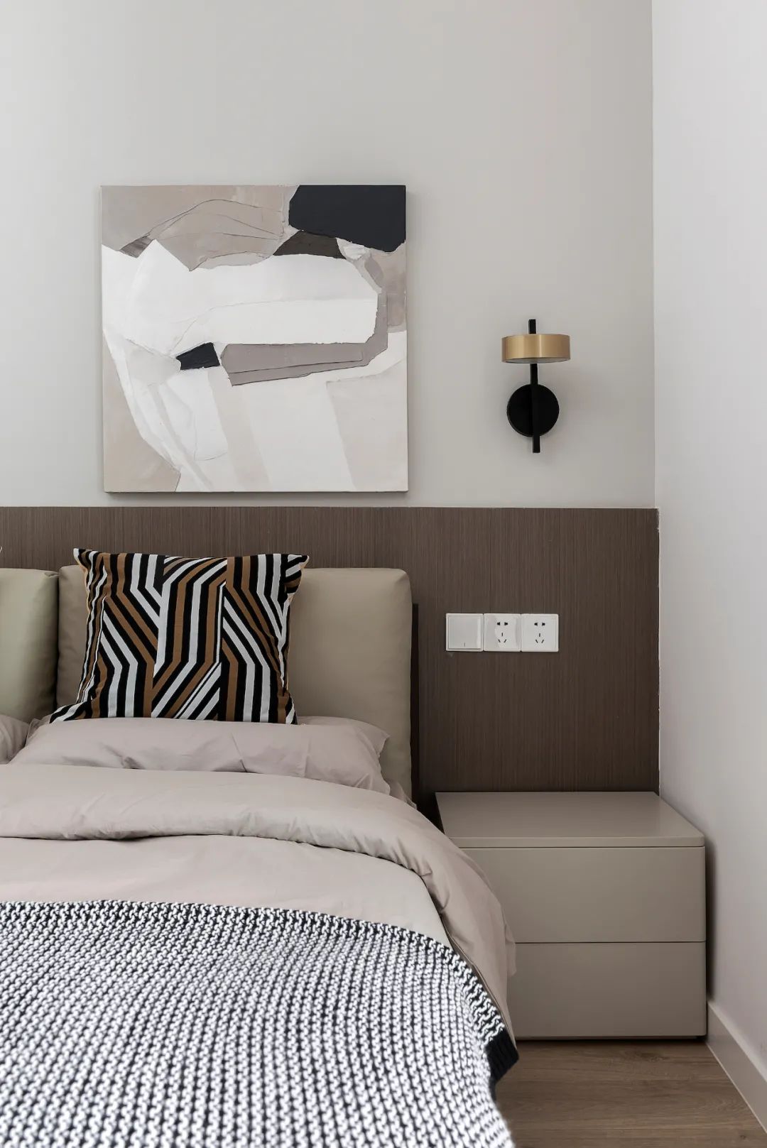 主卧地板与墙面结合考虑设计,使空间具有更好的连贯性。小小的衣帽间让业主的储物需求得到满足。