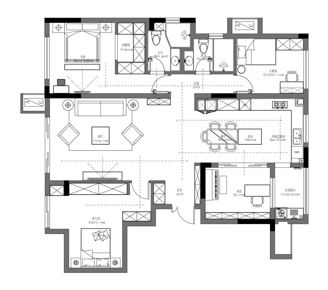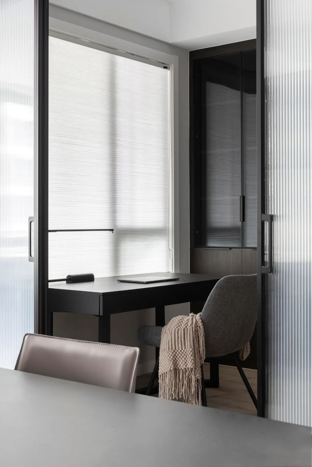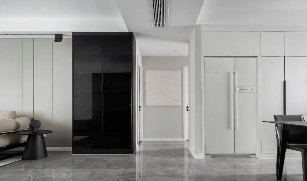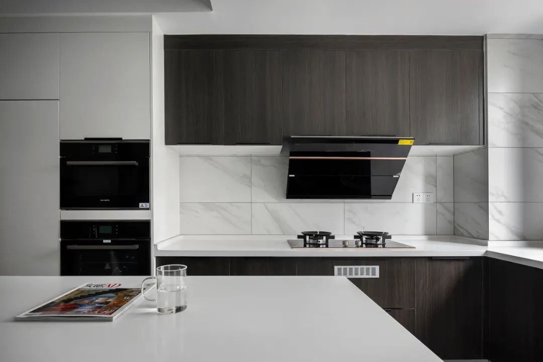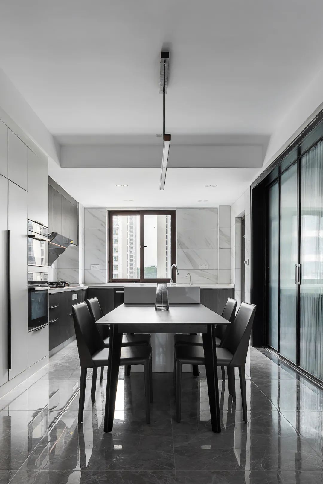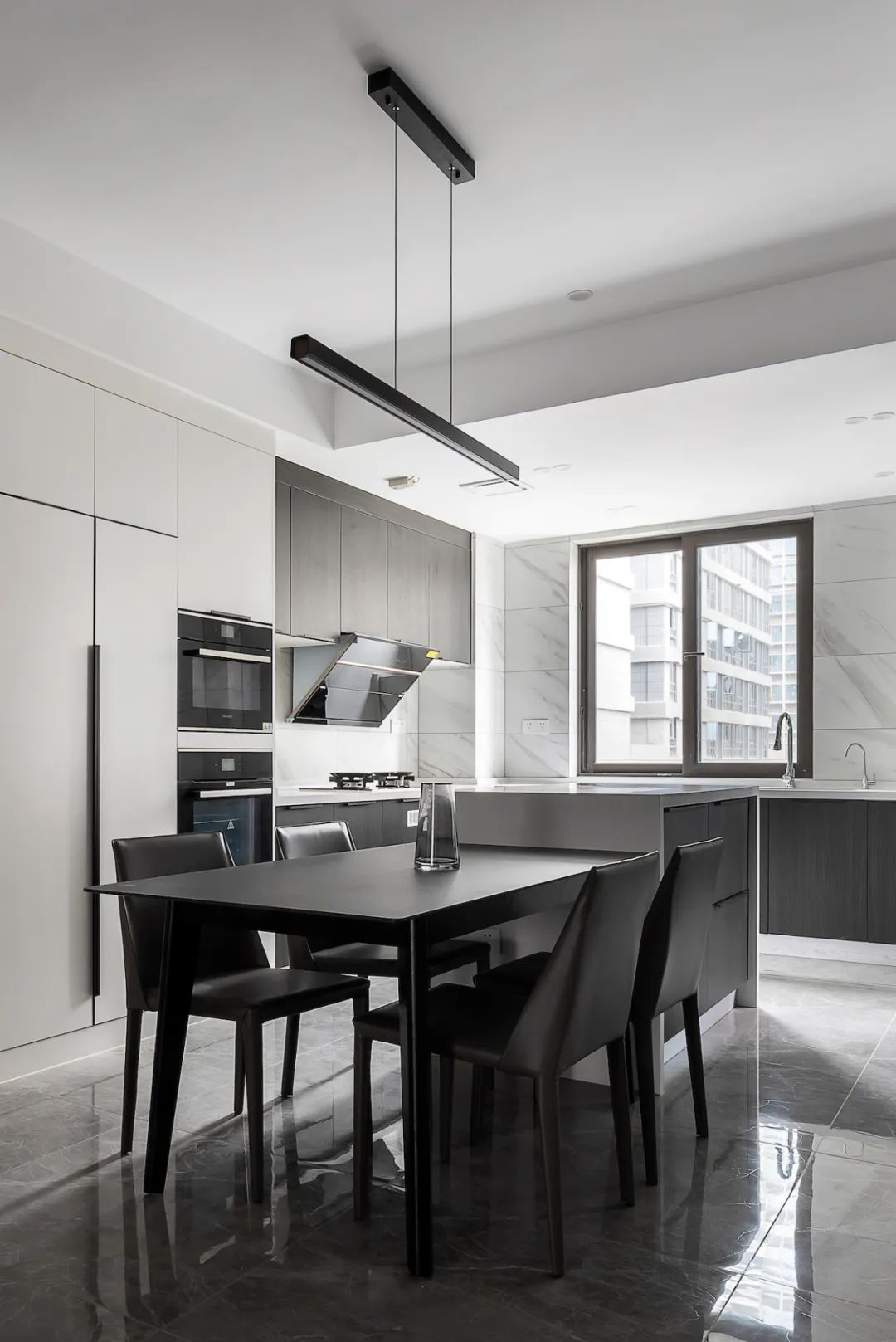 设计师将厨房与餐厅重组,顺势而为的岛台与餐桌衔接,合理化空间结构,西厨与餐厅区域合二为一,餐厅与岛台的穿插体块连贯自然。