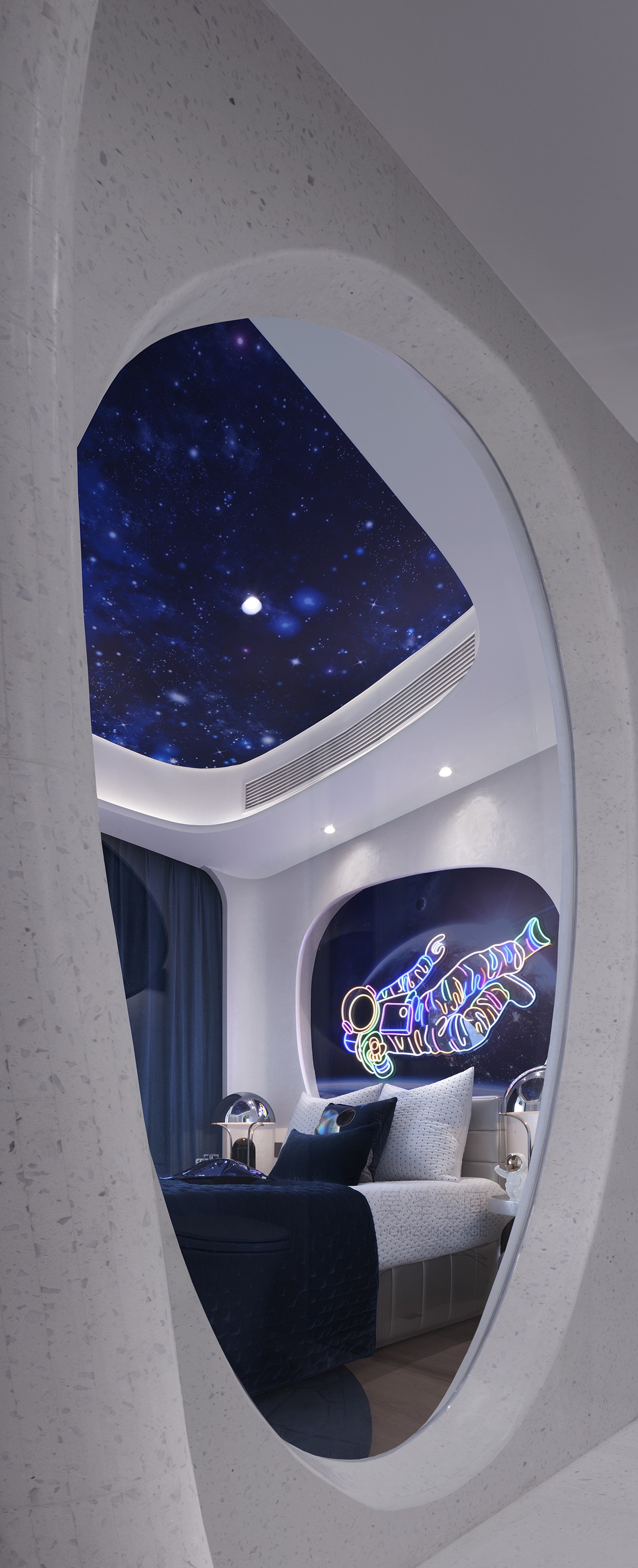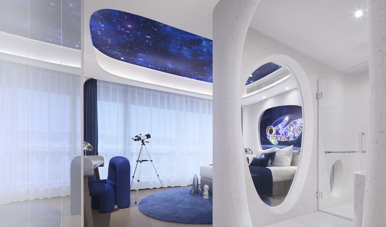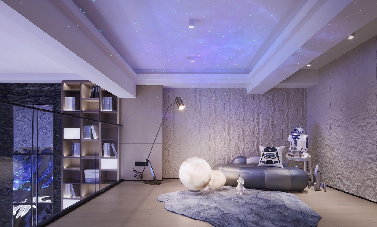 太空总是引人遐想,将太空舱的造型融入到整体空间的设计中,通过不同的透景方式及声光电的运用,增强互动和趣味性体验。