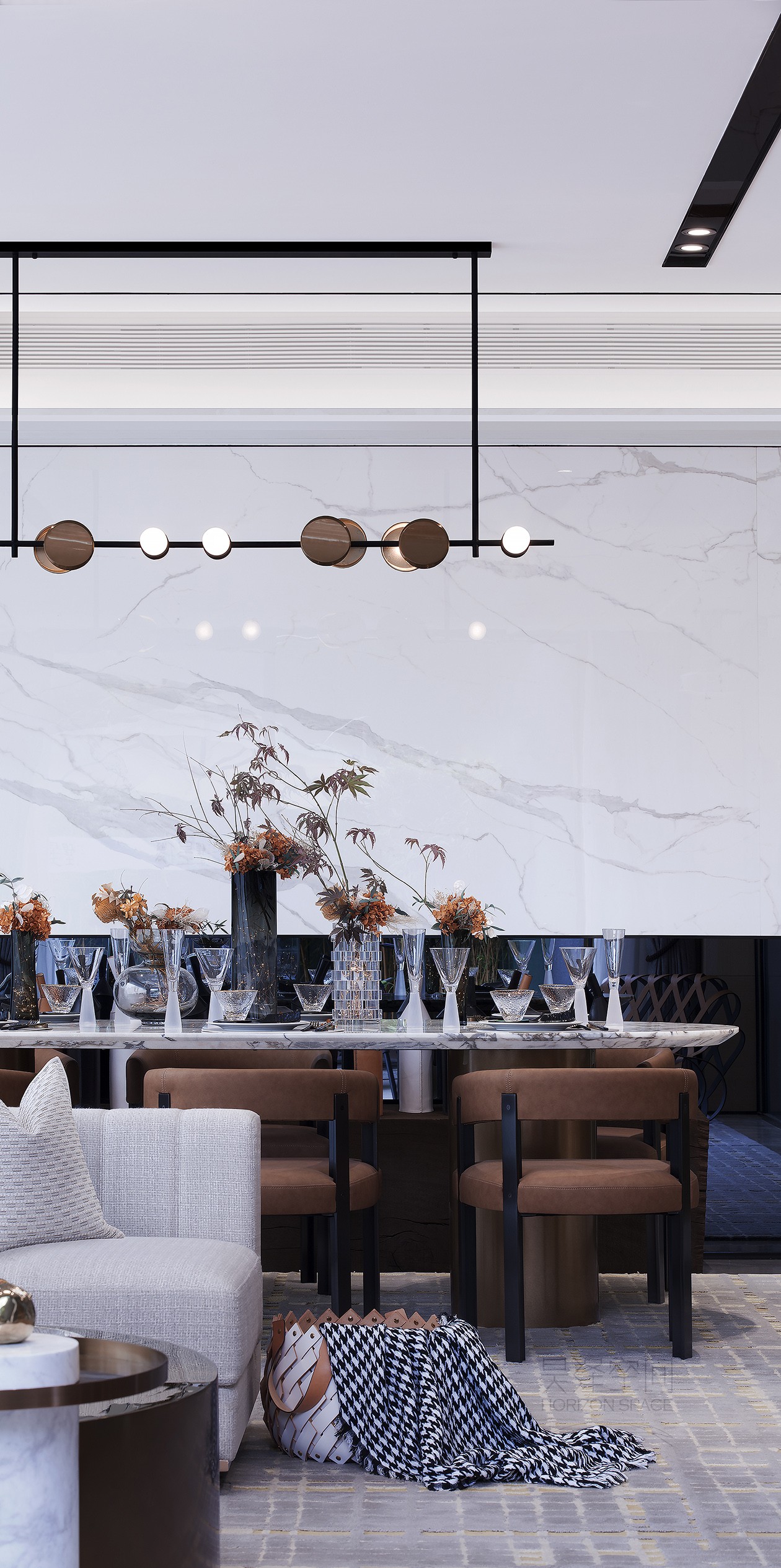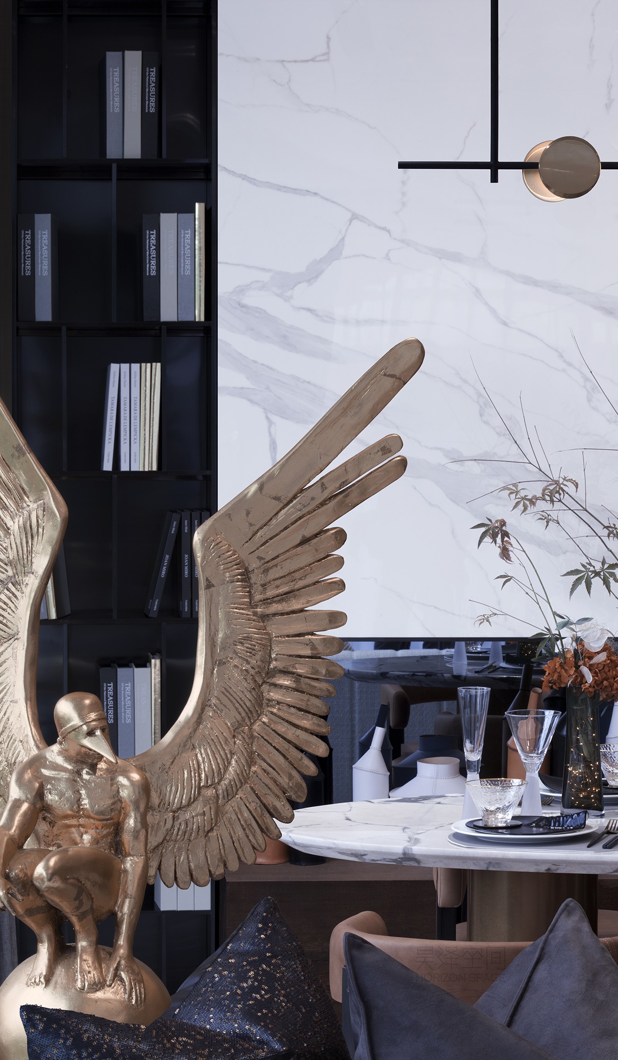 飞行少年艺术雕塑静静的蹲坐在窗边,如静思,如凝望,成为了客餐厅的视觉焦点。