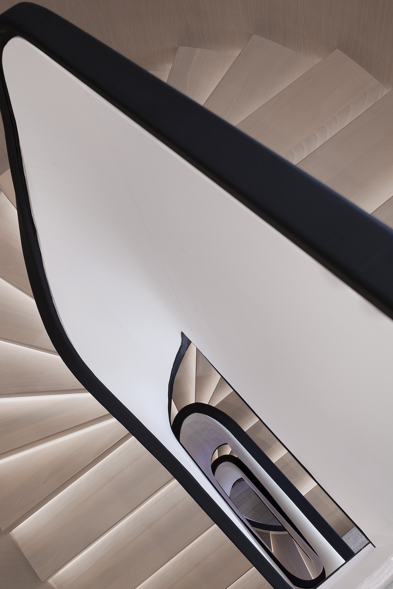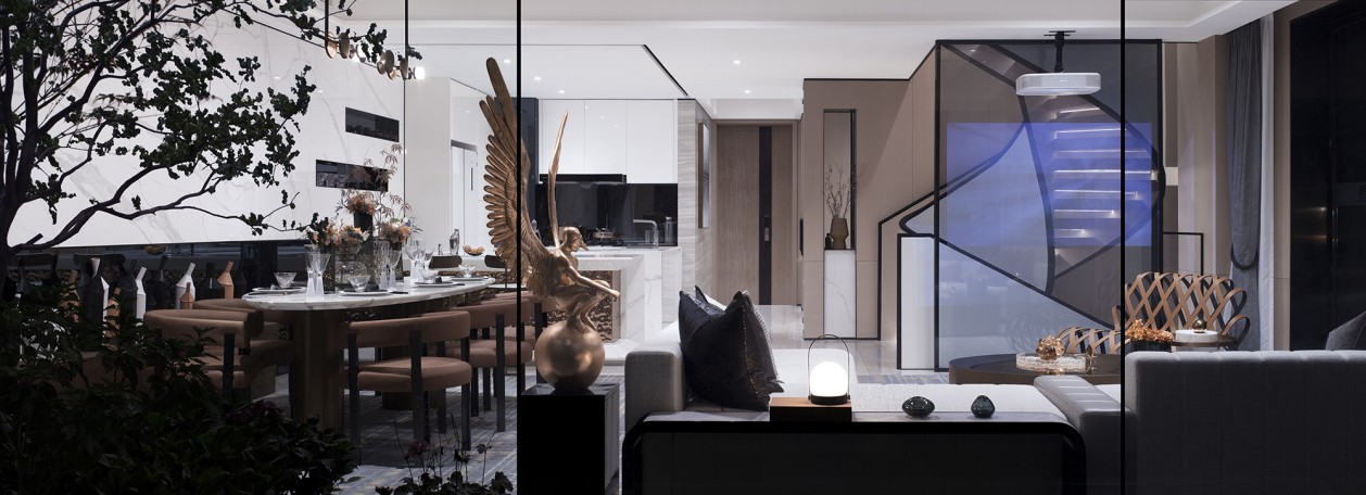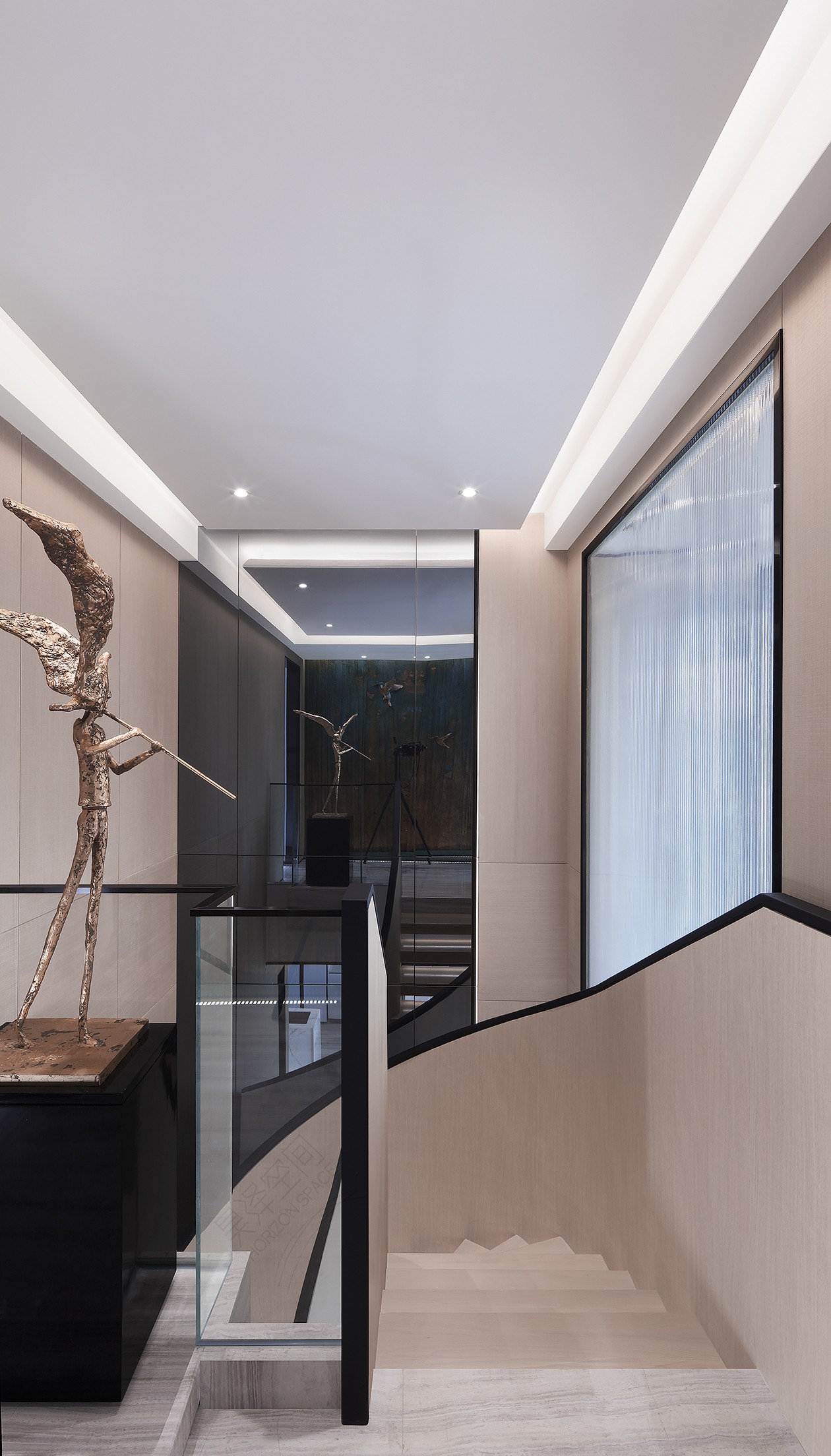 旋转楼梯贯穿整体空间,犹如大型雕塑串联着每层过厅的艺术品,产生趣味性的情景对话:晚色从陌生的树木中走来,像夜间的小路,正静悄悄地听着回忆的足音。
