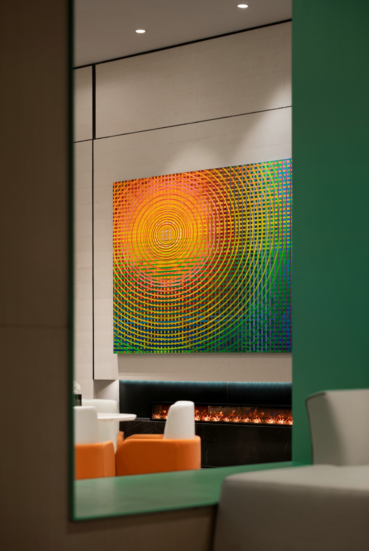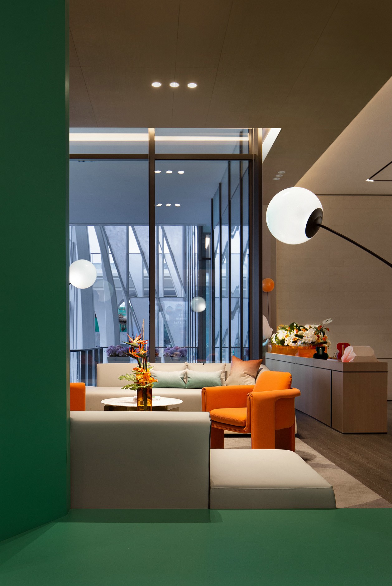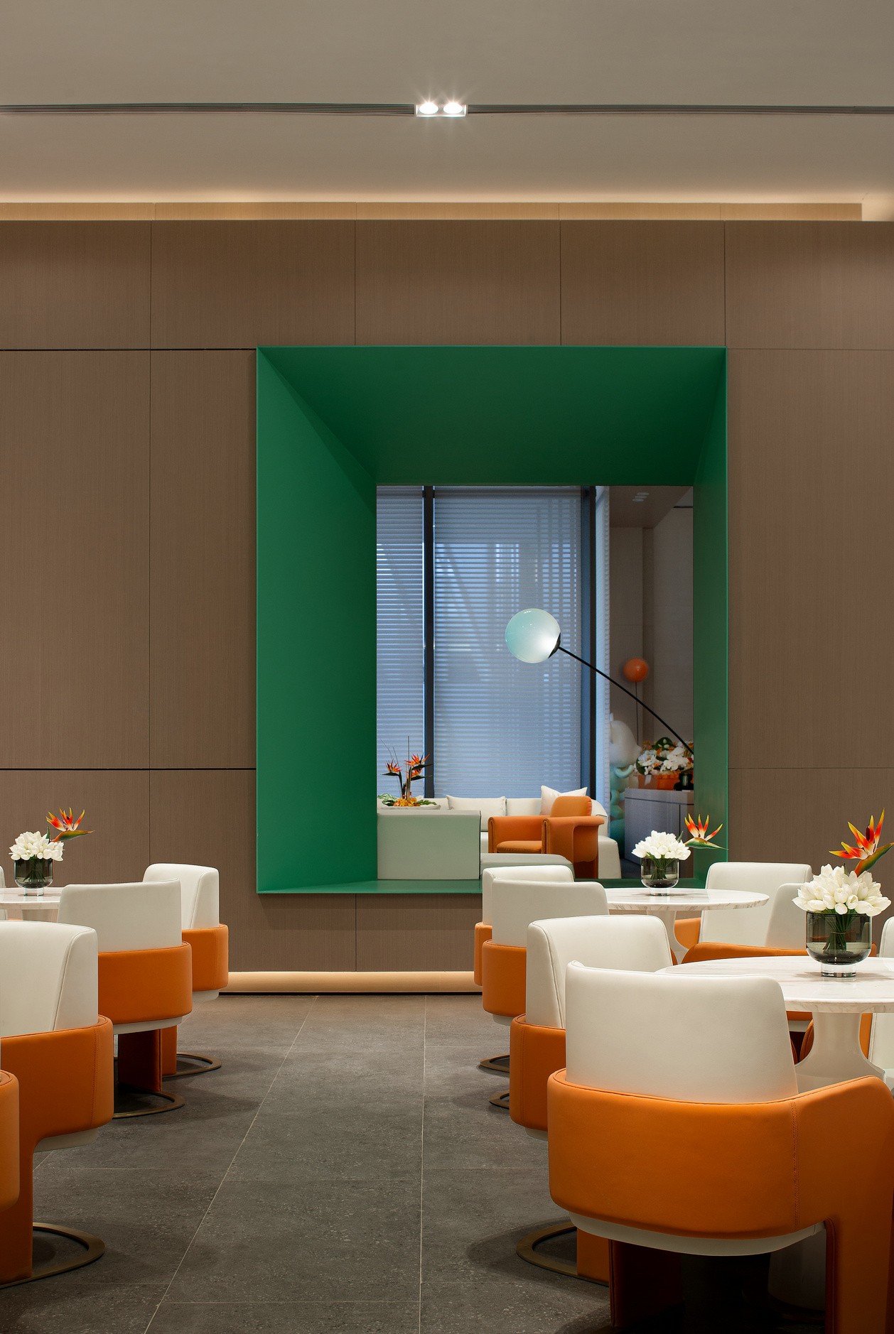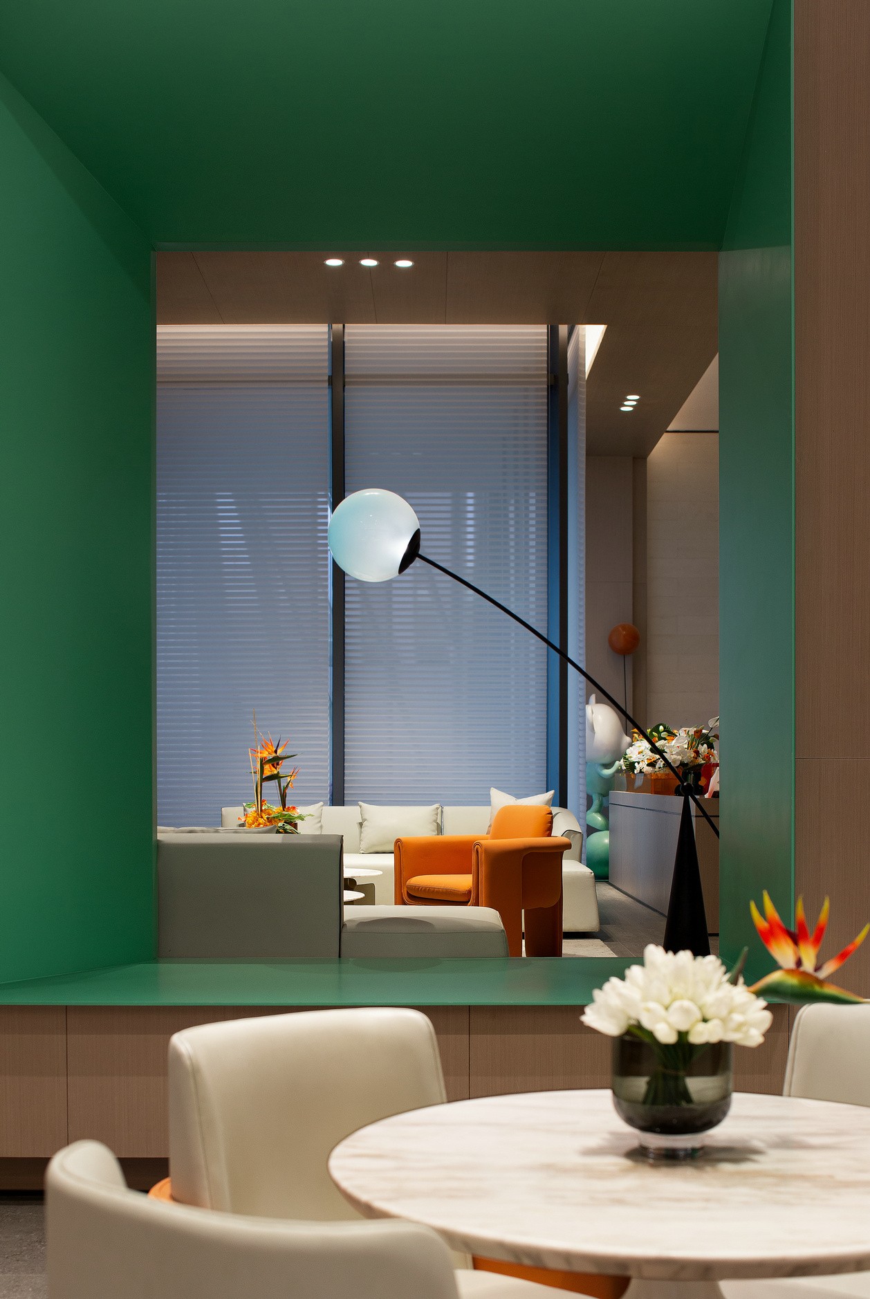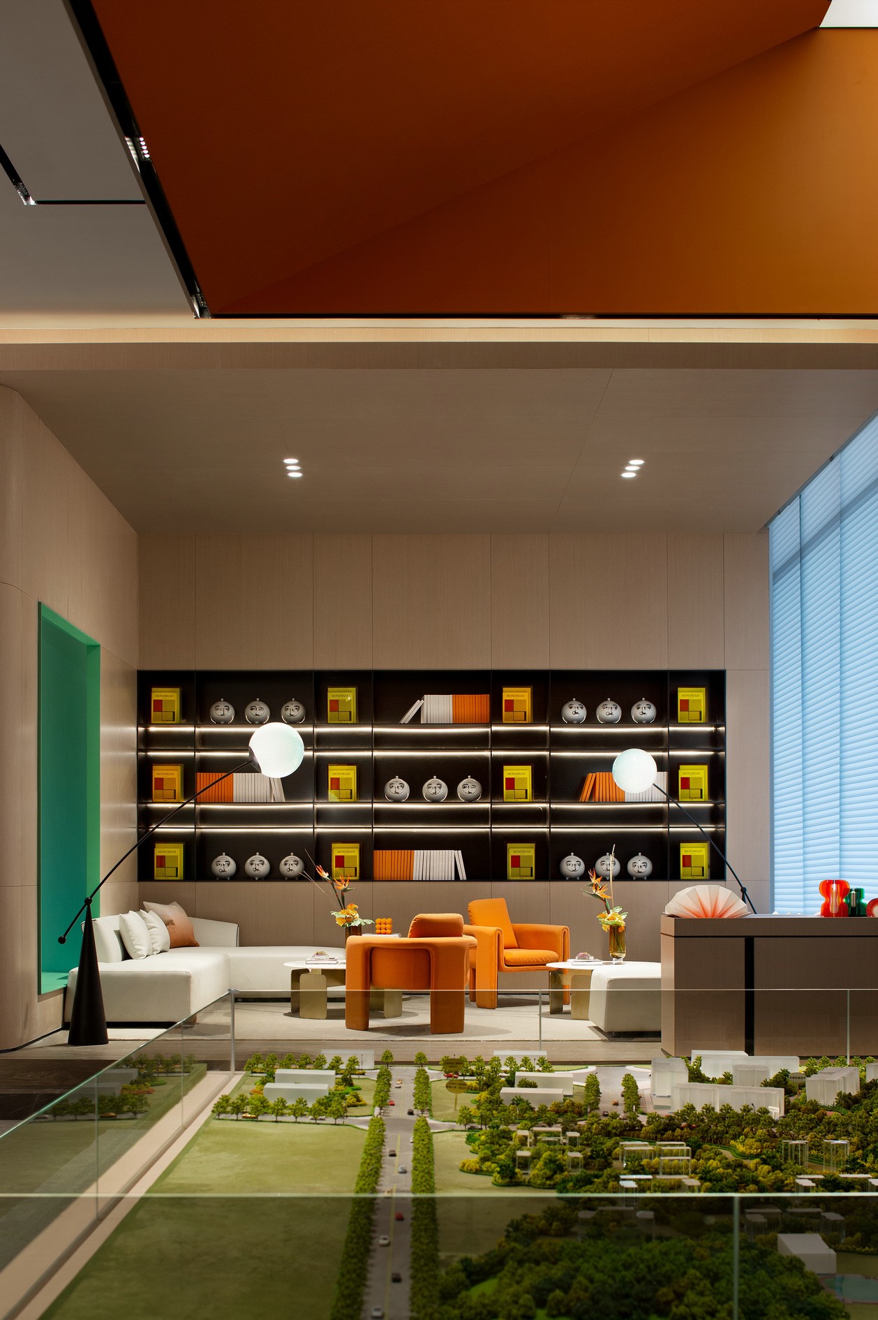 售楼处大堂,设计师用整体思维,将场域领域与文化载体结合,在色彩上运用大面积的橙色和绿色为撞色,通过在视觉上形成冲击以及潮流元素的加入,将本项目呈现出不同场景的沉浸式体验。