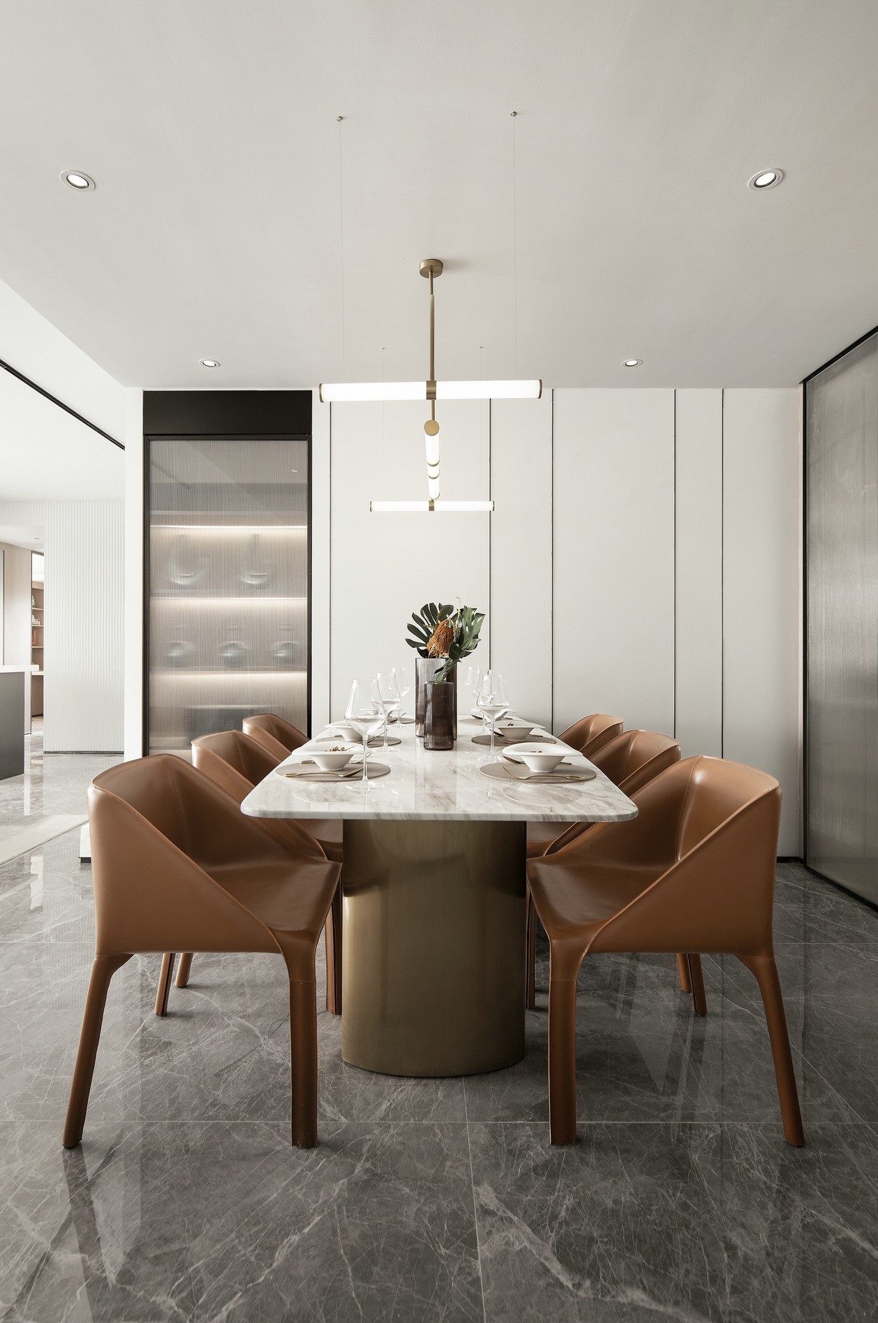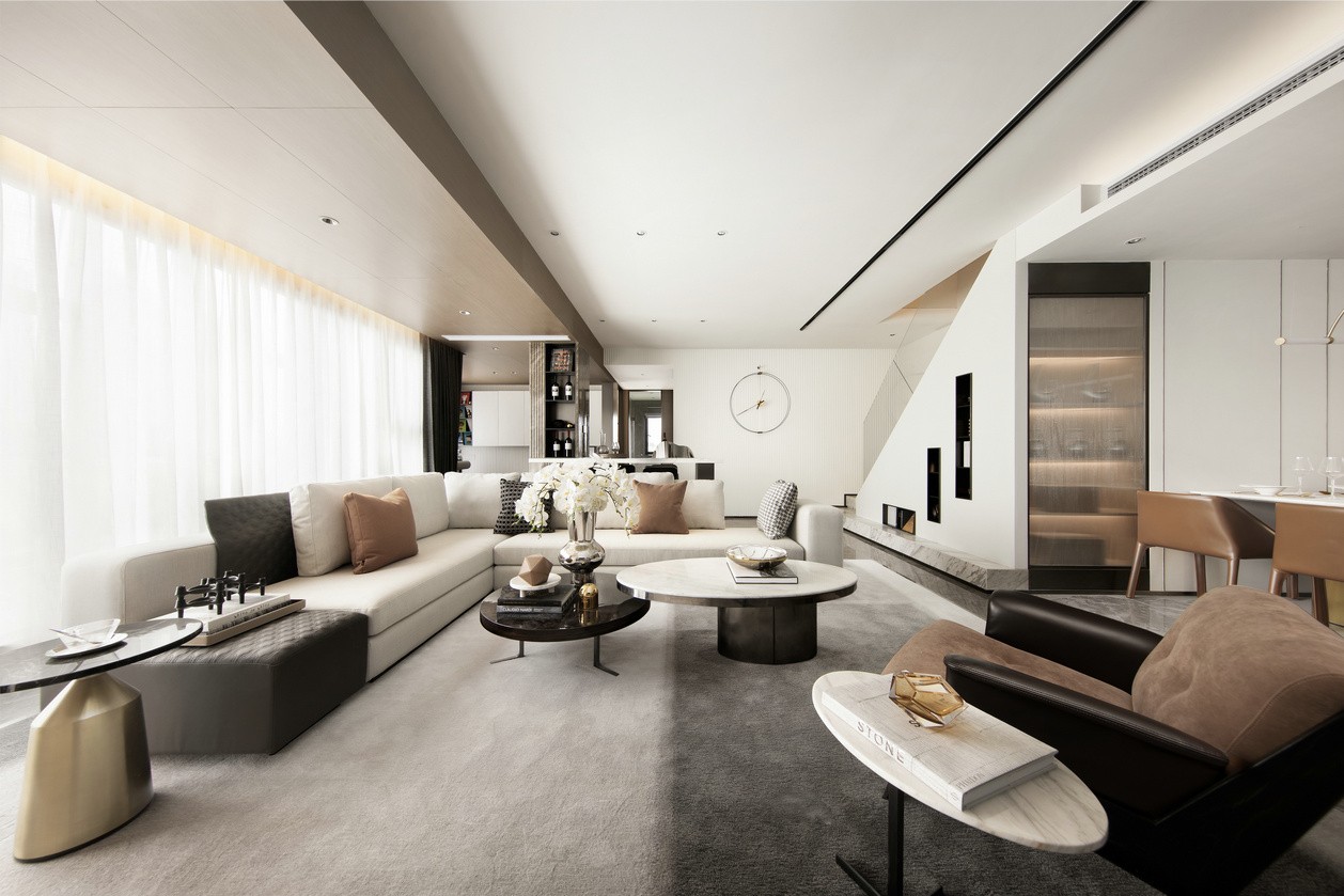 以当下都市生活为出发点,考虑当代精英的生活方式来融入设计品味,大胆尝试与自然共生,探索“看不见的自然”,空间中提取了贵州微地貌设计元素,稳重的气质,重新塑造到空间里,整体空间的氛围接近于山脉沉稳的气息。