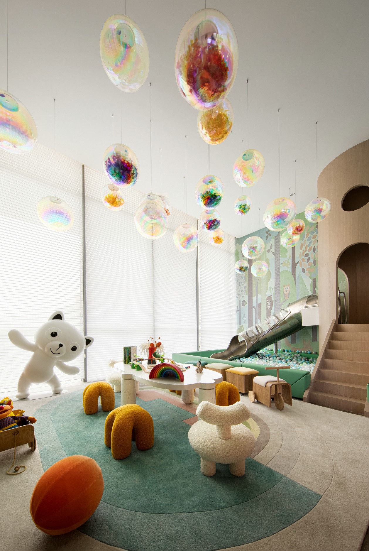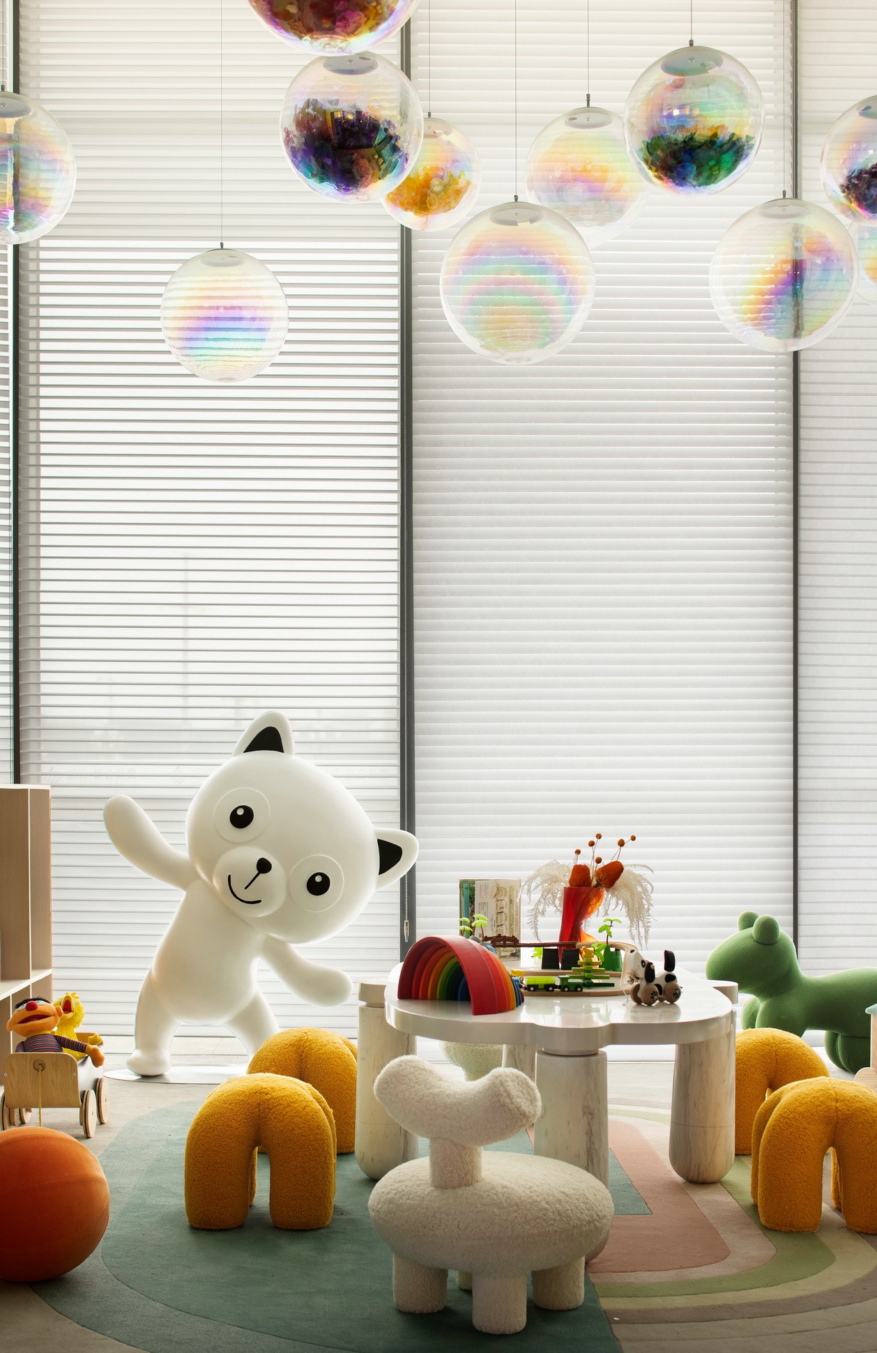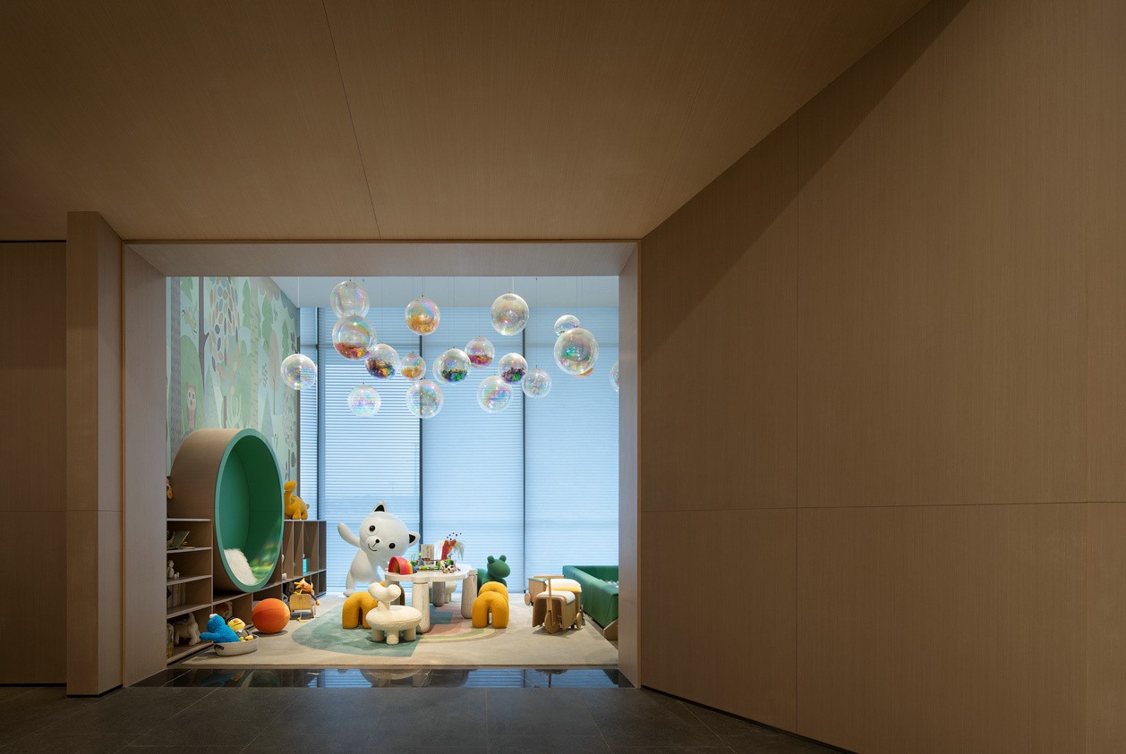 在儿童区的设计中,设计师围绕森林主题营造了一个富有童趣、充满生趣的儿童玩乐区。通过小朋友认识动物与绘画动物的过程来认识大自然的奇妙变化,打造一个互动学习的愉快曼妙空间。