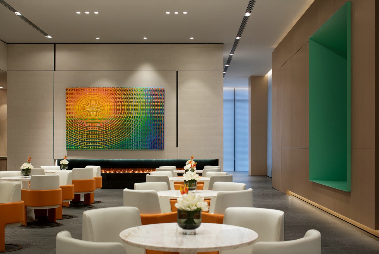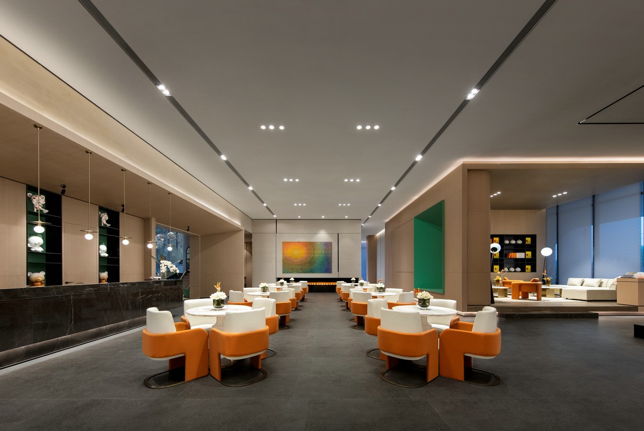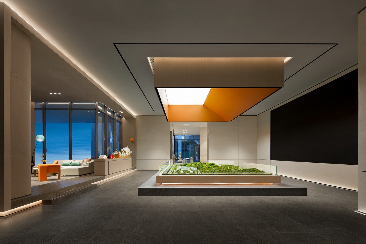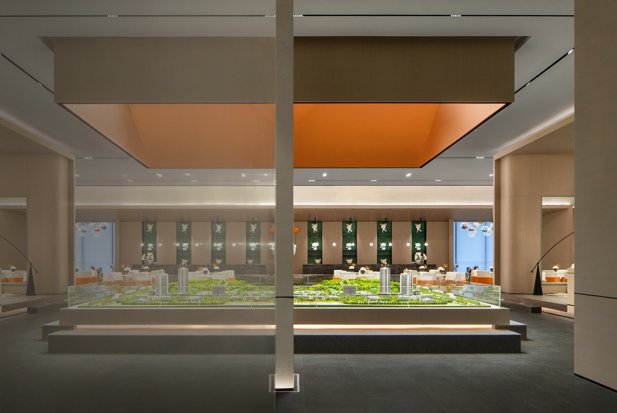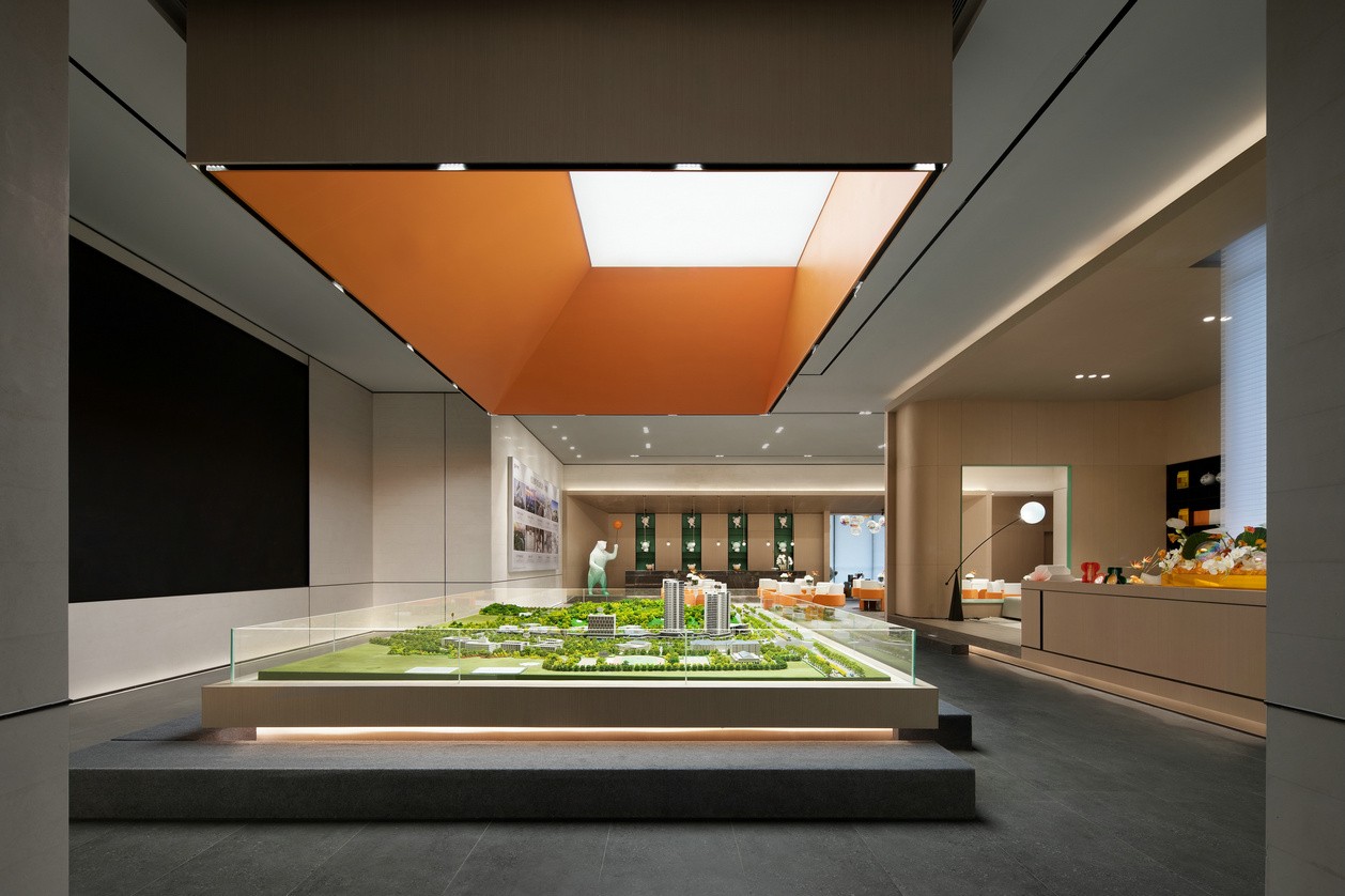 由卡其色托举的沙盘,承载着一个城市的万千气象。天花照灯使用了大面积的橙色,像是暖暖的日光,轻轻照拂在城市的中央,给人生机盎然之感。