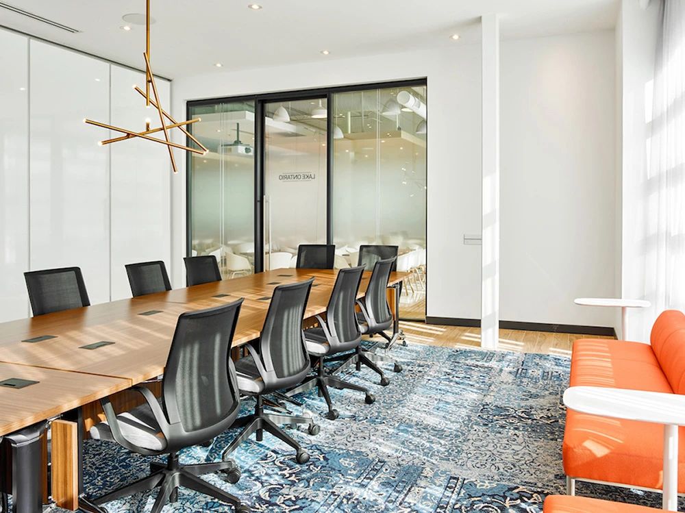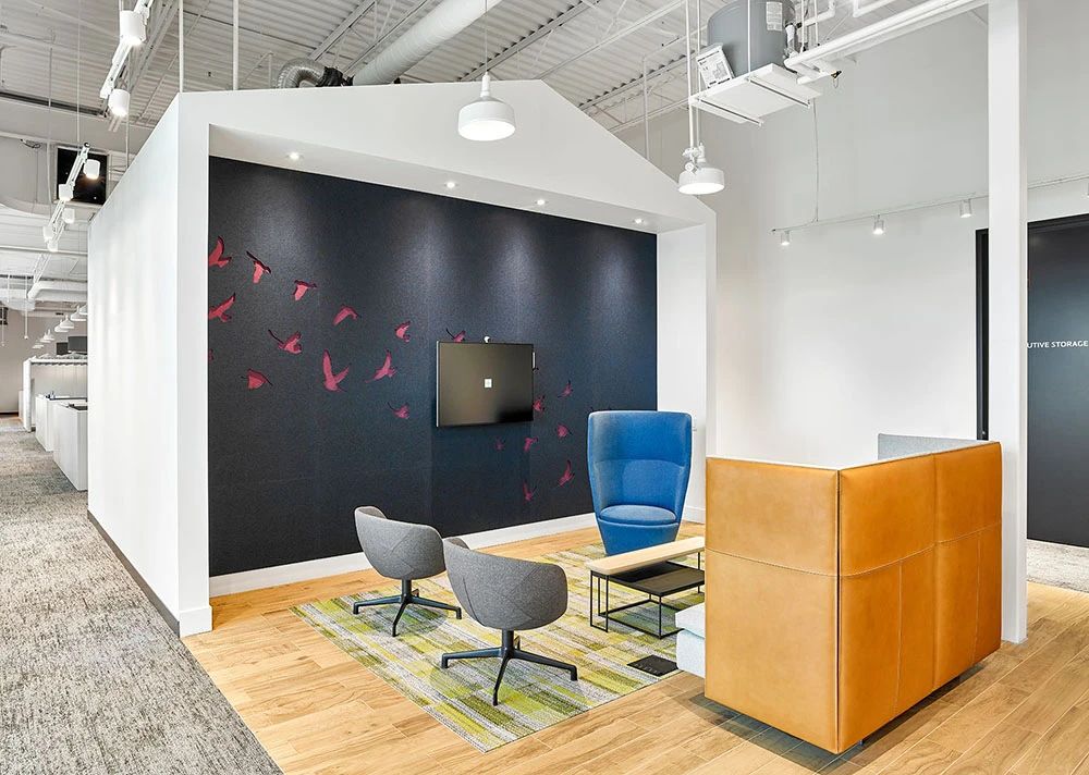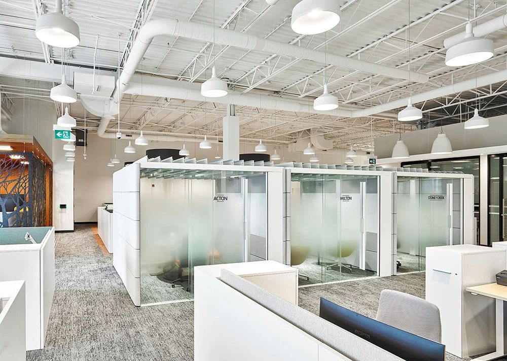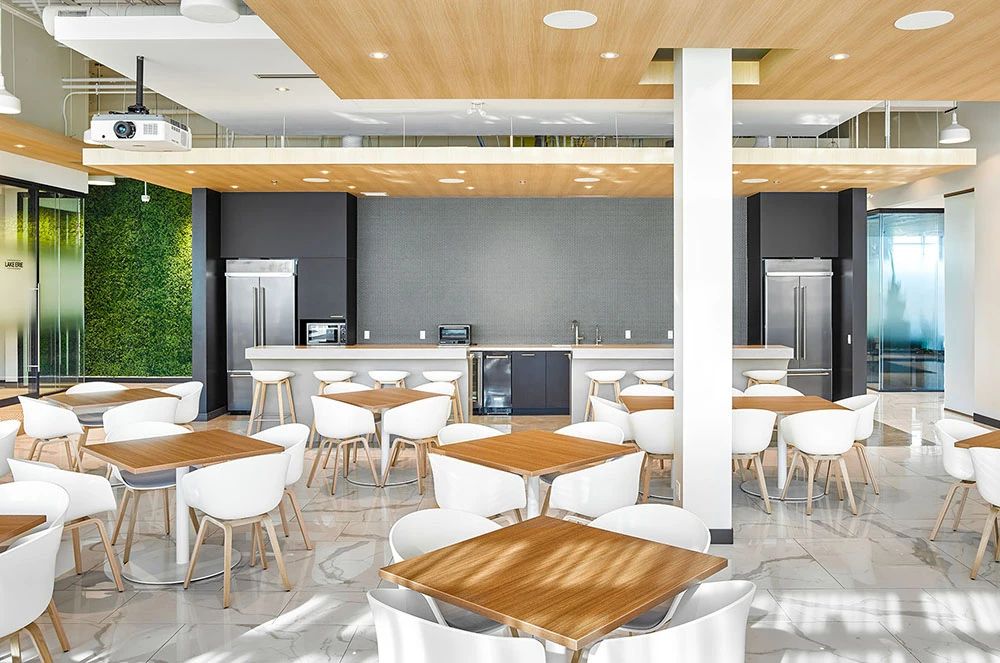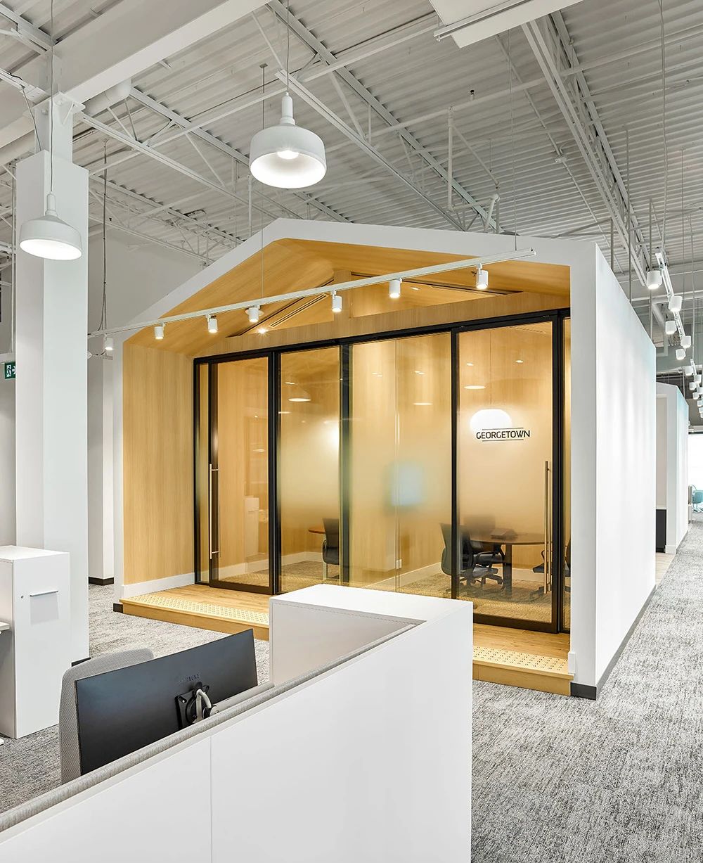 面向公众的设施围绕公共休息“广场”来组织规划,两侧为社区工作空间,如培训室、咖啡吧、接待、会议室和访客会议室等。由于当下COVID-19新冠病毒大爆发,从安全出发公司也实施了远程工作策略,目前约有33%的员工在家或远程工作。本案规划了大量形式各异的会议室(14间,这其中包括三间Steelcase Air3 Acoustic Pods声学舱),旨在为任何类型的会议提供适当配置的设施,并鼓励员工四处走动促进健康的工作方式。