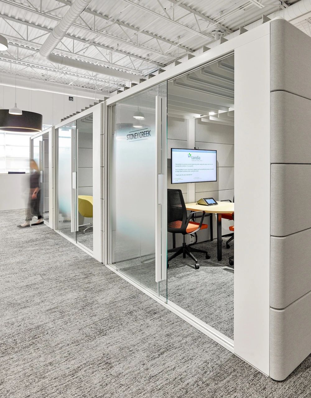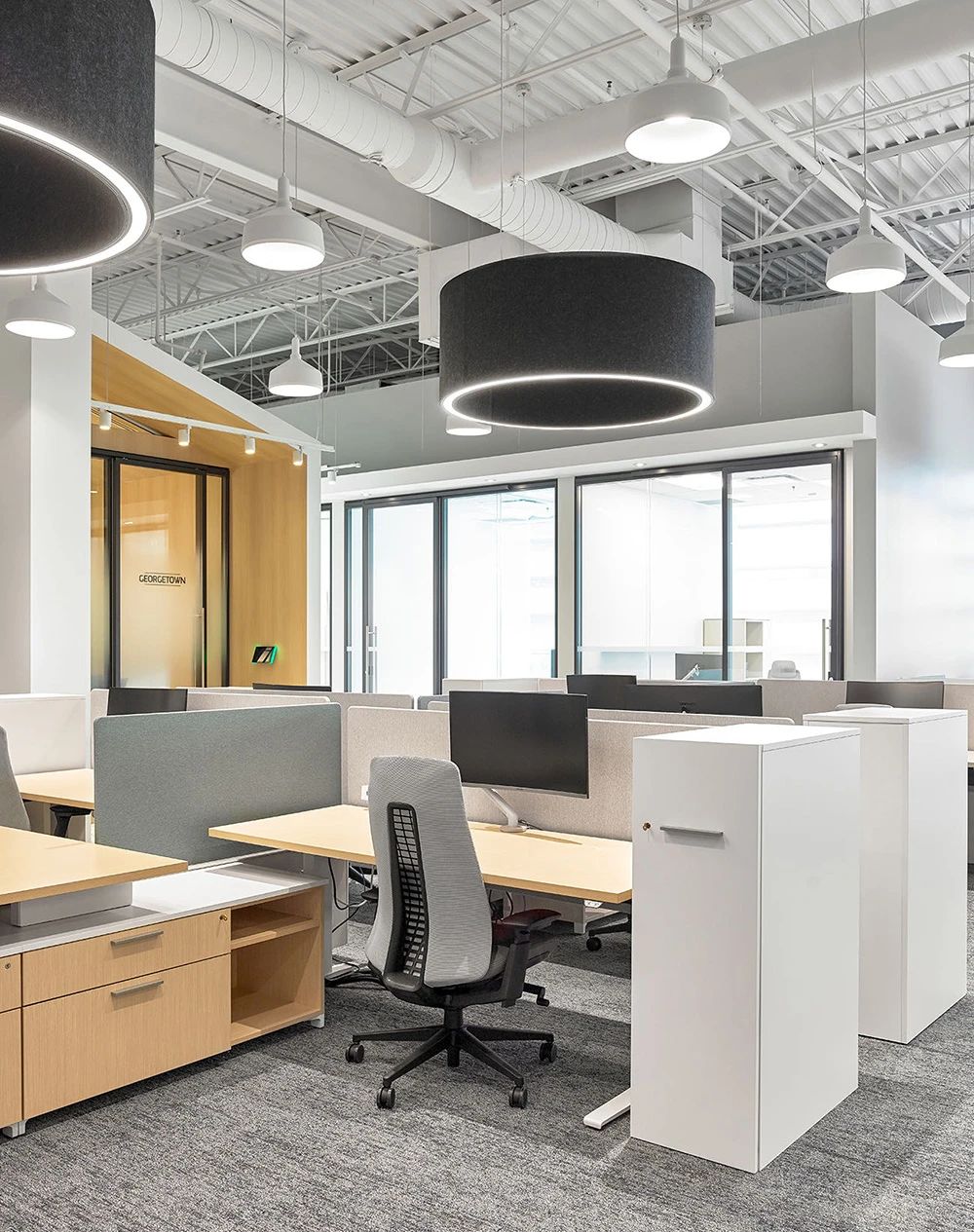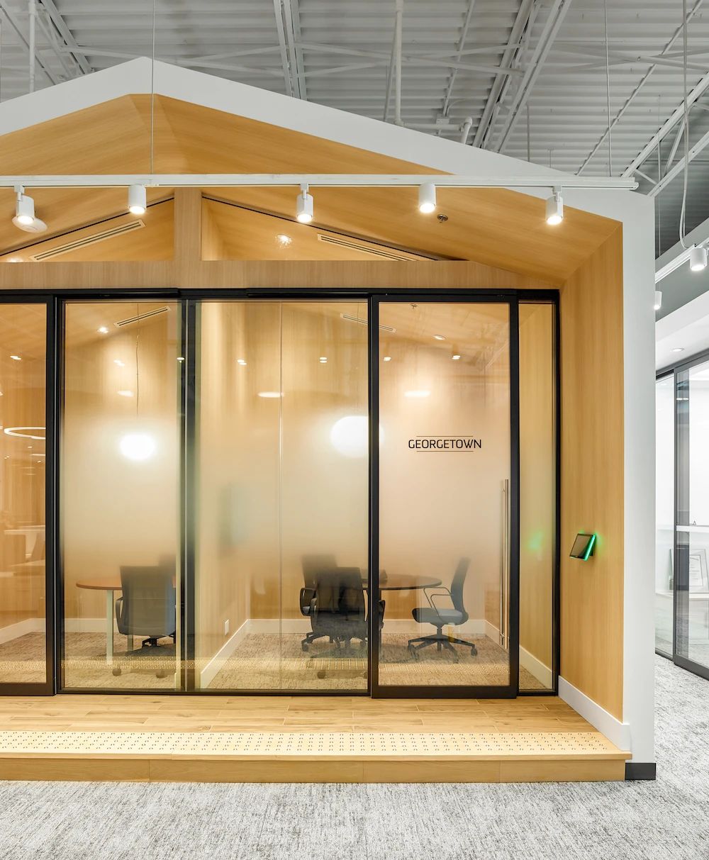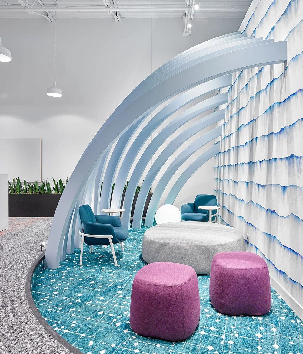 面向公众的设施围绕公共休息“广场”来组织规划,两侧为社区工作空间,如培训室、咖啡吧、接待、会议室和访客会议室等。由于当下COVID-19新冠病毒大爆发,从安全出发公司也实施了远程工作策略,目前约有33%的员工在家或远程工作。本案规划了大量形式各异的会议室(14间,这其中包括三间Steelcase Air3 Acoustic Pods声学舱),旨在为任何类型的会议提供适当配置的设施,并鼓励员工四处走动促进健康的工作方式。