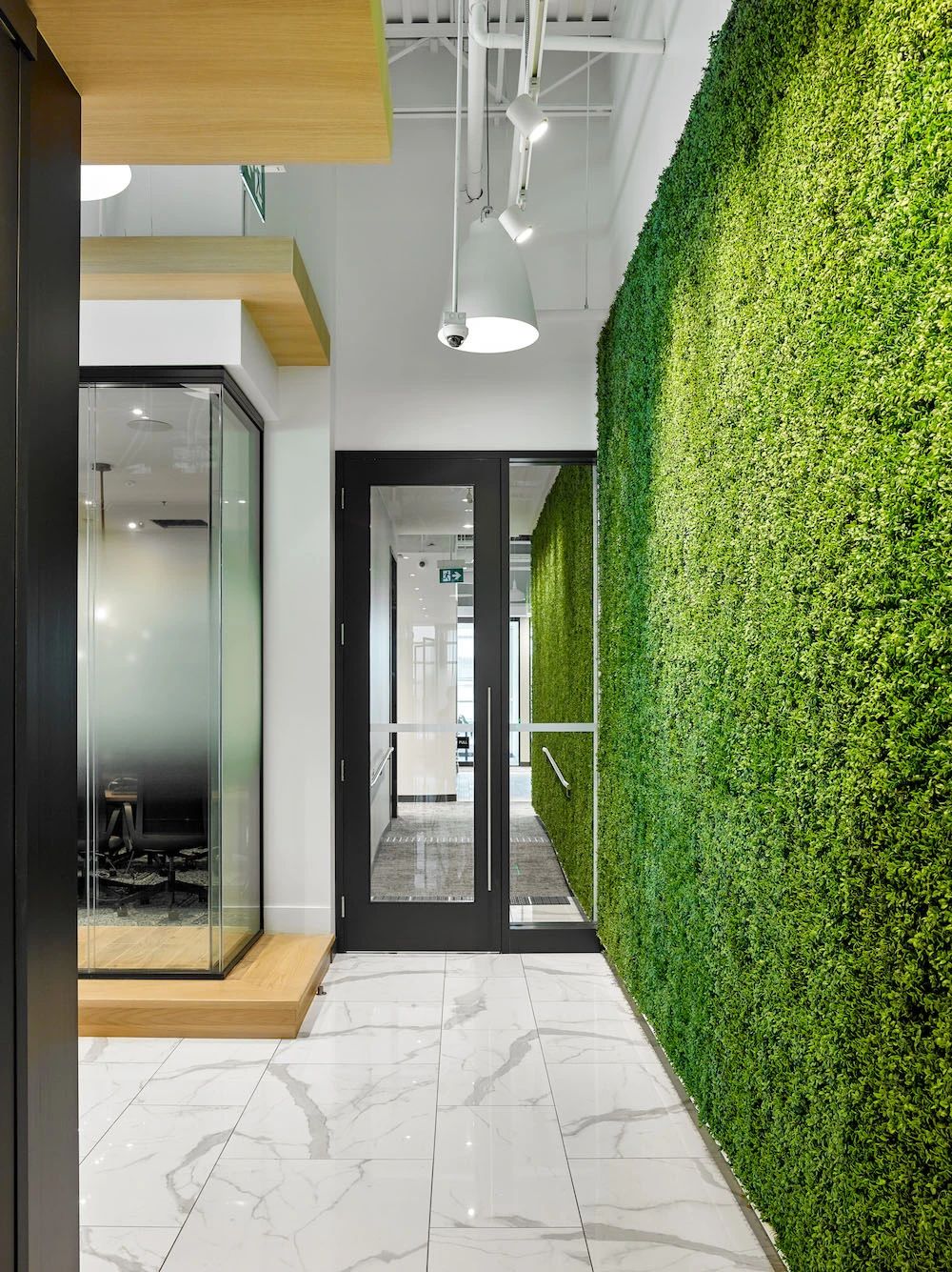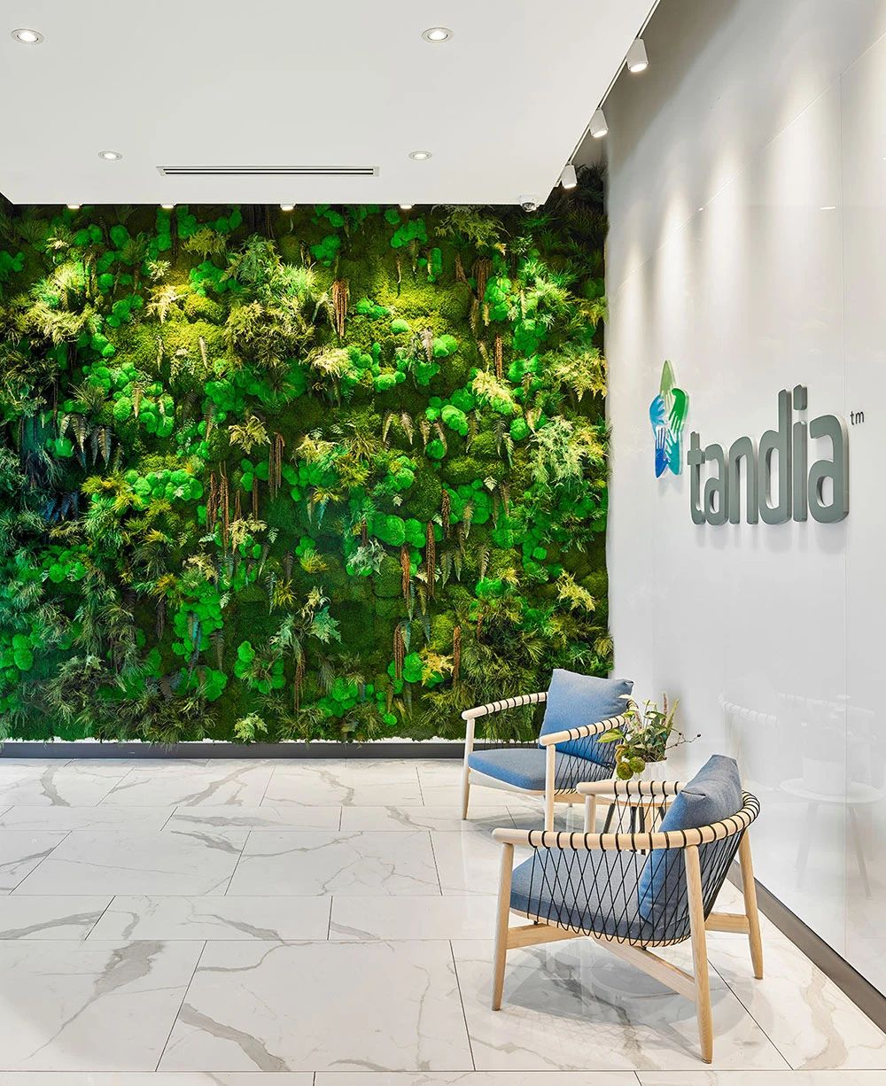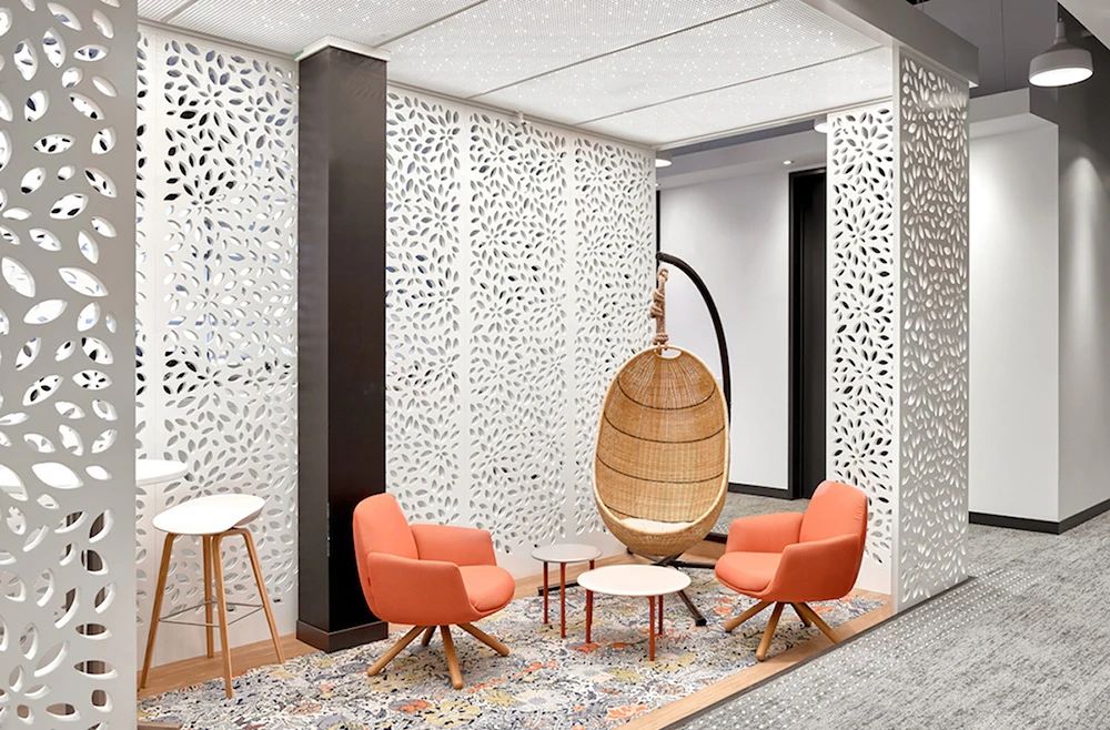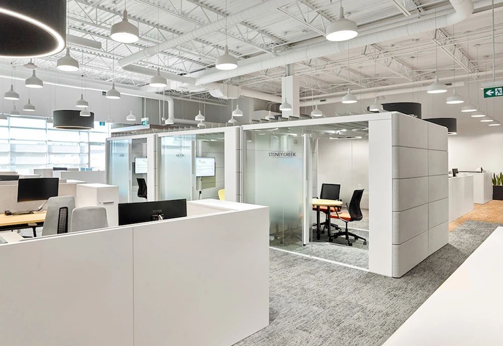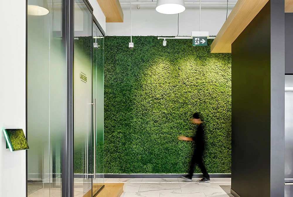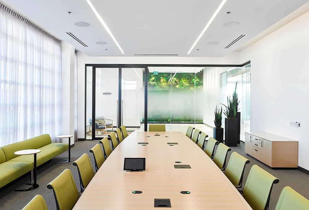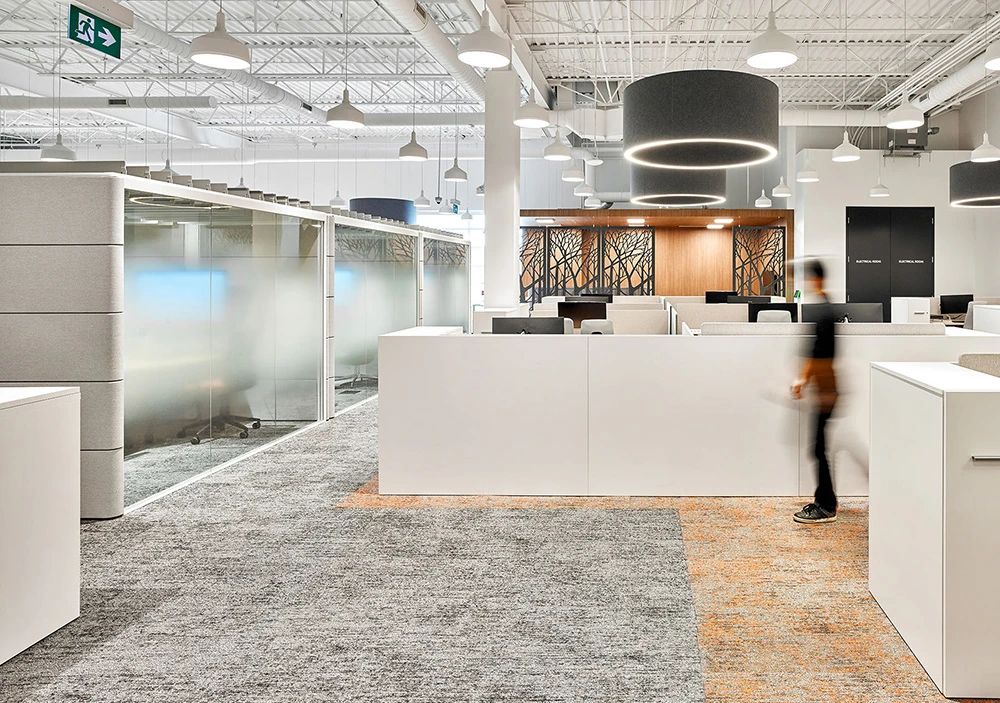 室内地面采用架空活动地板,从而为电缆分布提供最大的灵活性(而不是不太灵活的电缆槽)。此外,开放区的照明设备均为定制,将声学解决方案与LED照明相结合,独具特色的灯具装置缓和了过于开敞的空间感,为员工营造更舒适亲和的工作氛围。整个空间以白色和浅灰色为主背景色,配以温暖的木色和随处可见的大片绿植,在充足的自然光照下人们的愉悦感和幸福感大增,工作效率自然大大提升。