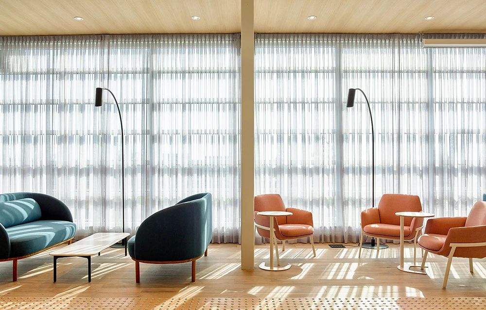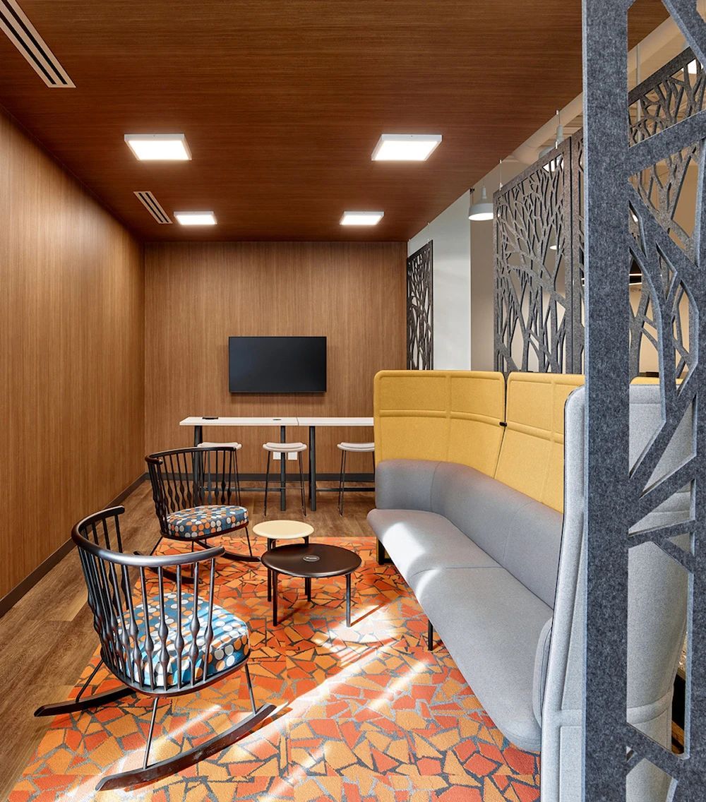 秋季休息室配以Haworth沙发和Andreu World摇椅,以及面向电视的咖啡吧。