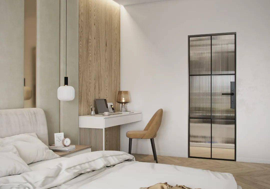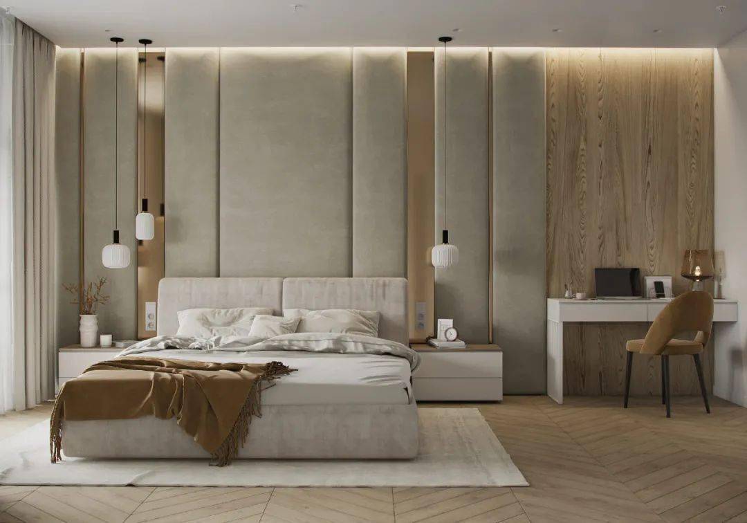 静谧的卧室系统,灰色的软包、金属与木饰面交汇贯通,让墙面有了更丰富的视觉呈现,定制简致的书桌、电视吊柜与梳妆台,与整体风格色调一致,体现定制的不凡。