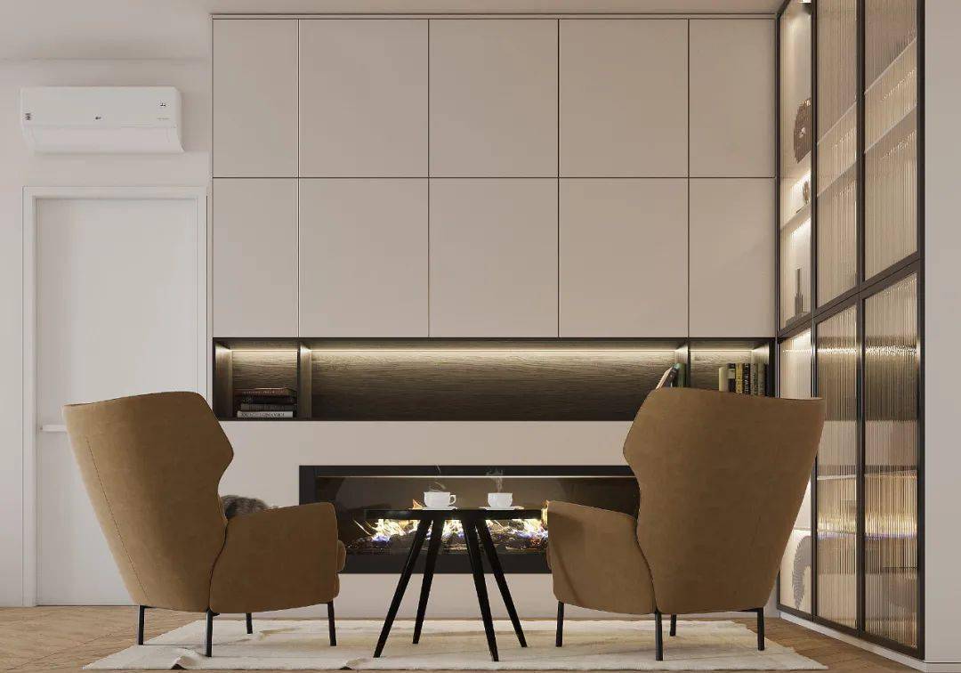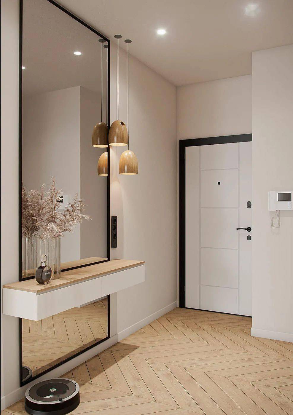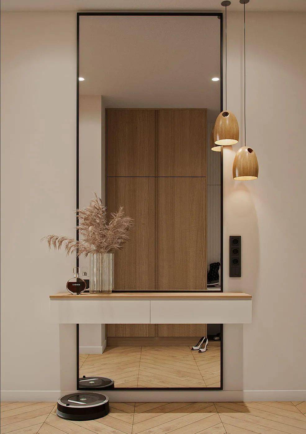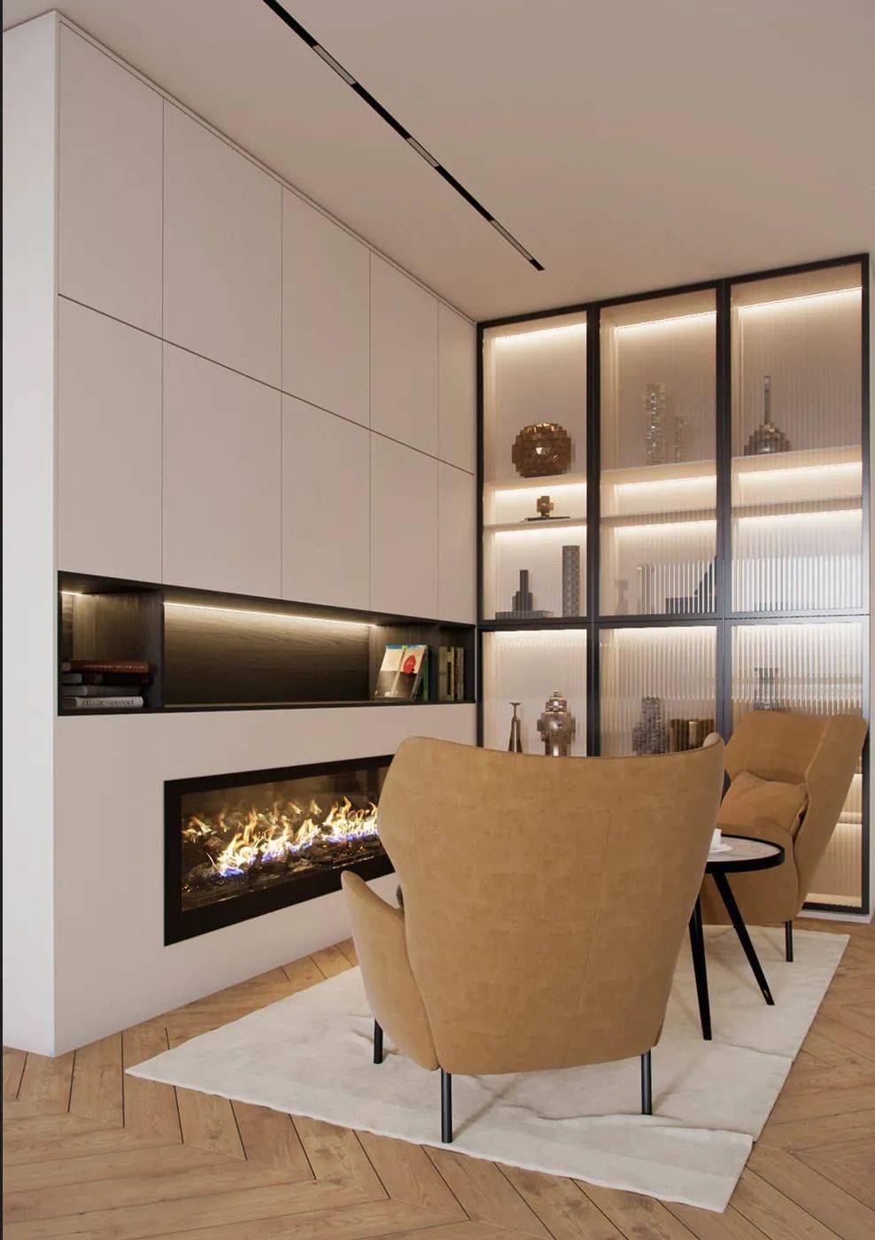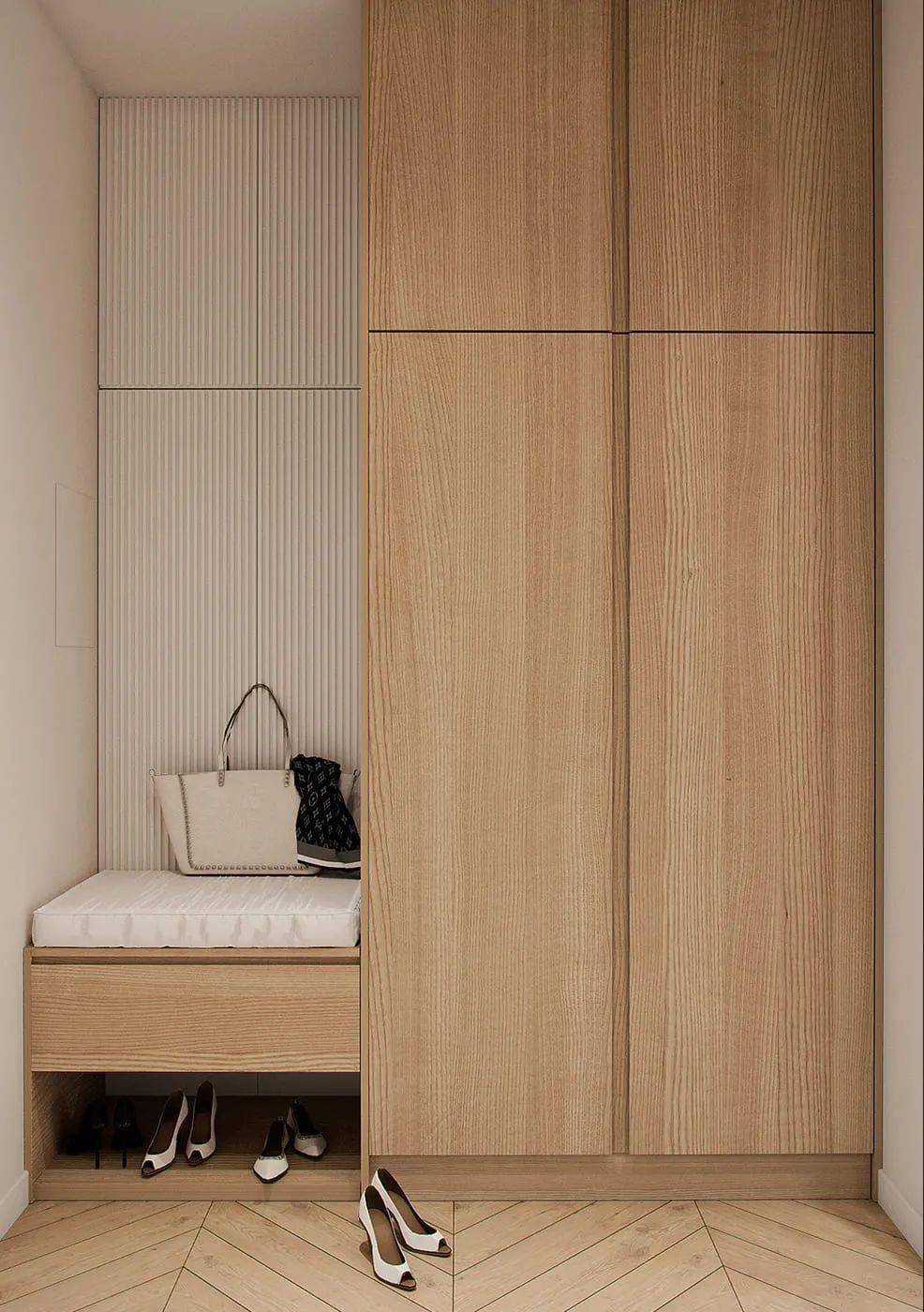 木饰面的包裹,映入眼帘的便是内敛、纯粹的门厅空间,一面及顶的收纳柜延伸至换鞋凳,木纹的丰盈肌理与通透的玻璃,暖灯下将功能与空间美感展现的淋漓尽致。