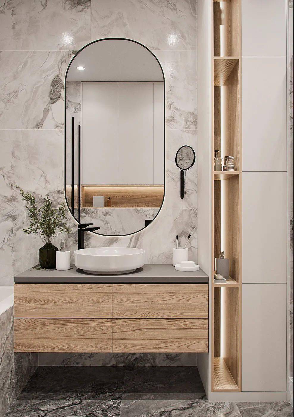 纹理丰富的瓷砖,让卫生间的层次更为立体,简致的木质洗漱台,肤感收纳柜,恬静而清雅,同时增加了收纳空间。