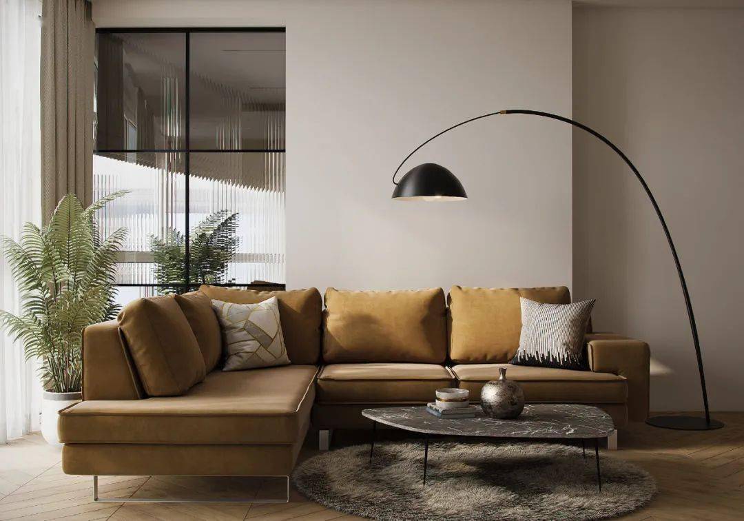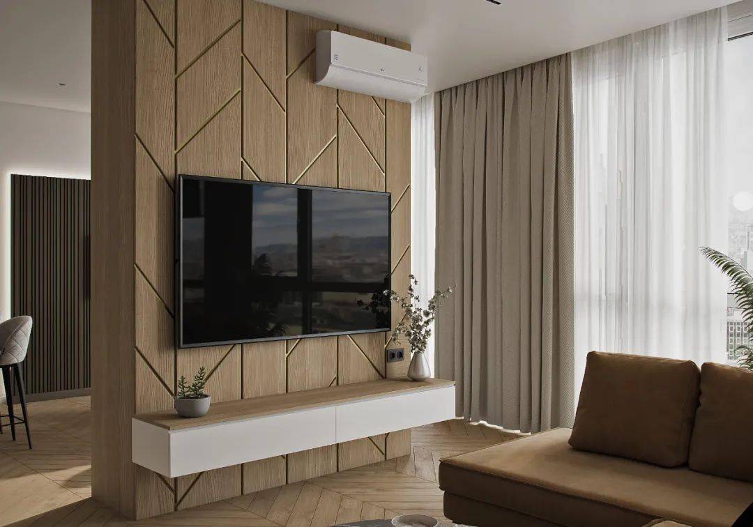 极简原木风客厅,鱼骨拼接地板与原木电视背景墙相互交织,将清爽与舒适揉合,嵌入黄色的沙发,构筑起一方闲适而自然的温情空间。