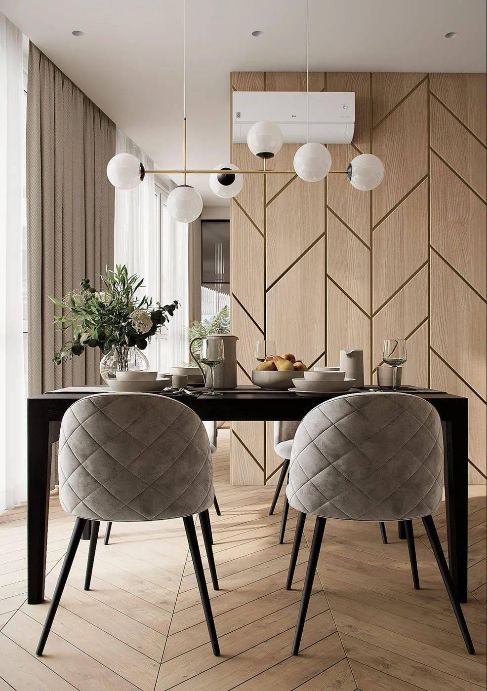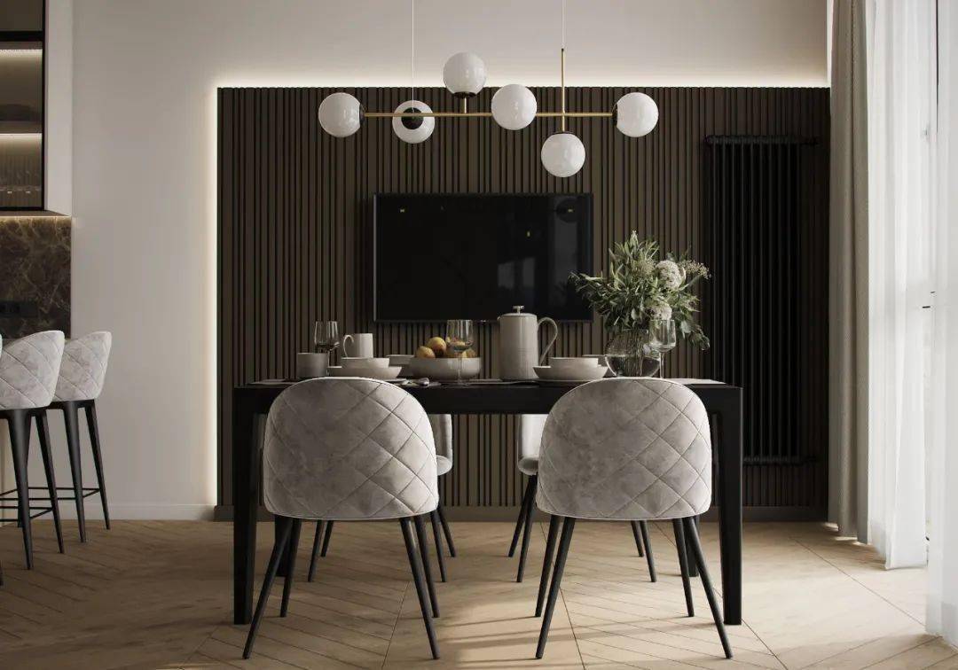 木、栅格,由墙、餐桌再到地板层层递进,堆叠出清雅的餐厨系统,辅以自然的色调与自然光的渲染,交汇出温馨的用餐氛围。