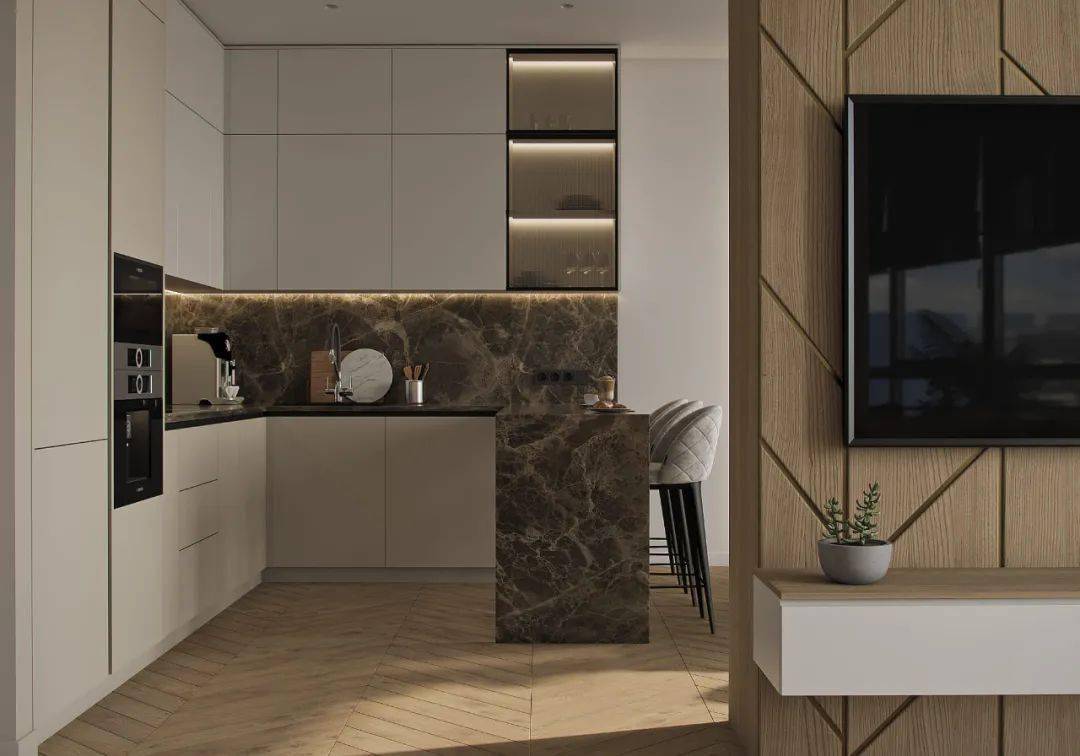 在白色肤感饰面的视觉引导下,延展出轻简的橱柜系统,无把手的立面与内嵌家电设计,让空间变得更加舒朗、简雅,岩板台面延伸出用餐吧台,展现出自在又舒适的生活之美。