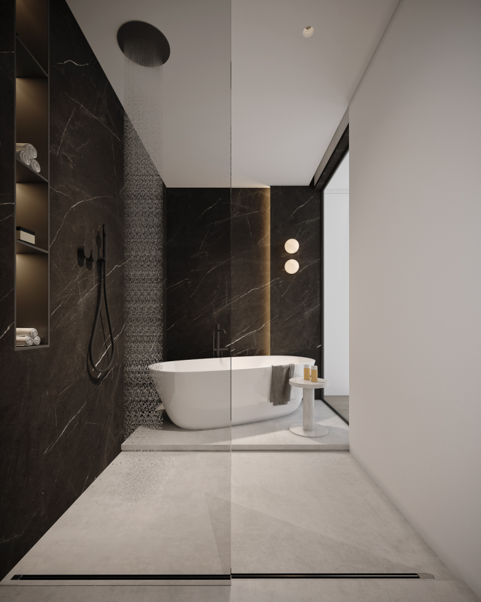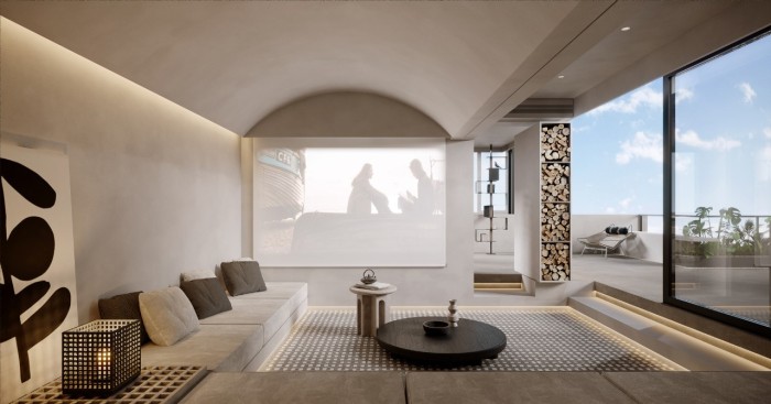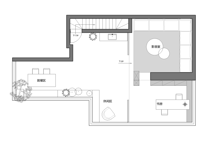 顶层的露台在原有的影音室的区域里,打造出一块全景视野的书房区,下沉式的影音室通过隐藏的灯光处理,更显静谧安逸,同时可以和书房形成互通,共享室外的自然风光。