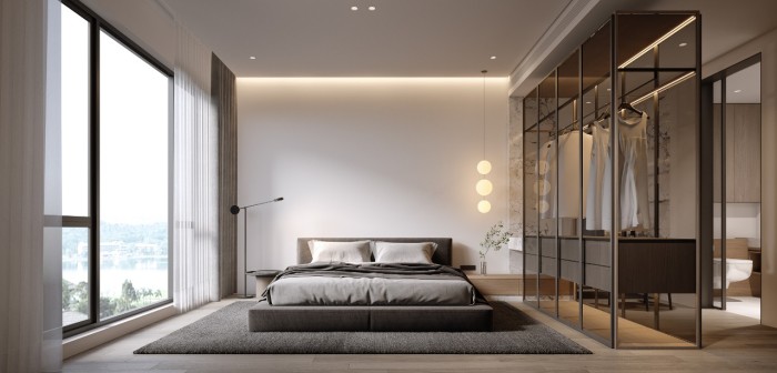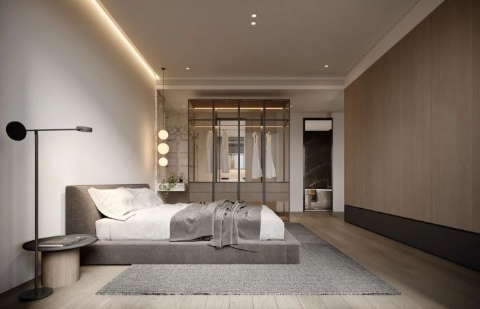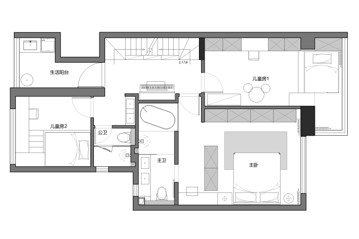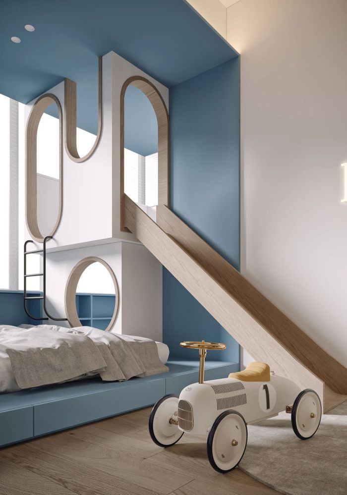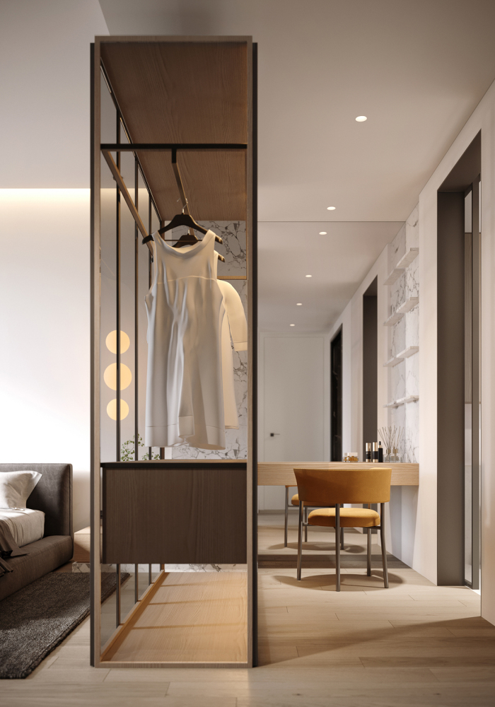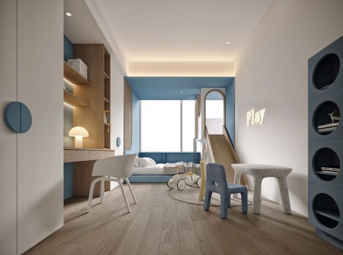 二层主卧将床头柜和梳妆台做了链接与穿插,再用一组玻璃衣柜将空间区域进行划分,空间也被无形的放大开来,男孩房将室外阳台纳入到房间中,特别搭建的小木屋,满足了小朋友好动的天性,可以肆意的玩耍和安静的阅读,有一片独享的私密区域。