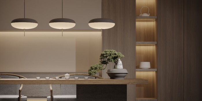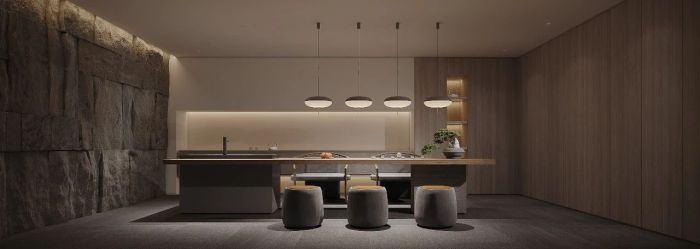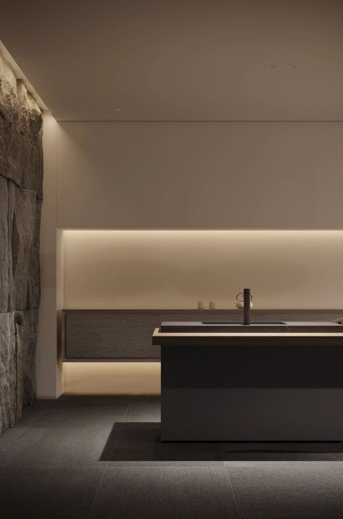 负一层作为亲朋好友聚会的场所,打破原有的阻隔,将空间融会贯通,简约的茶室中置入一面粗粝的原石背景墙,形成鲜明的对比,空间沉稳又富含律动,同时大面积的木色储物柜也隐藏其中,更显一份自然感。