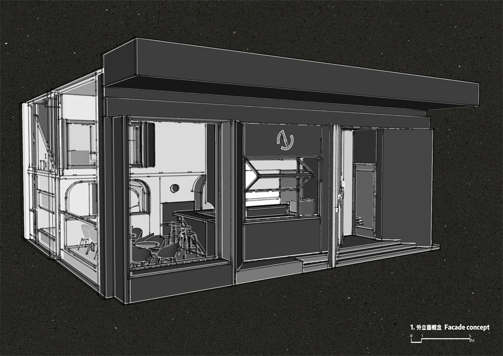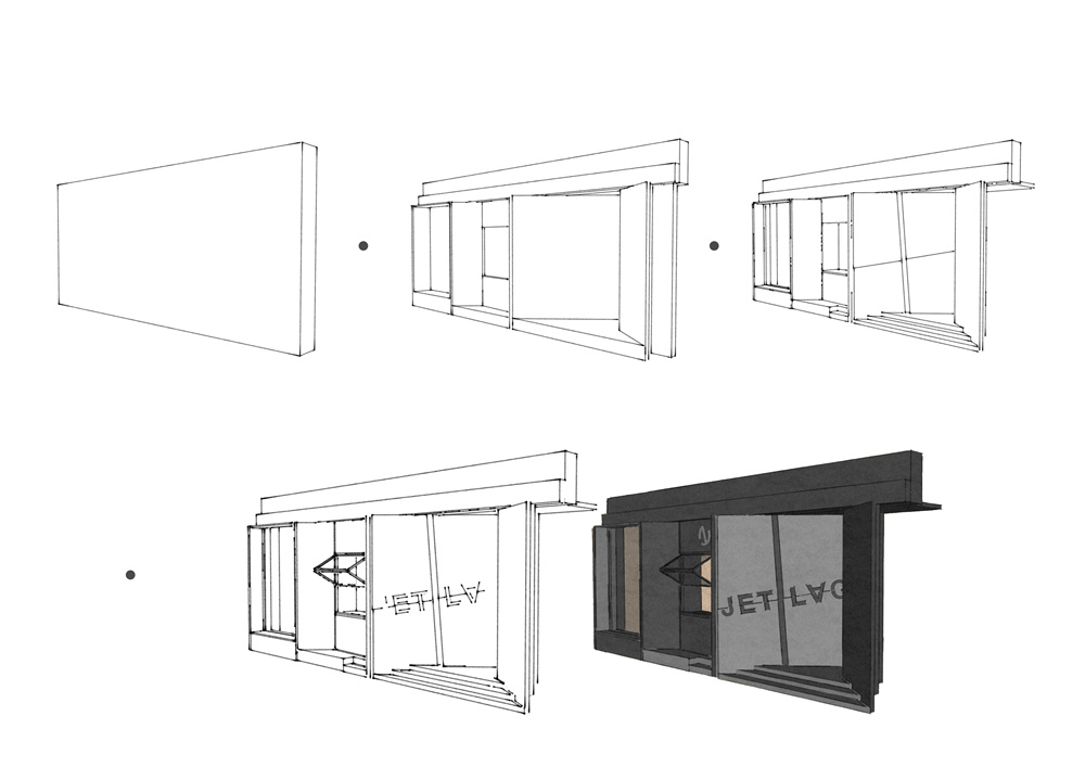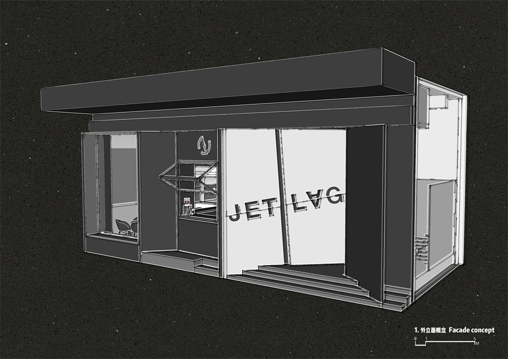 前区部分:将水吧区中置,利用两边的空间设置入口与餐区功能。收益于中置水吧区把外卖窗口设置在门面的中心区域,门面两边则利用几何形态的手法设置不规则的LOGO墙体与幕墙玻璃。