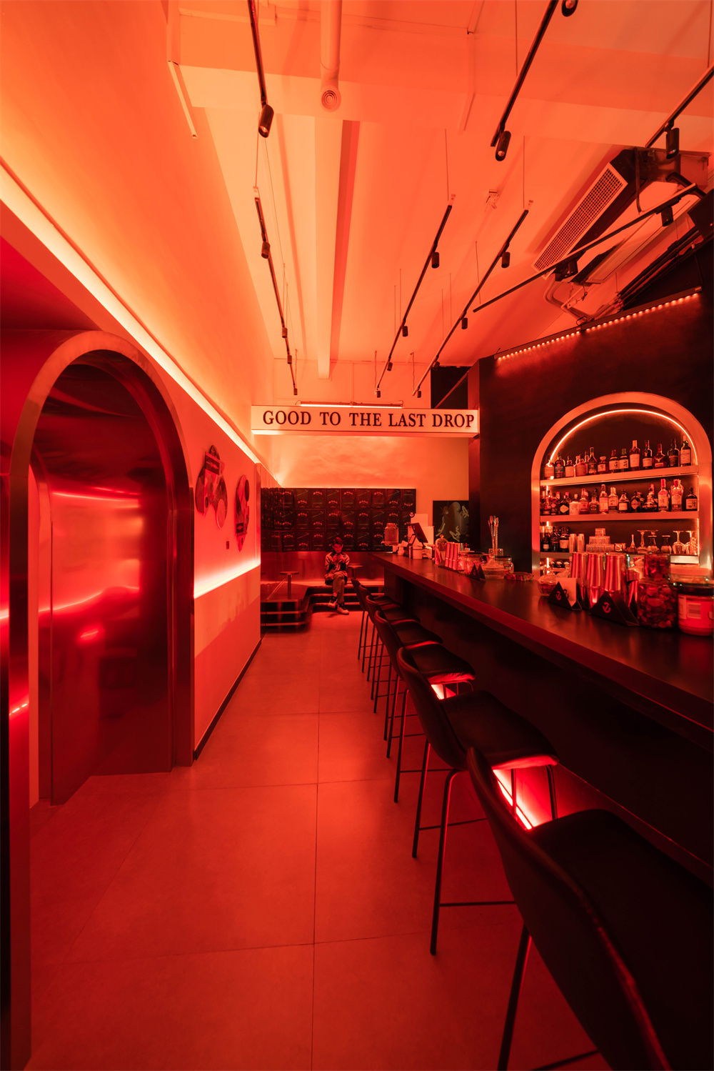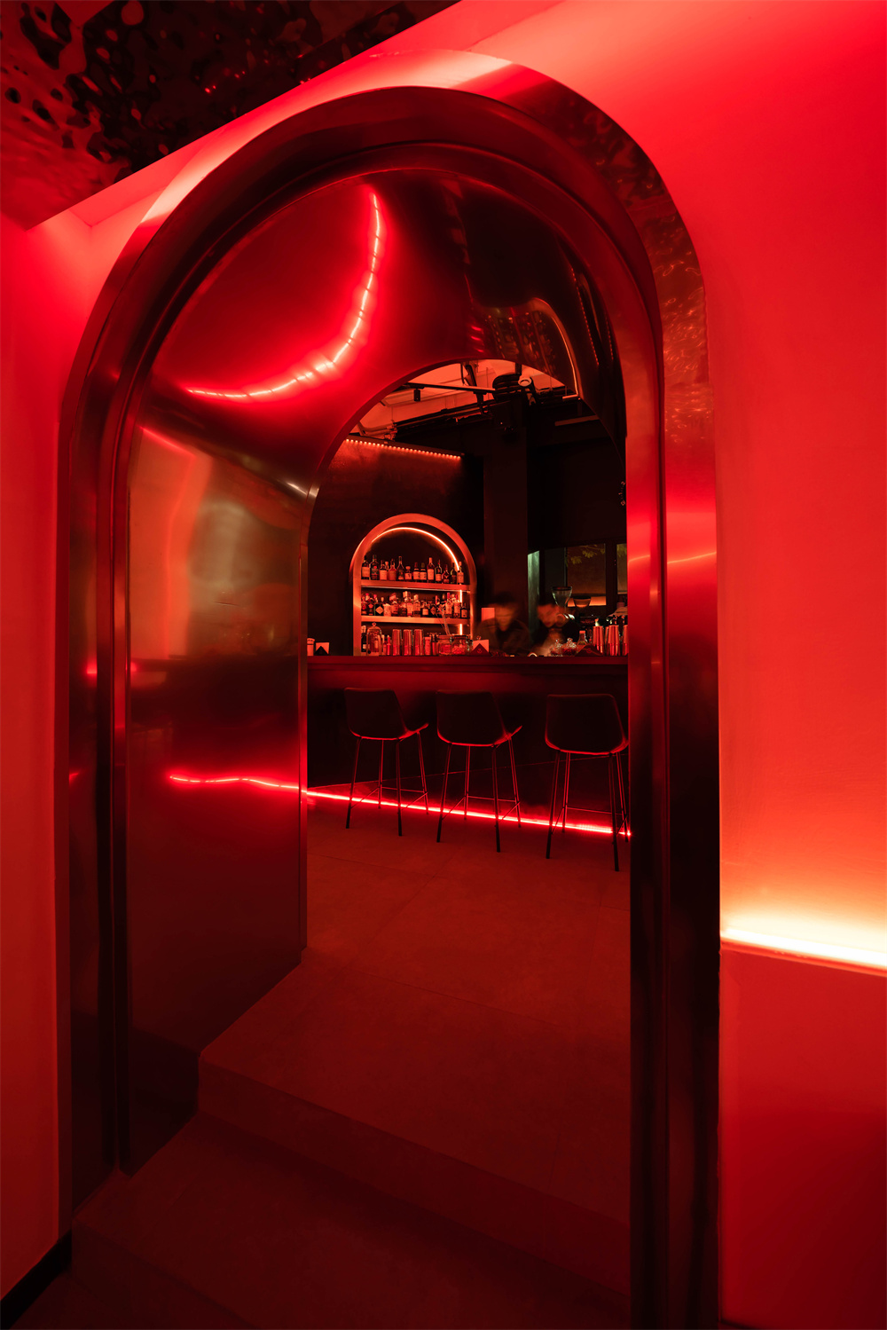 前区与后区的连接部分:利用拱形门洞与艺术卡座的组合从前区(高)过渡到后区(低)的空间,通过灯光与材质上的搭配令连接处的过渡不在单一,营造空间的整体感。