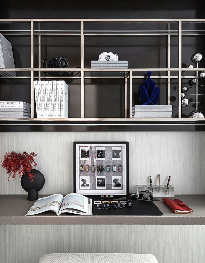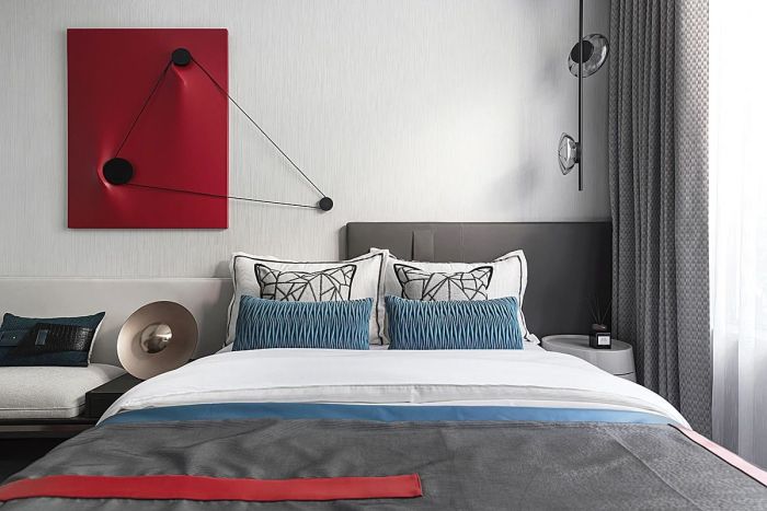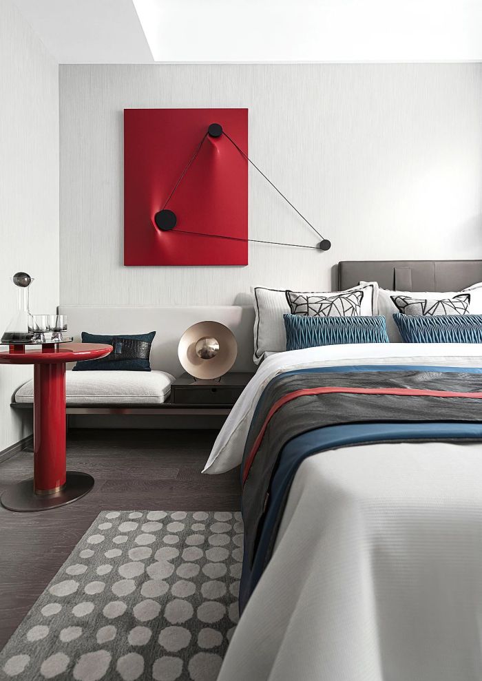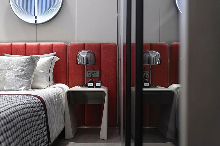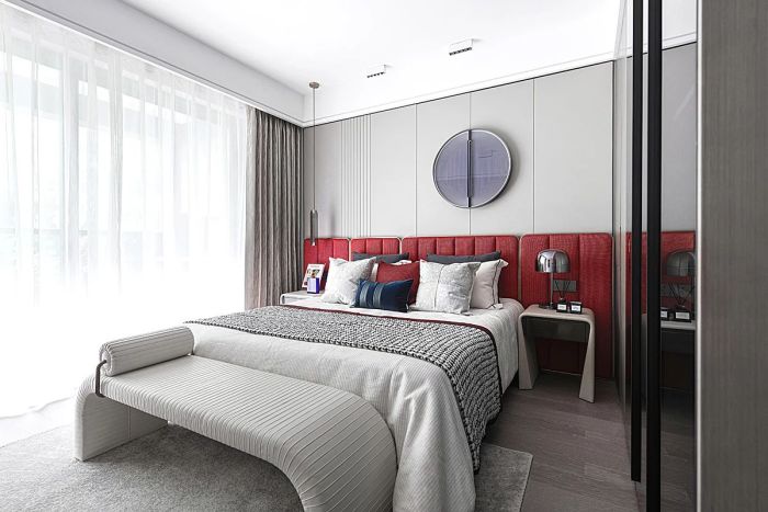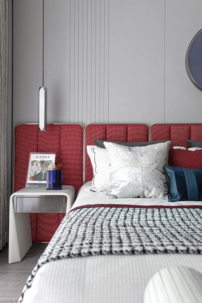都是对生活品质的解读。大面积的推拉门设计为主卧带来饱满且充足的自然光线。两侧的金属床头灯与红色背板将思绪带回Retro Age,简约的造型与色彩和谐混搭,形成独有的复古风格。