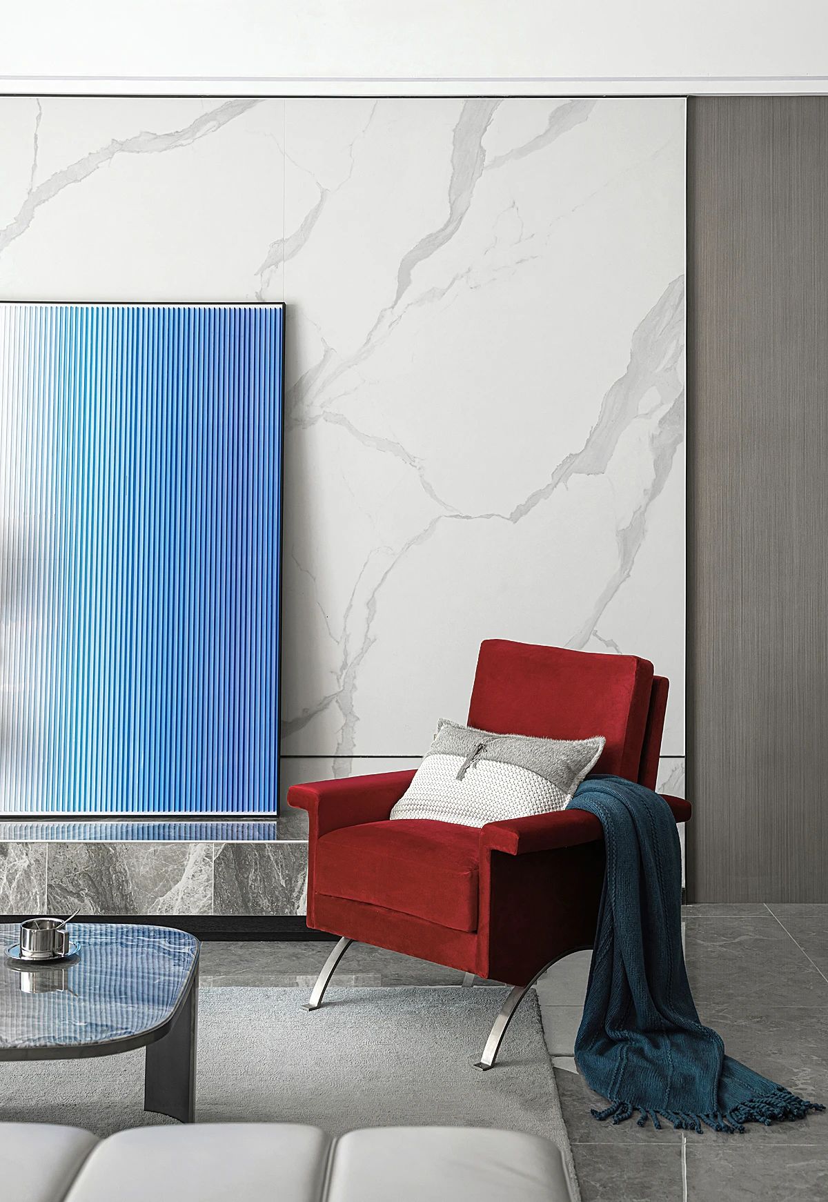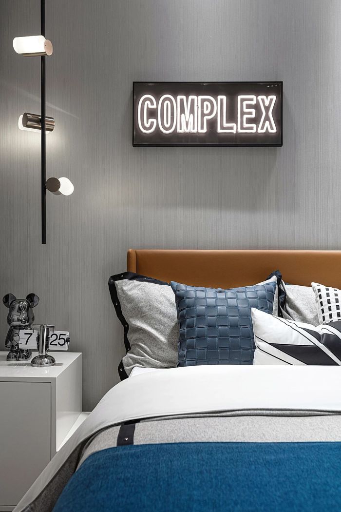 茶色玻璃柜门带来些许深沉与雅致。也将置物功能在床尾延伸。入夜点亮床头的克莱因艺术灯饰,在鼠尾草与海盐的香气中,神秘的蓝色将梦境拉长。