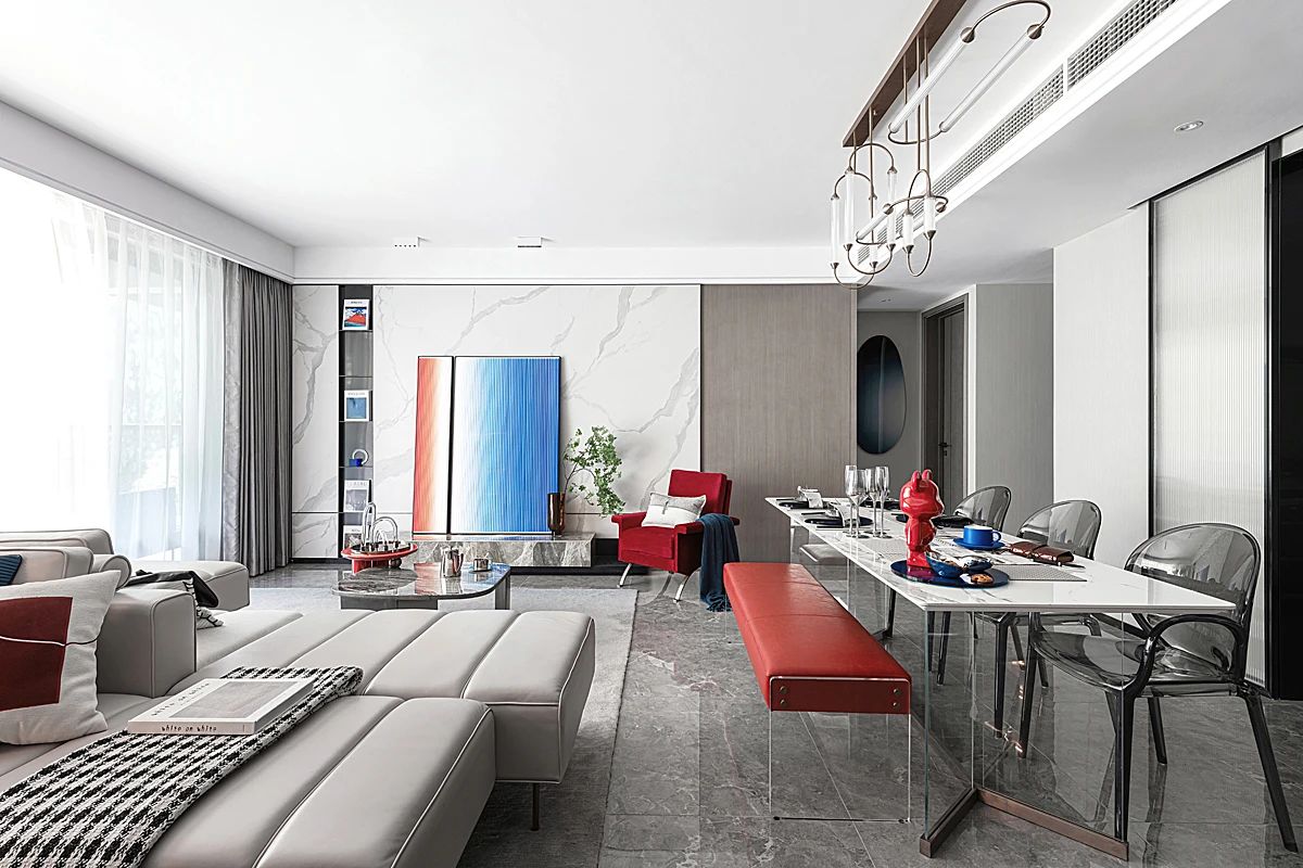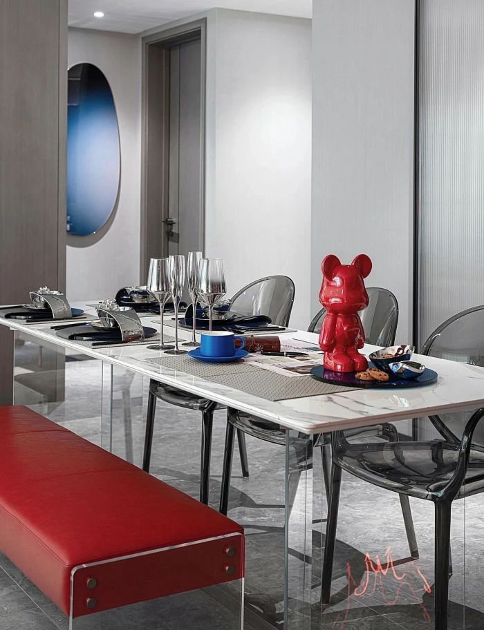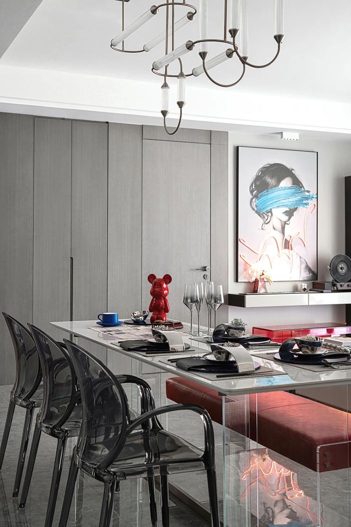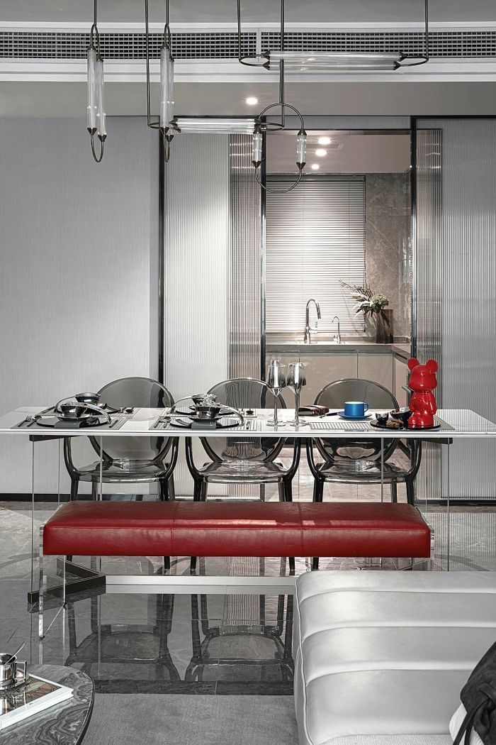 释放更多家庭空间 。独立且开放的餐厅布局,释放了更多家庭空间。材质通透的亚克力在视觉上更显轻盈,单椅与长凳的搭配使用为空间开启更多灵活与可变。