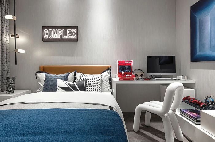 男孩房依据功能划分空间,收纳与展示、学习与睡眠。游戏手柄、汽车模型与星空宇宙,小主人关于速度与未知的好奇从未消逝;磁带、碟片与音响,是记忆里每一段闪光时刻。