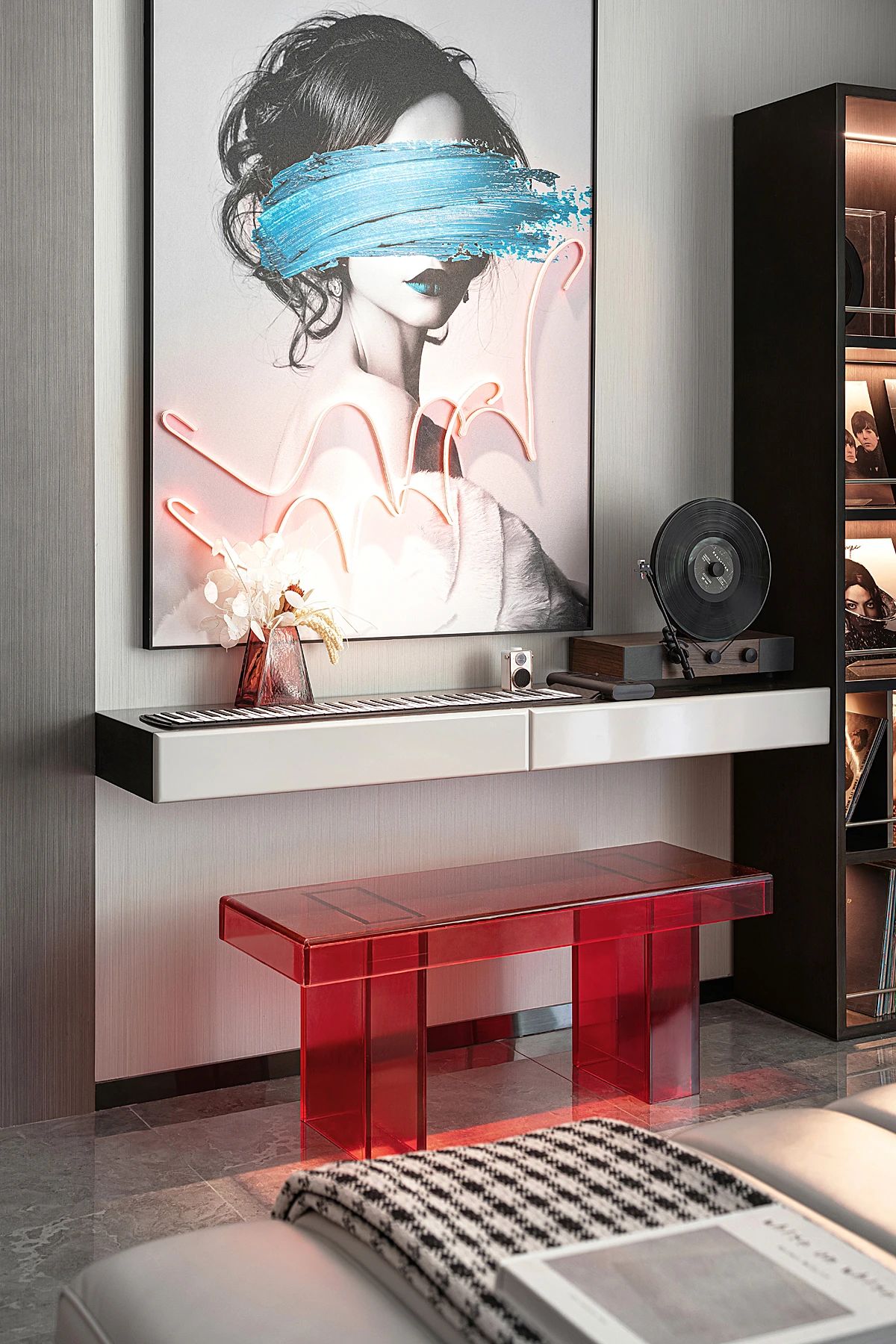 两侧墙面的艺术画作遥相呼应,巨幅比例与浓烈且大胆的色彩给人以沉浸式的画廊体验。主人的音乐品味和艺术审美被一一收纳在柜子里,造型独特的封面集群是房间内独一无二的风景。