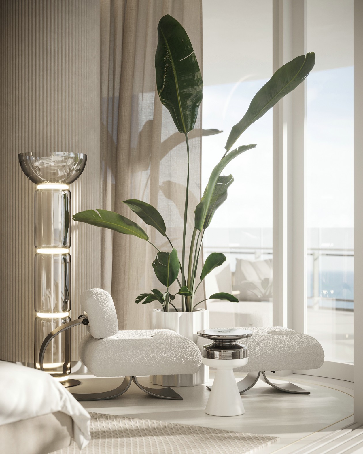 卧室设计师根据酒店房间的风格进行打造,大面积的落地窗搭配上白色窗帘,让明亮的光线更加柔和。落地窗前的绿植营造了惬意的自然气息,暖色的灯光,让空间中暖意更浓。