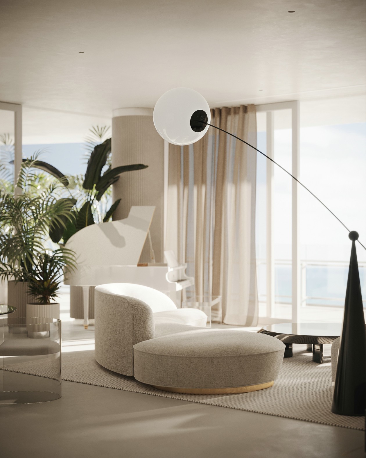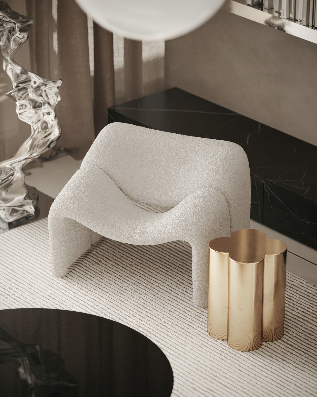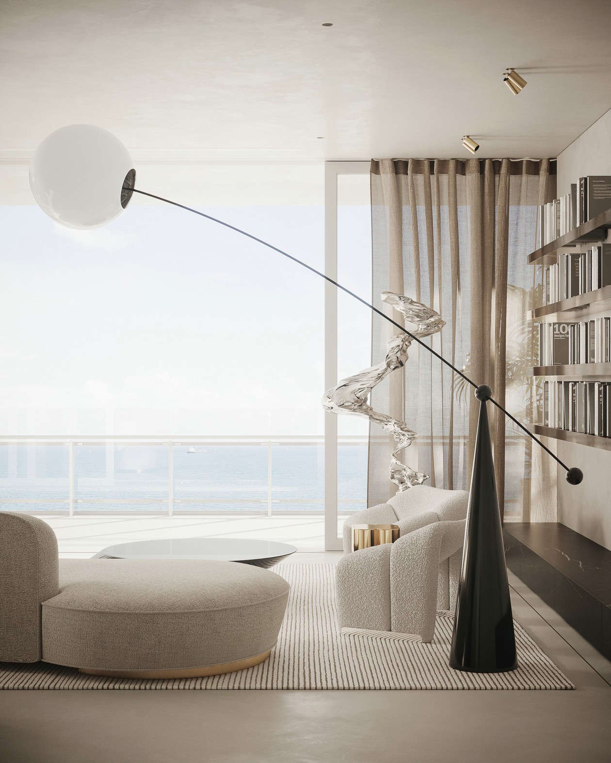 客厅中,大面积的落地窗保证了充足的采光,打造出明亮通透的视觉感受。环形的浅灰色沙发搭配黑色茶几,再加入金属元素作为点缀。一旁的钢制书架反射光线,有一种特殊的清灵感,造型独特的雕塑展现了空间的艺术美感。