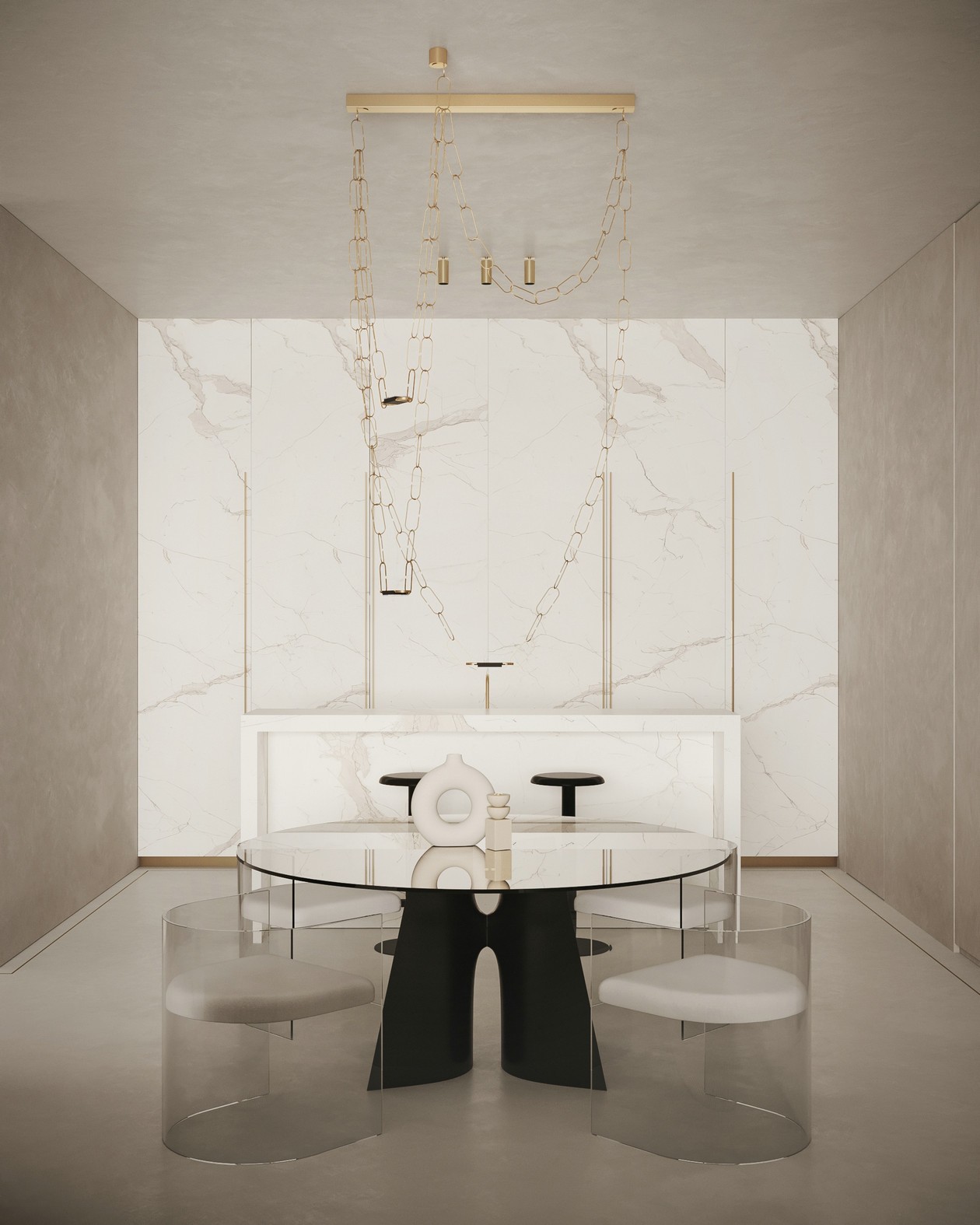 厨房与餐厅位于同一空间,半开放式的设计使得空间具有整体性。玻璃材质的餐桌造型简洁,上方的装饰摆件简约而不简单。吊灯选用链条来牵引,营造类似港口的氛围感。餐桌后方的白色大理石中岛台,展现了空间的轻奢气息。