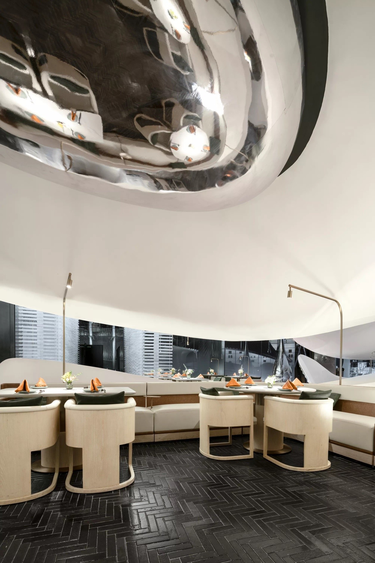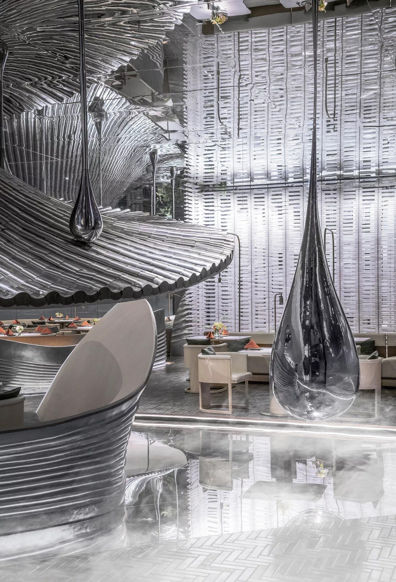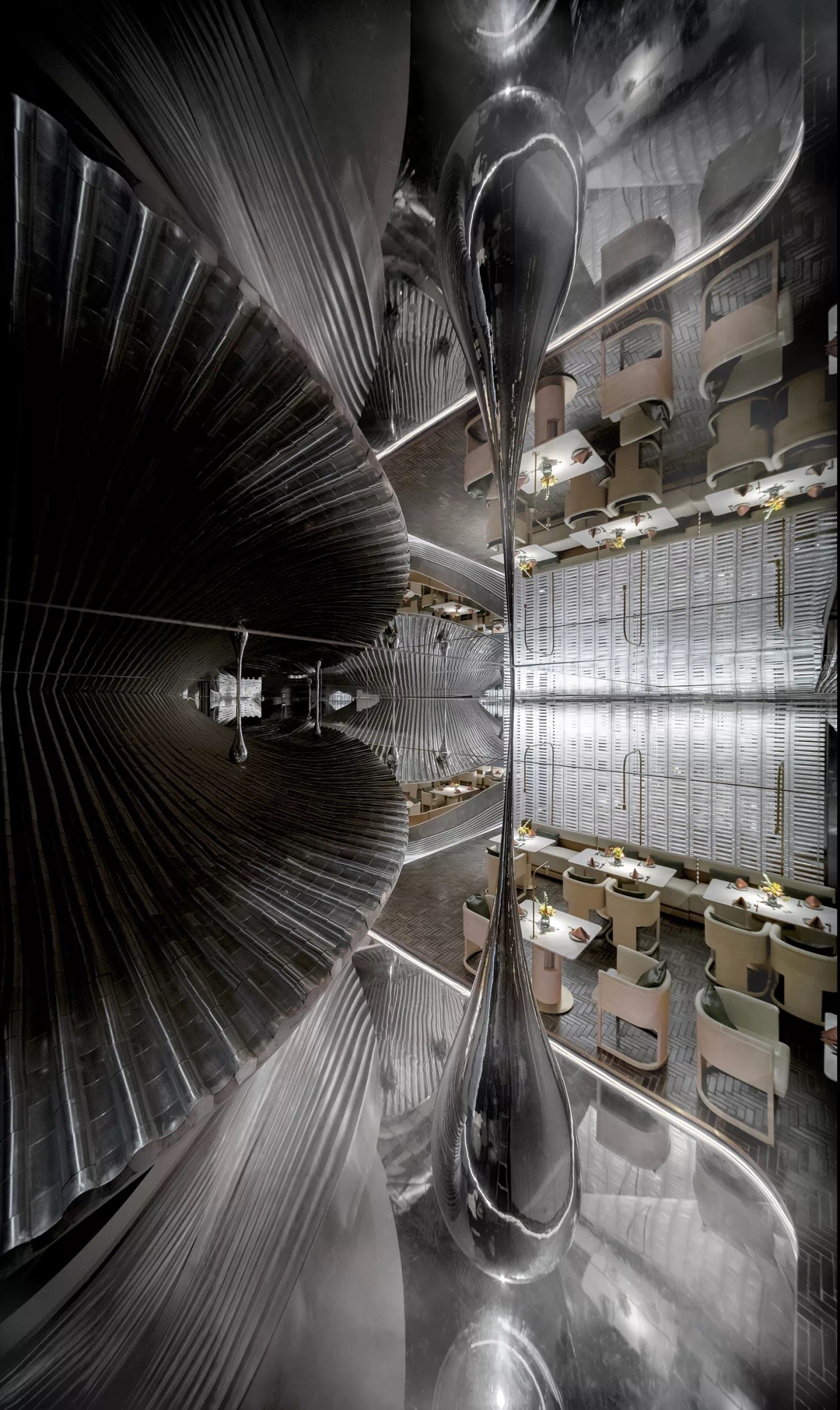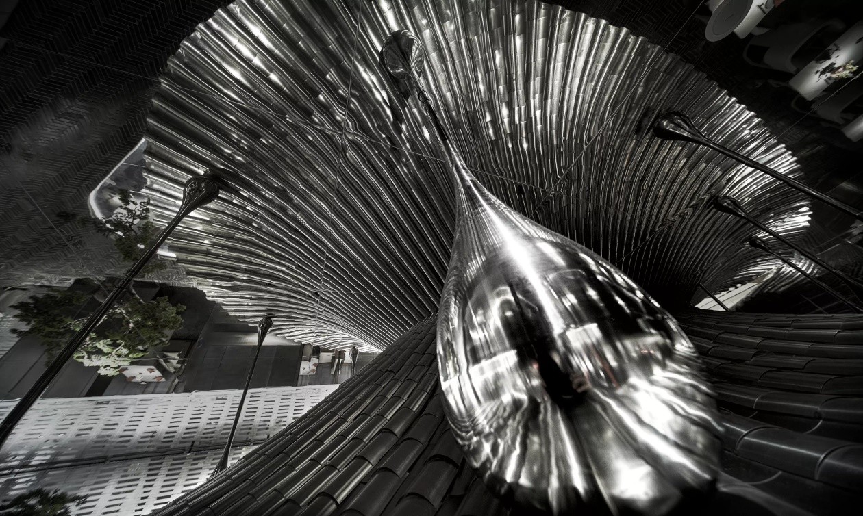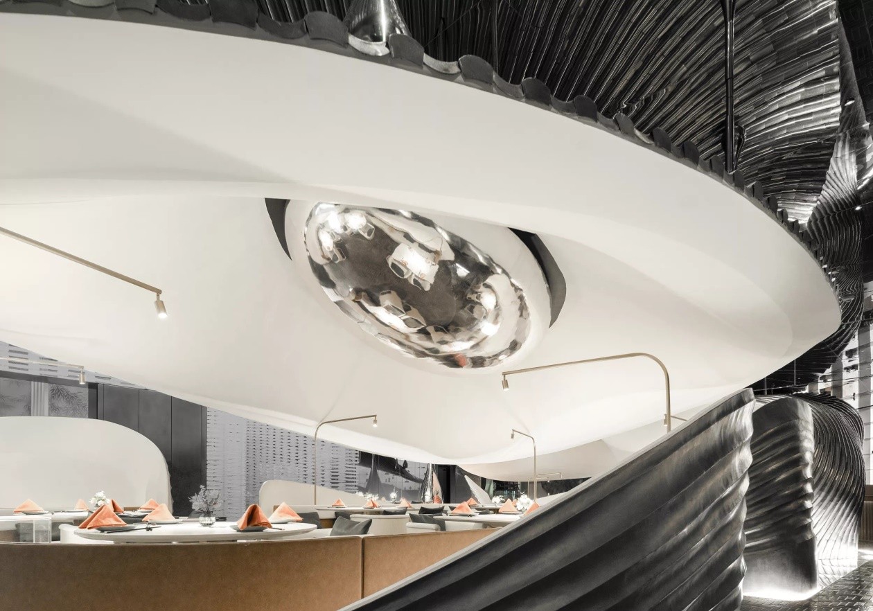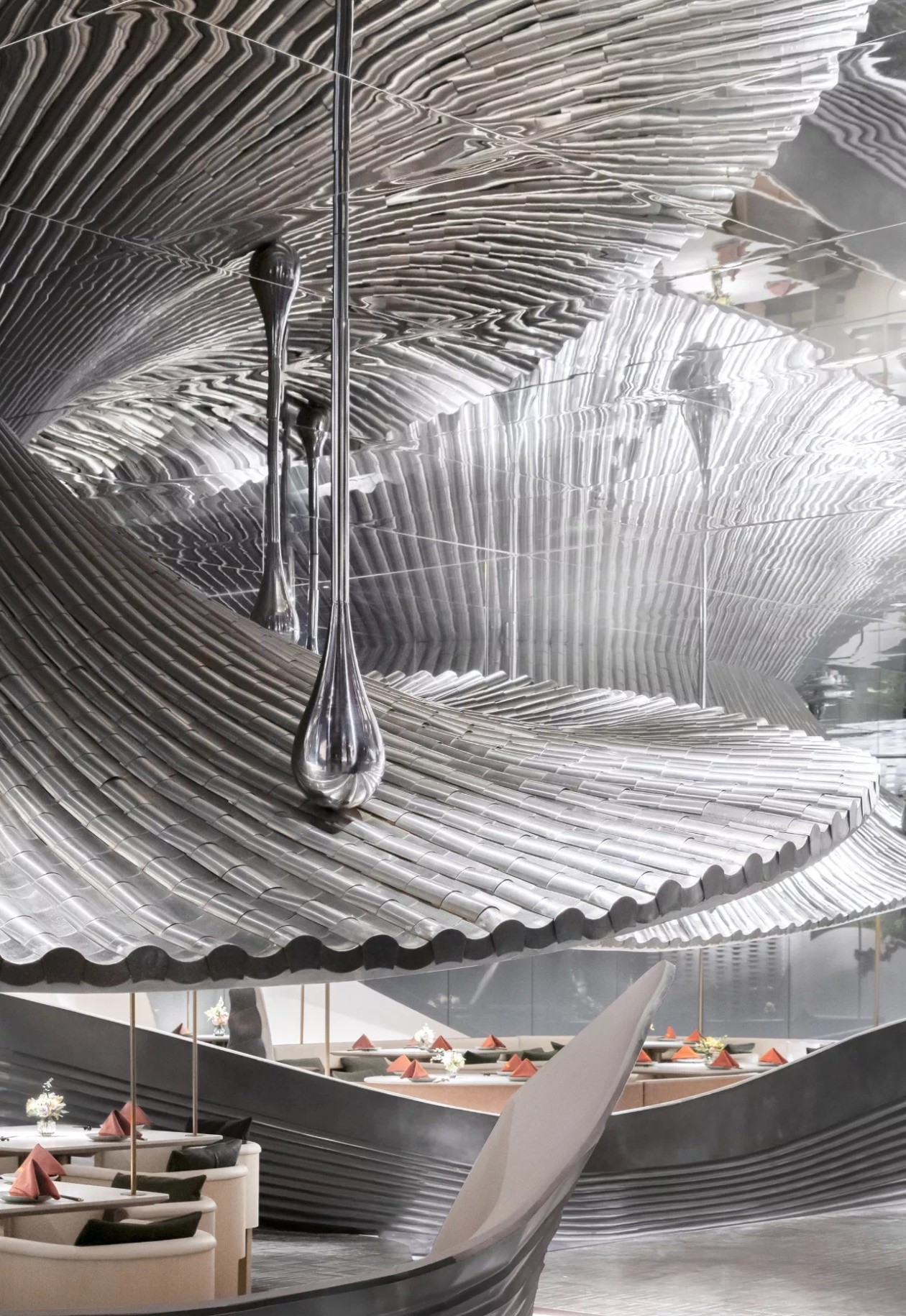 在空间的核心区域,取用山水意象,设计强调了空间的视觉趣味性。中心就餐区以流线框出一处由镜面不锈钢材料构成的“水景”,顶部通过室内建构的方式,将“山”的形态,抽象为倾盖而下、流动的坡屋顶。