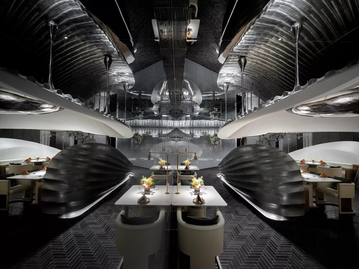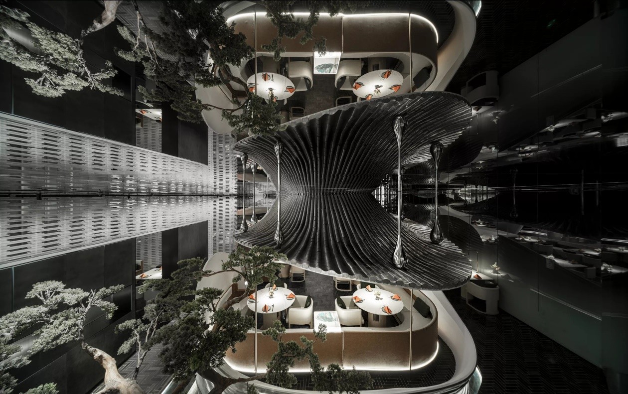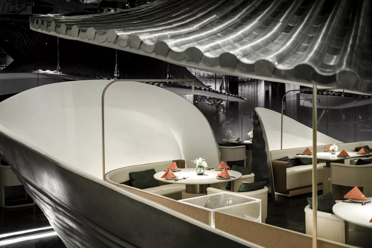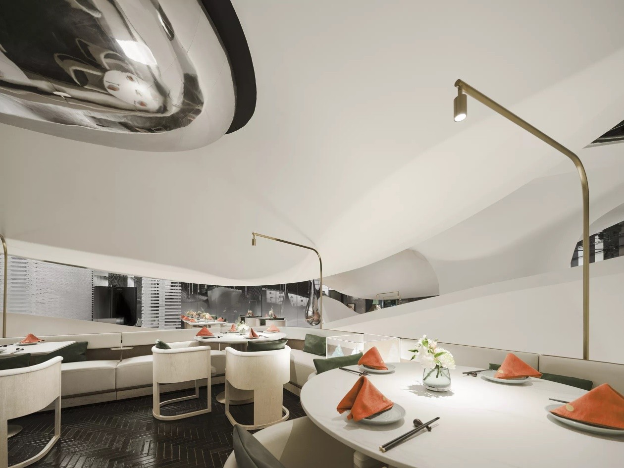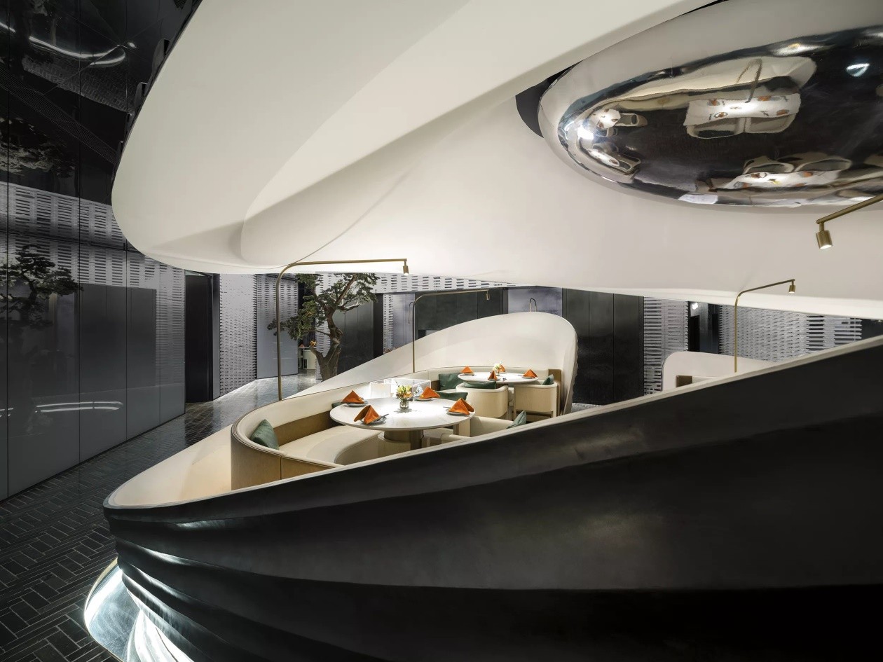 在空间的核心区域,取用山水意象,设计强调了空间的视觉趣味性。中心就餐区以流线框出一处由镜面不锈钢材料构成的“水景”,顶部通过室内建构的方式,将“山”的形态,抽象为倾盖而下、流动的坡屋顶。