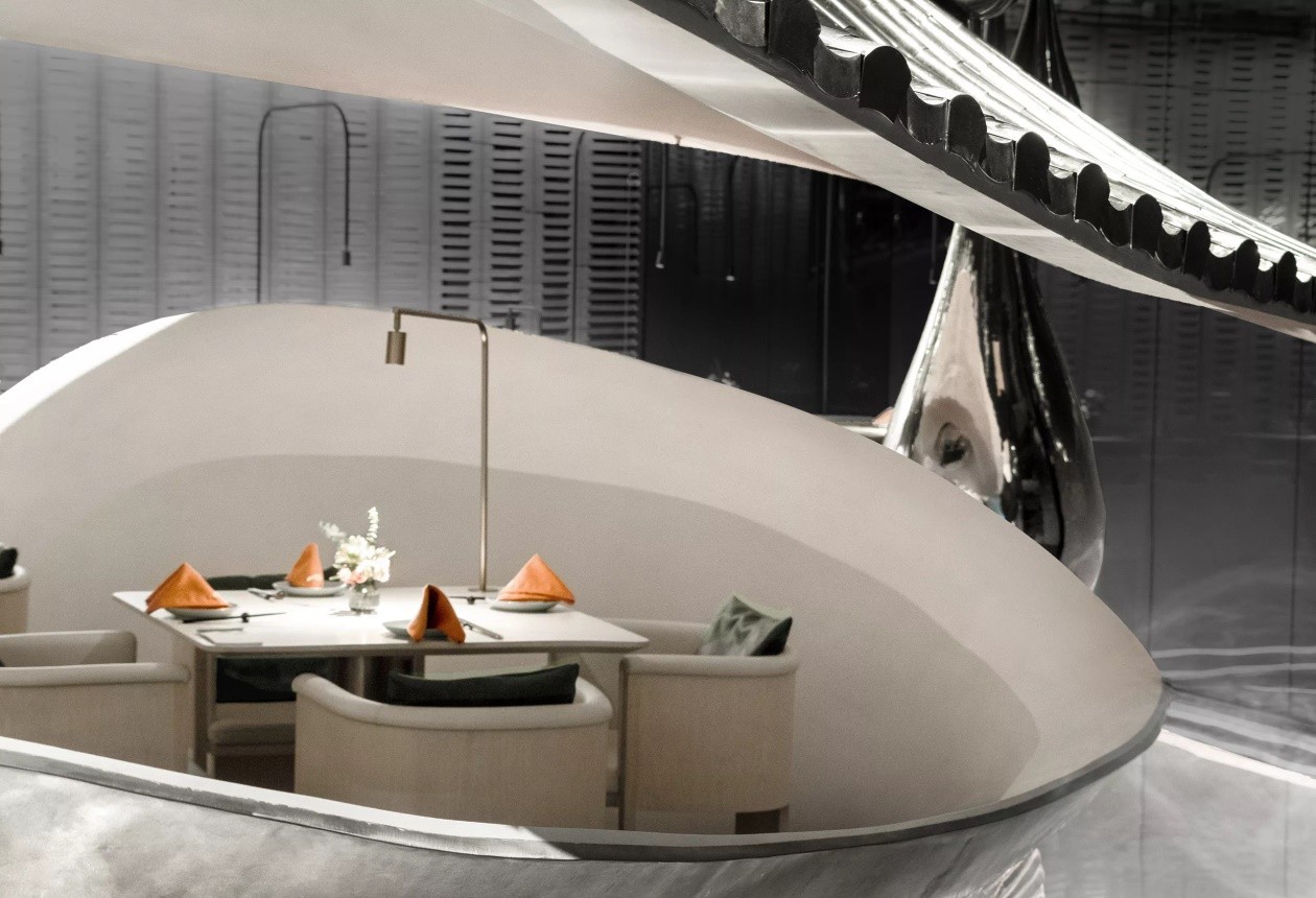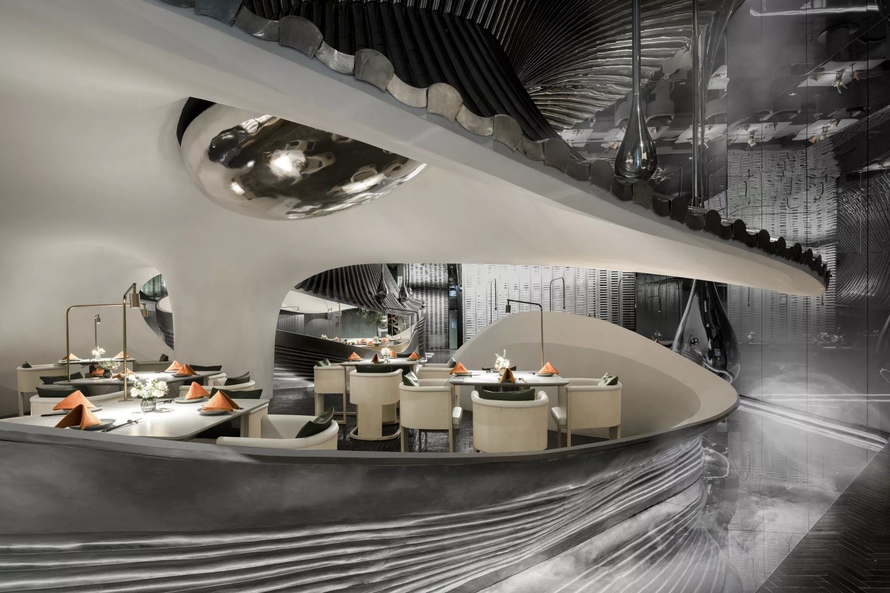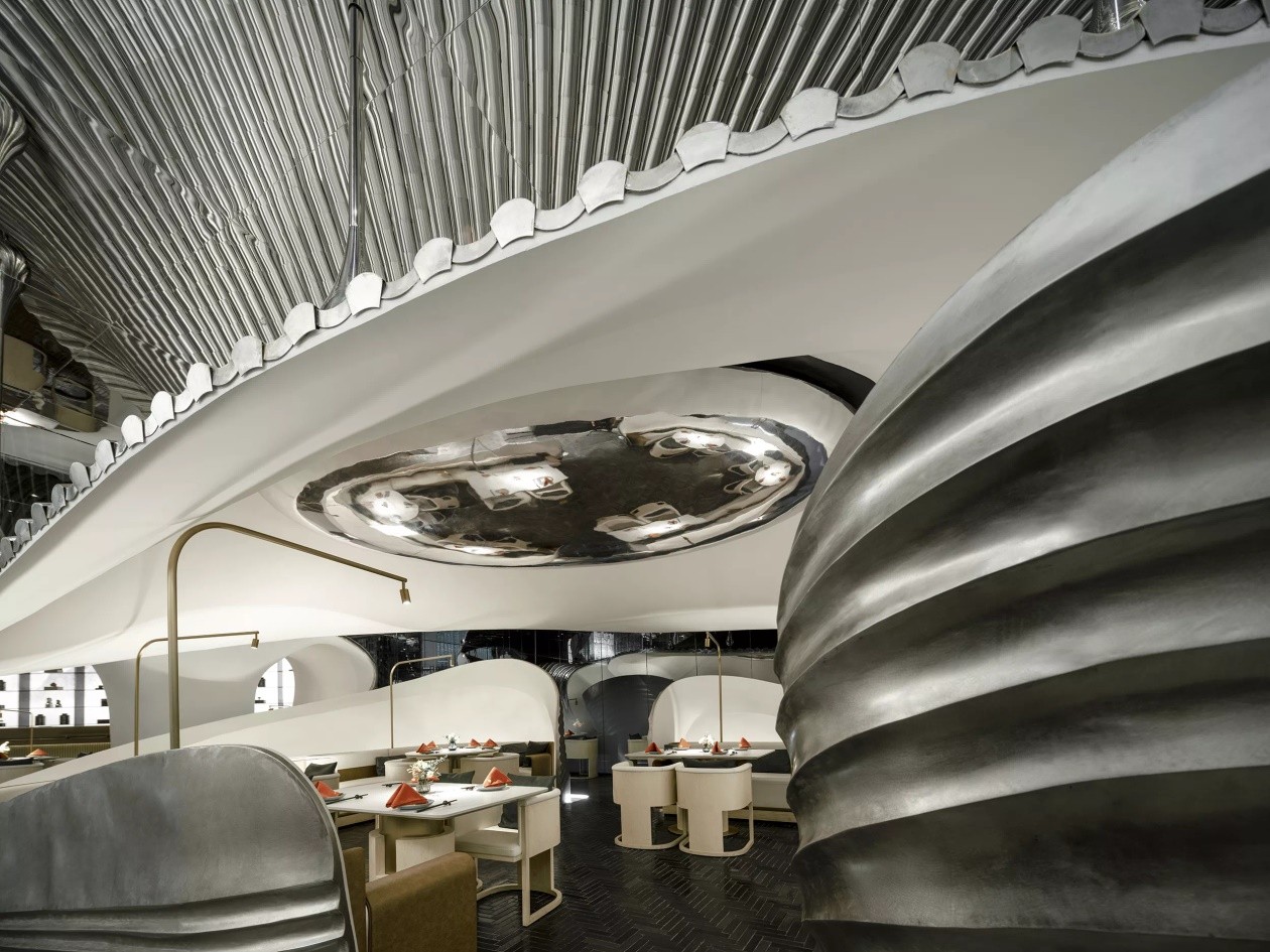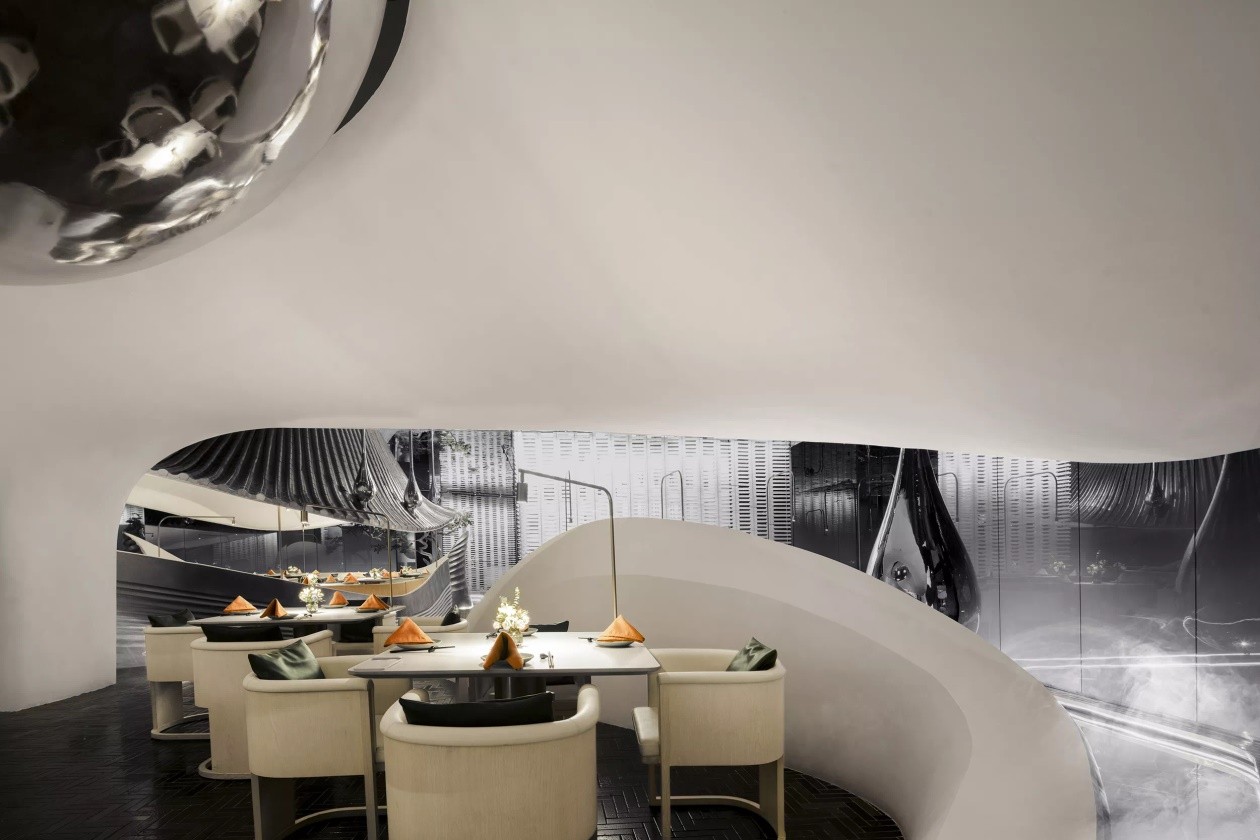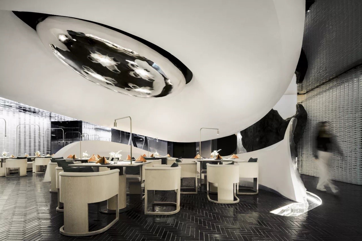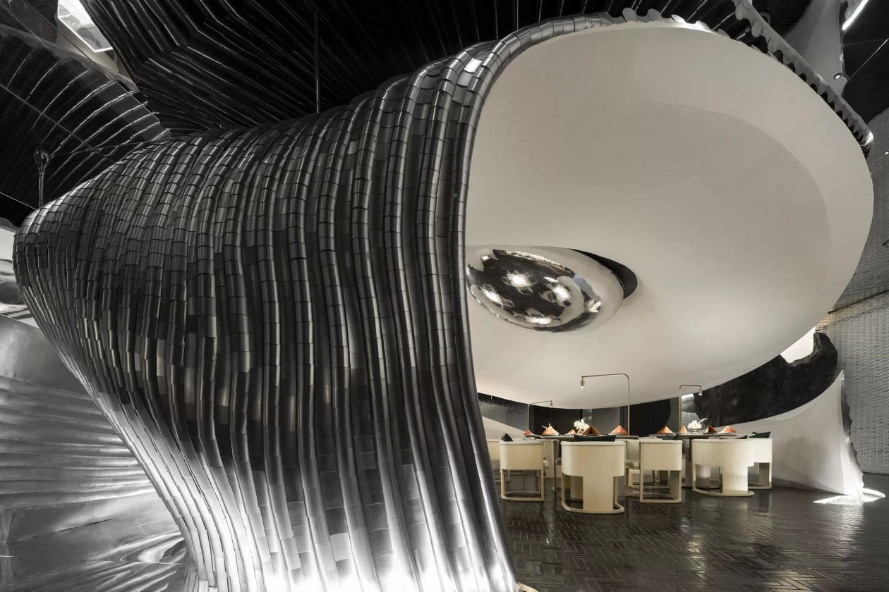 在空间的核心区域,取用山水意象,设计强调了空间的视觉趣味性。中心就餐区以流线框出一处由镜面不锈钢材料构成的“水景”,顶部通过室内建构的方式,将“山”的形态,抽象为倾盖而下、流动的坡屋顶。