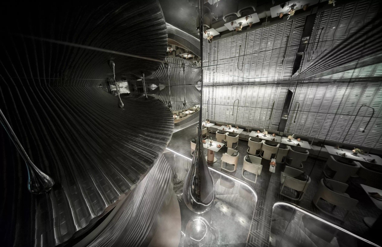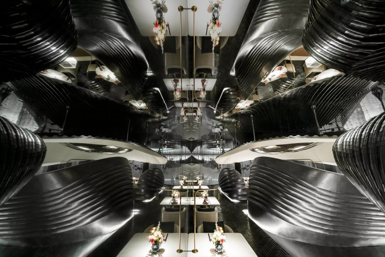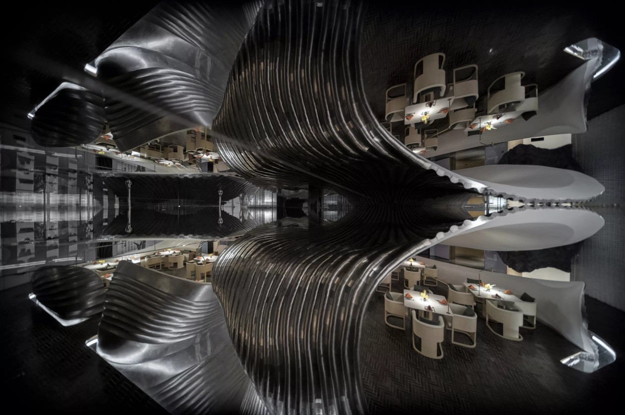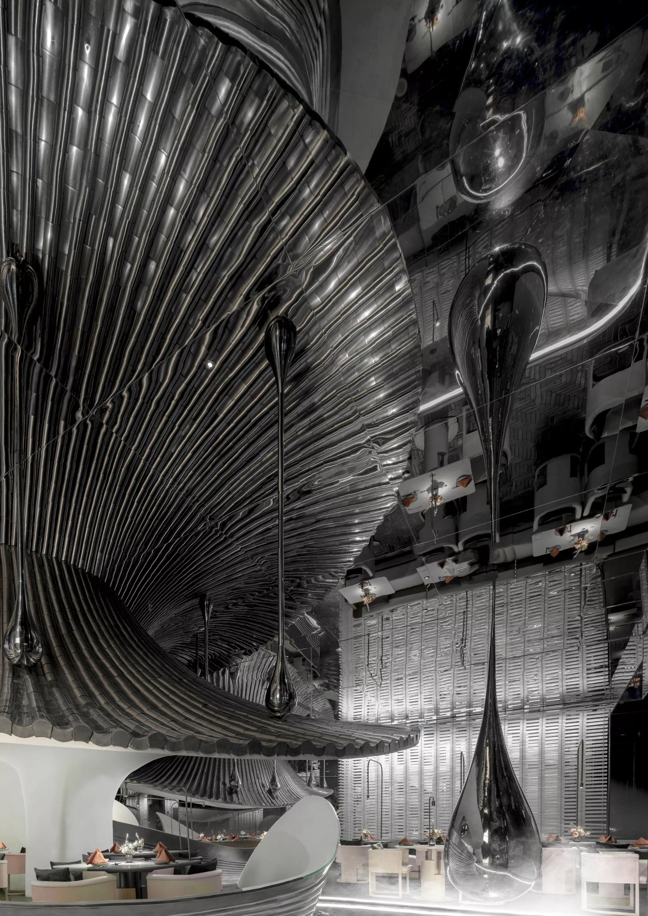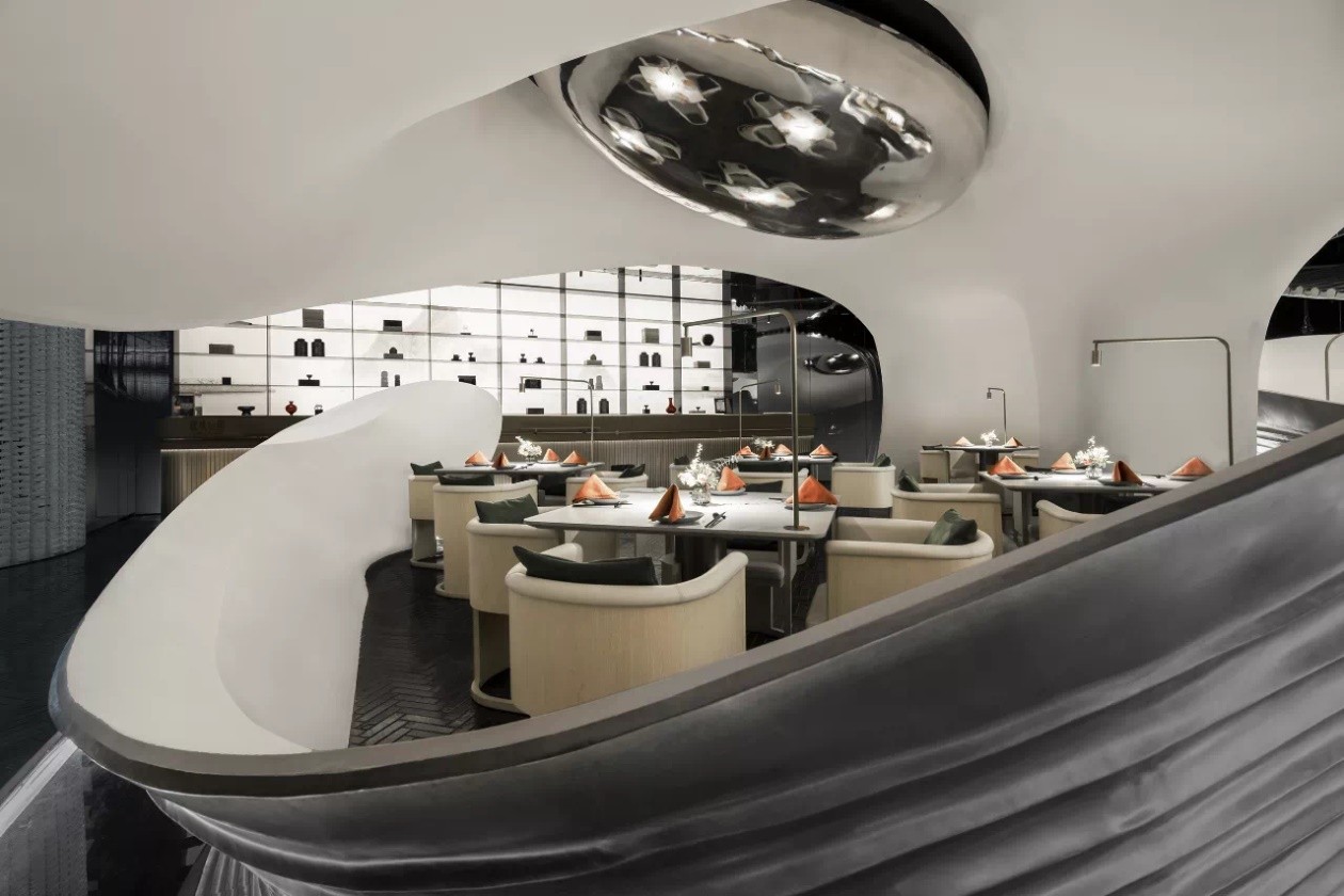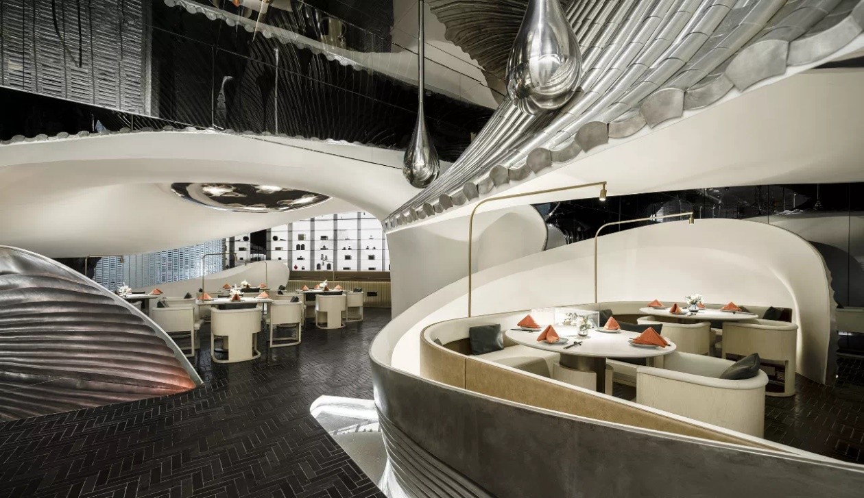 在空间的核心区域,取用山水意象,设计强调了空间的视觉趣味性。中心就餐区以流线框出一处由镜面不锈钢材料构成的“水景”,顶部通过室内建构的方式,将“山”的形态,抽象为倾盖而下、流动的坡屋顶。