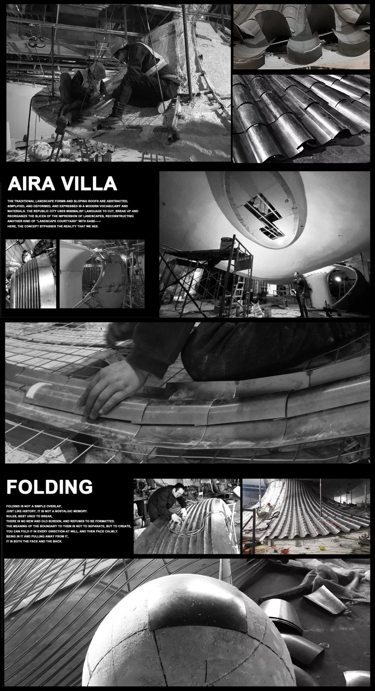 庭院瓦片的符号,经由变形和次序重组,脱离了过去的厚重,却保留了过去的印象,金属瓦片以传统的语汇堆叠而下,形成流动的屋顶,也形成了半围合的墙体,空间随着檐脊的变换时而陡现、时而隐匿。