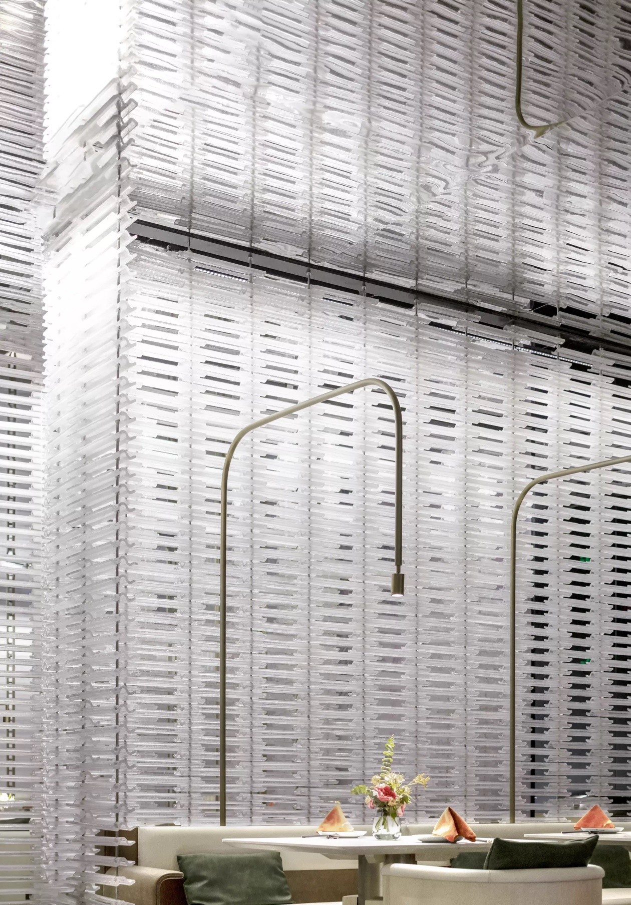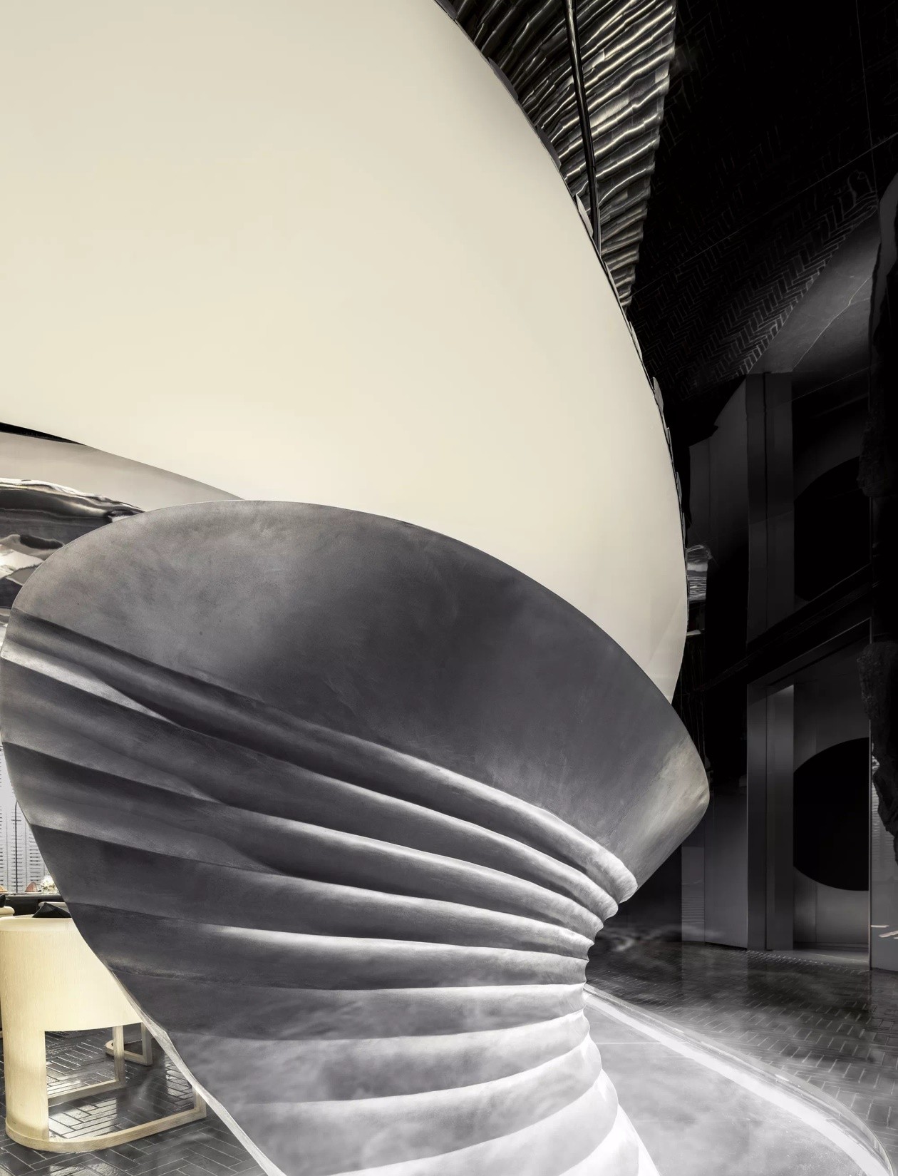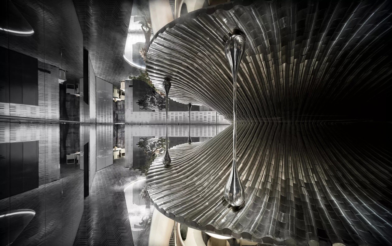 设计师以山水庭院作为设计意向,提取显性肌理作为元素,并在空间之中进行重置和改变,通过形态的抽象,材料的解构,超视觉的构思,将时空折叠,过去、现在、未来的江南山水印象在此交叠,重组。折叠并非对过去的简单重现,而是对过往知识与经验的迭代,覆盖,乃至融合。