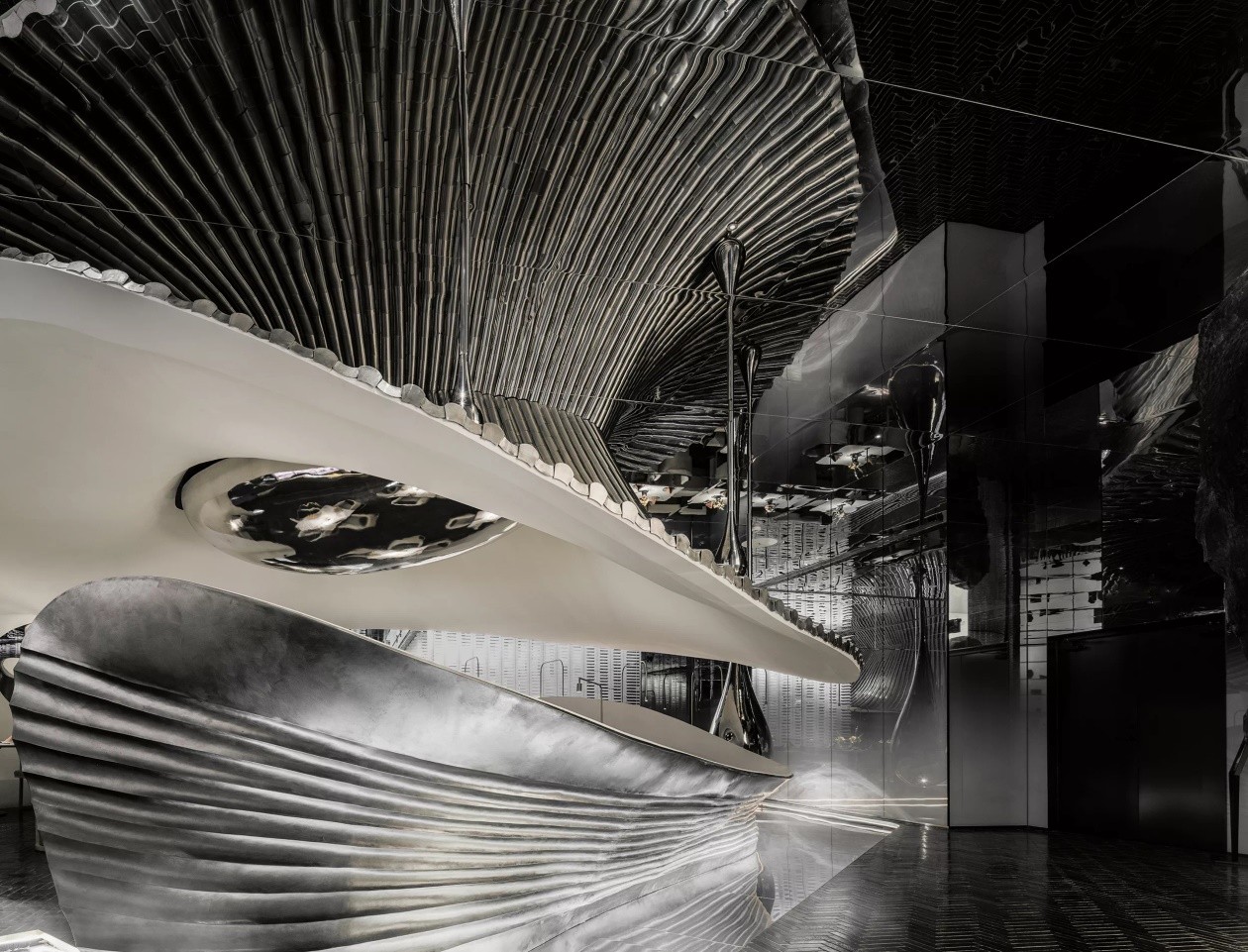 在整个空间体系中,设计以“未来山水”的形式存在,这对传统和未知的组合,基于一种在“开敞-闭合”之间来回折叠的空间感觉,在动线规划和空间布局上形成变奏,结合游走的顺序和体验逐层递进。