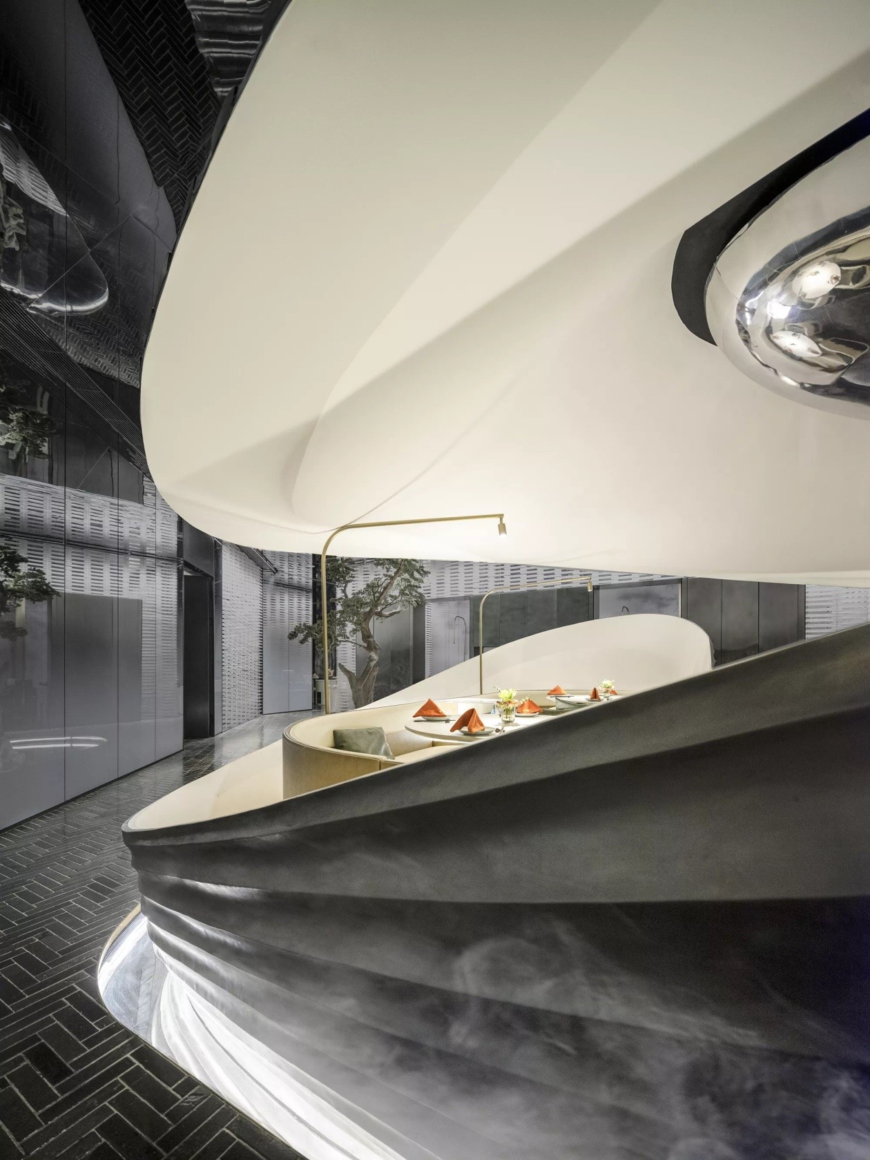 经过雾化玻璃的过滤,空间之中的灯光不再直锐,而是如涟漪般徐徐匀散,位于空间水平中间层的白色岩板桌面,轻托住光线并将其向周围漫反射,从而让餐厅中上层空间的光线变得柔和均质;而余光落在地面,被颜色深沉的岩板所吸收,使得餐厅空间越往下越显得幽暗,在垂直方向上营造出一种模糊的空间边界,赋予空间无限延伸的视觉效果。