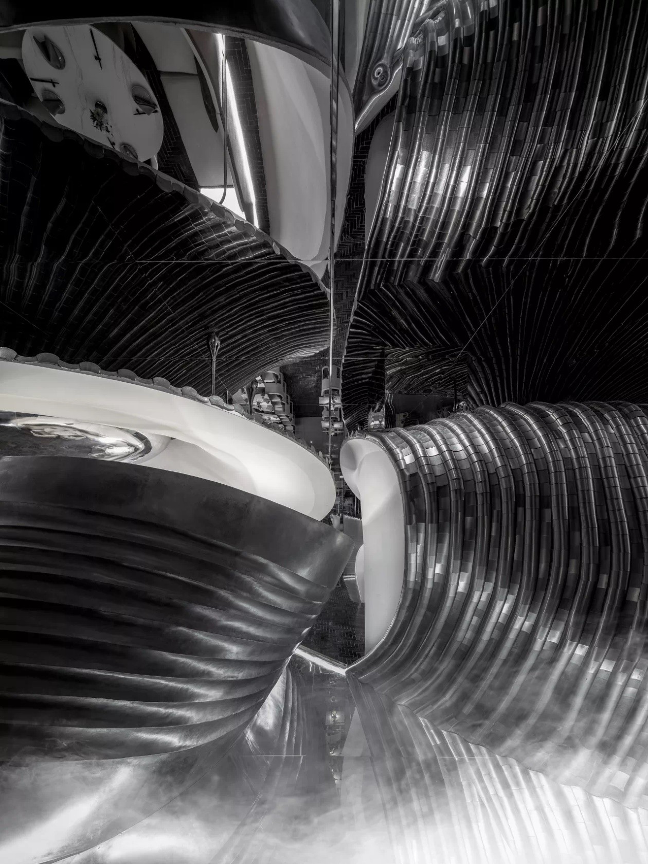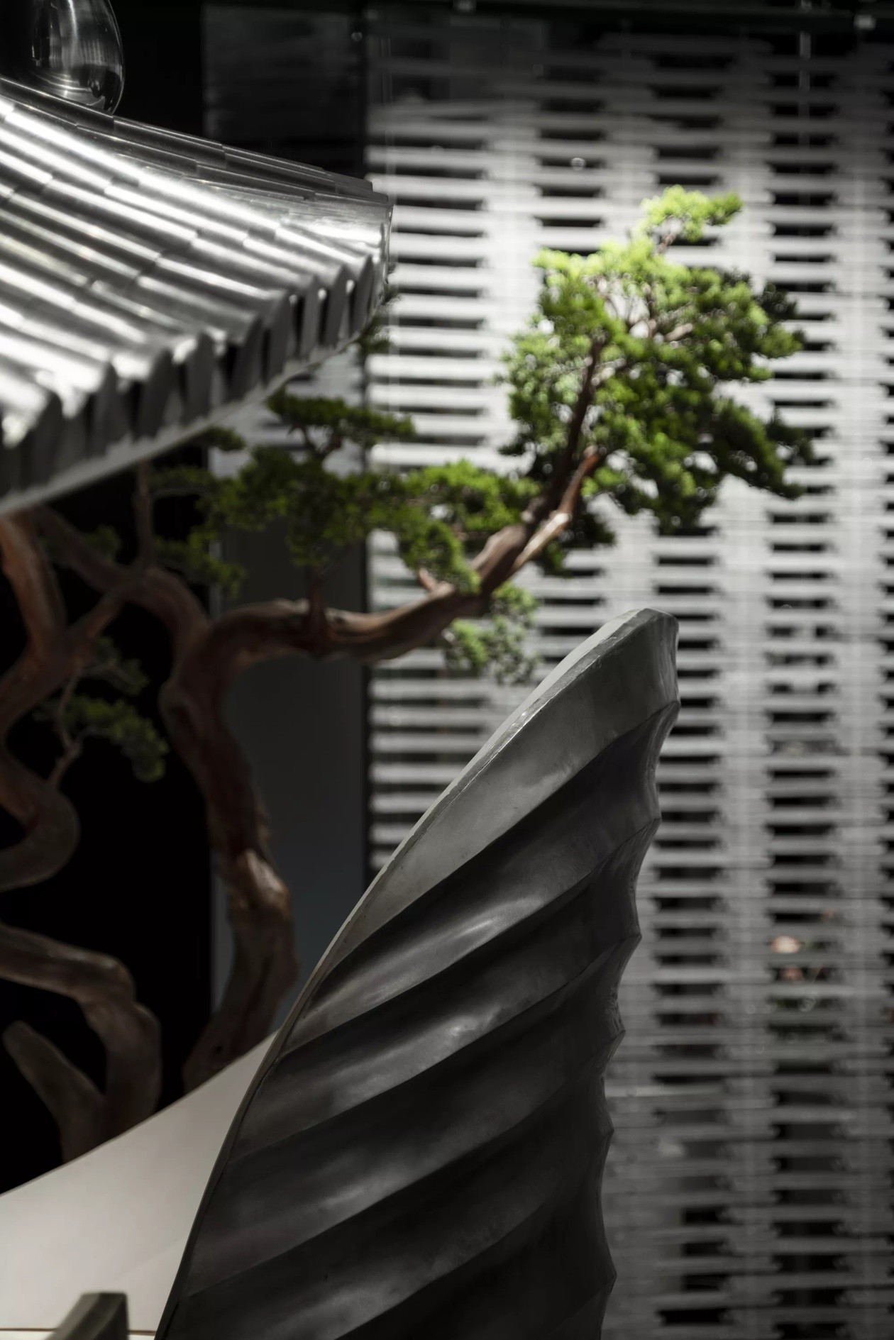 材料、线条、语汇的抽象,与体量、块面在空间中互为延伸,形成山水的演绎:“山”的连绵,“水”的静谧——由此所产生出的连续不规则的空间,在尺度感与空间感上赋予了全新的感受,充斥着一种革新式的冲击。