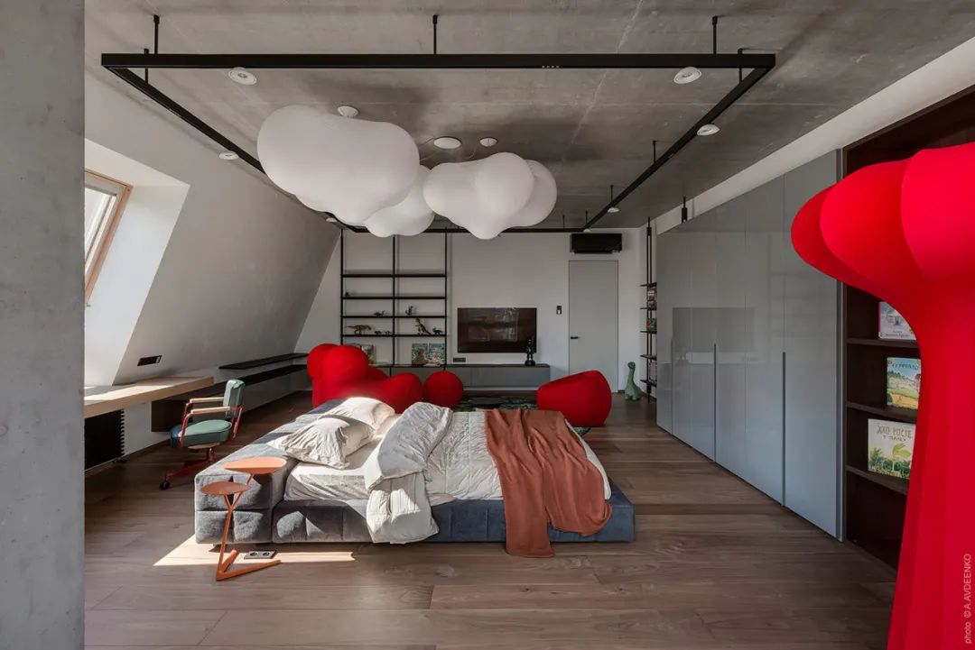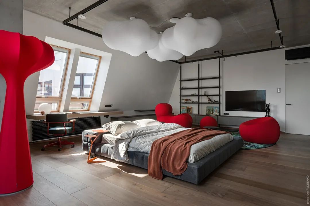 卧室裸露的水泥天花,红色的沙发椅,绿色的地毯,白色云朵形状的吊灯,设计师把这里打造的很有艺术氛围。