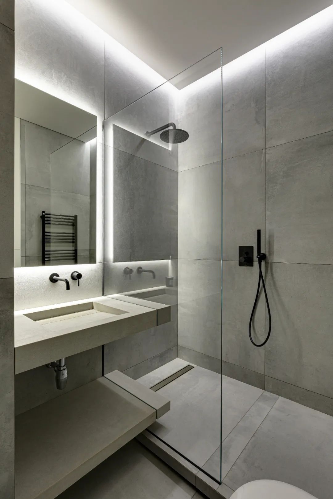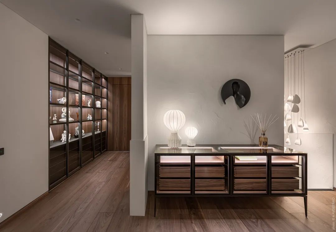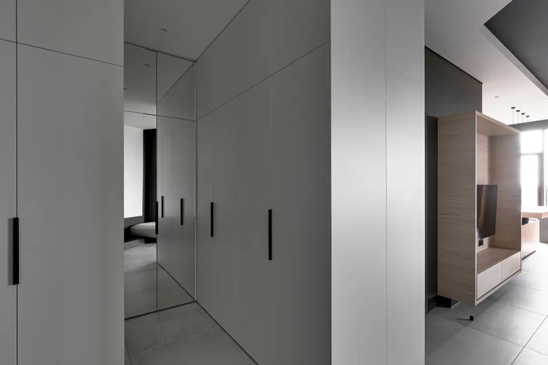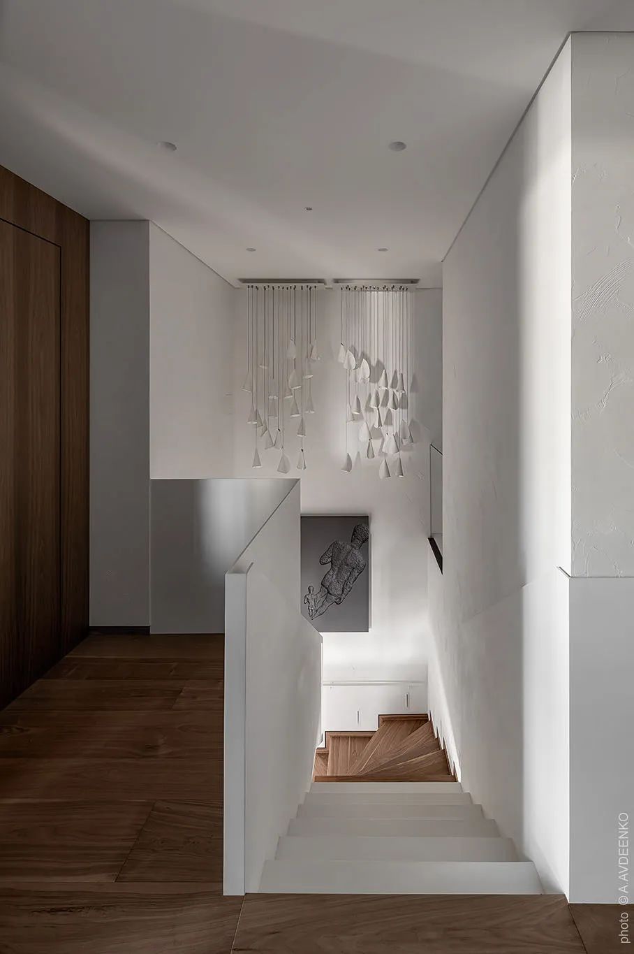 许多隐藏的存储区域,以保持空间清洁。玄关,线条简洁硬朗,隐形的衣柜,极简主义风格的楼梯过道,空间的每一个场景都是精心设计的。