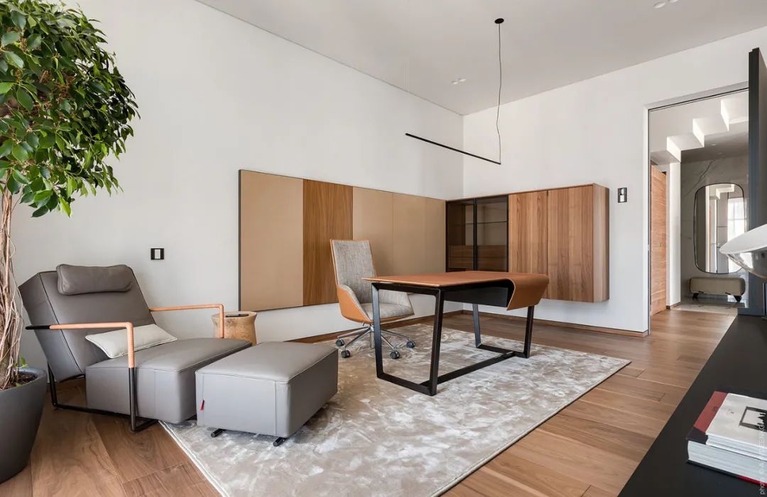 书房和两个卧室都位于二楼,其中书房的空间设计简单,家具不多,尽量让空间保留原有的开阔感,空间造型也是高低错落有致,极简的组合透出精致和高级。