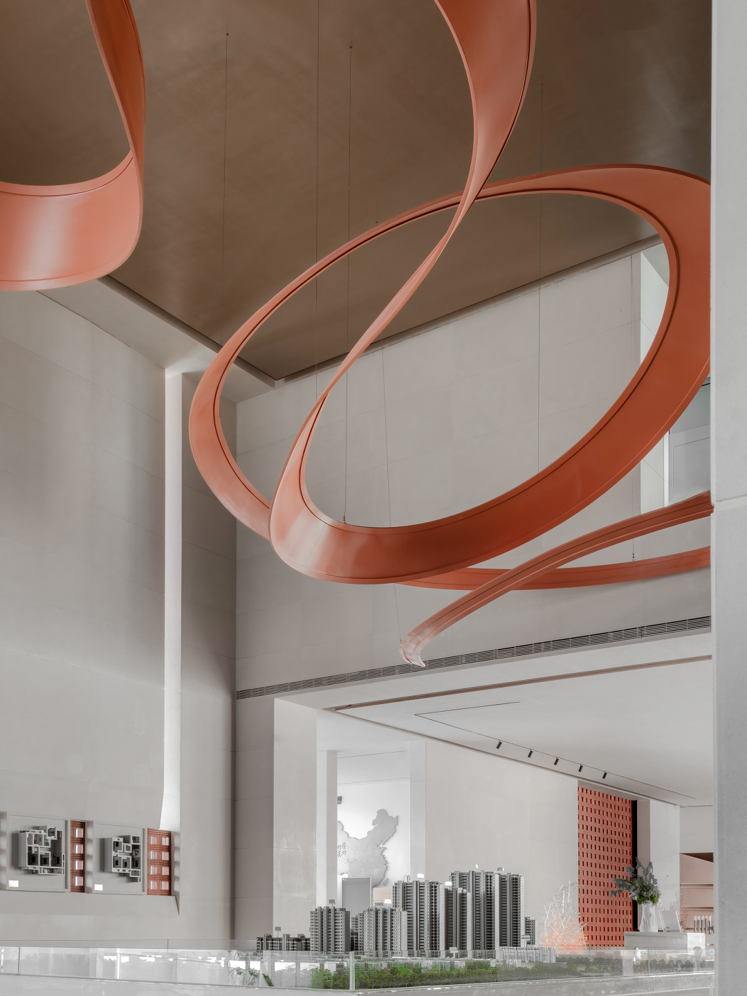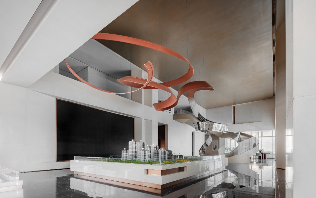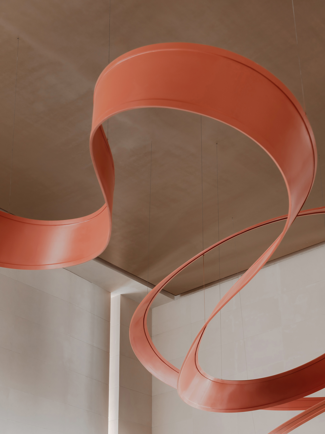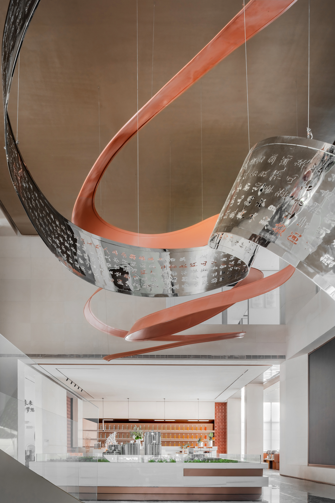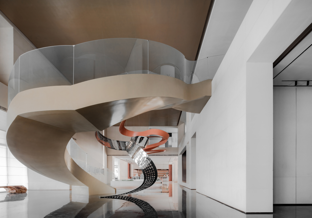时空纽带划过高空,与旋转楼梯相拥舞蹈。步伐进行至前,纽带越向上,色彩越鲜明,空间仿佛注入了一股生机蓬勃的力量。