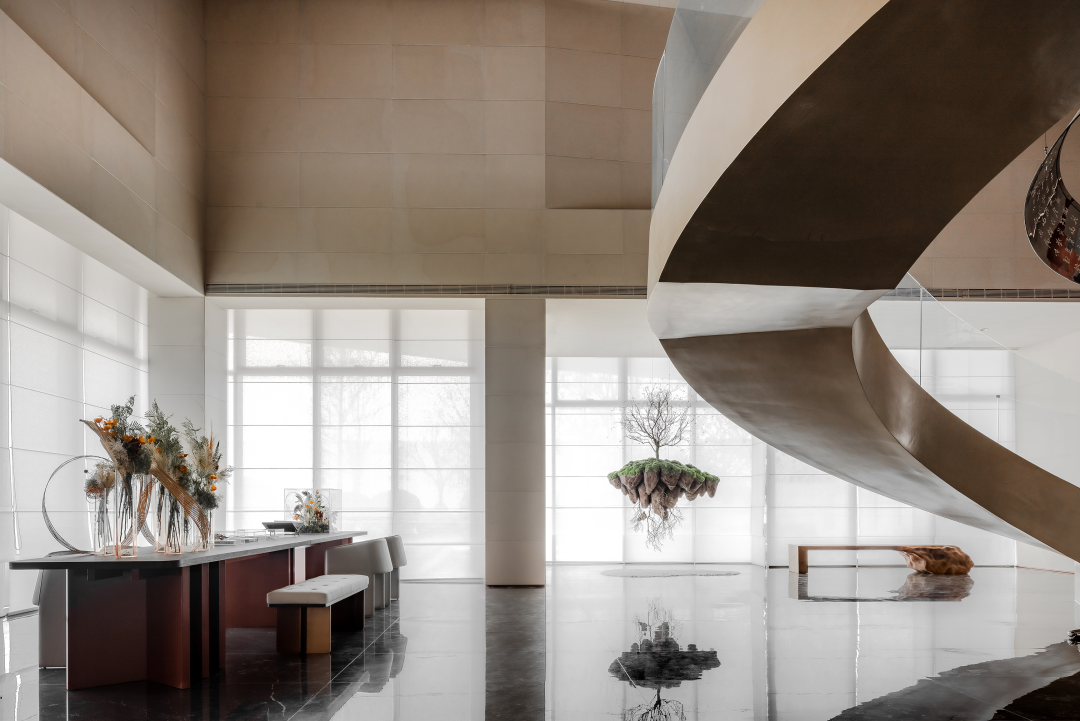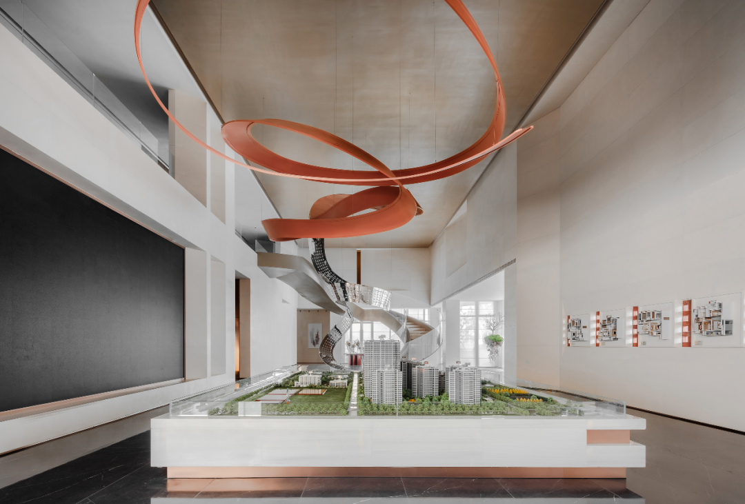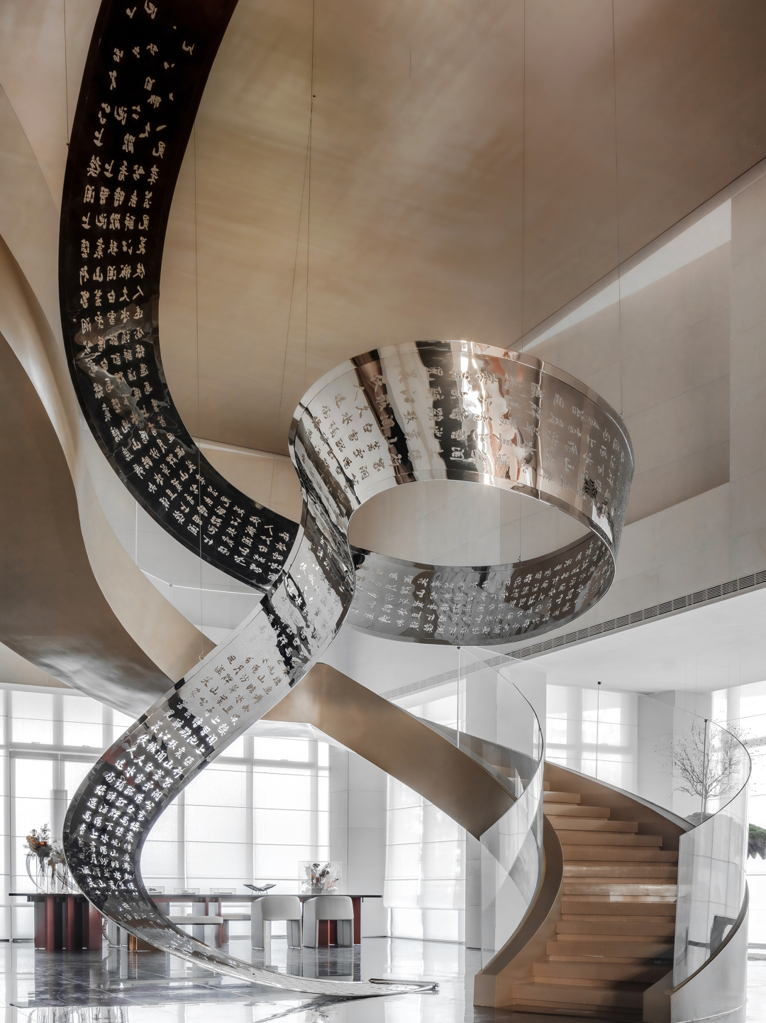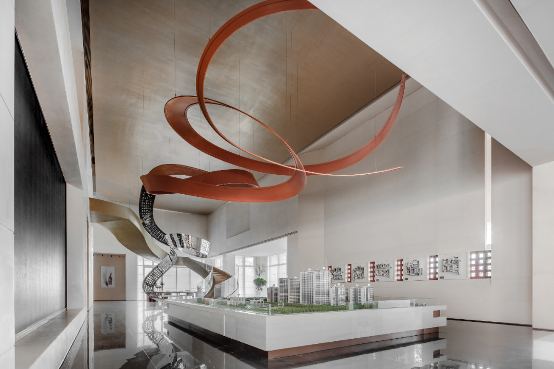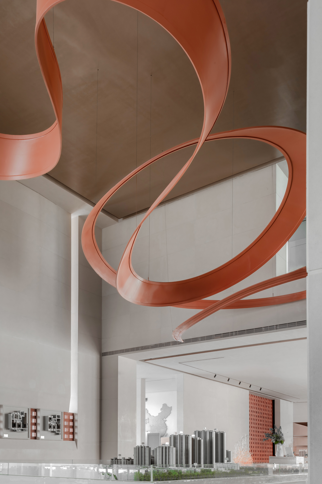时空纽带划过高空,与旋转楼梯相拥舞蹈。步伐进行至前,纽带越向上,色彩越鲜明,空间仿佛注入了一股生机蓬勃的力量。