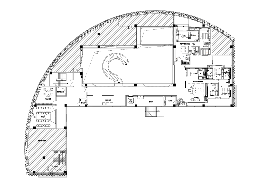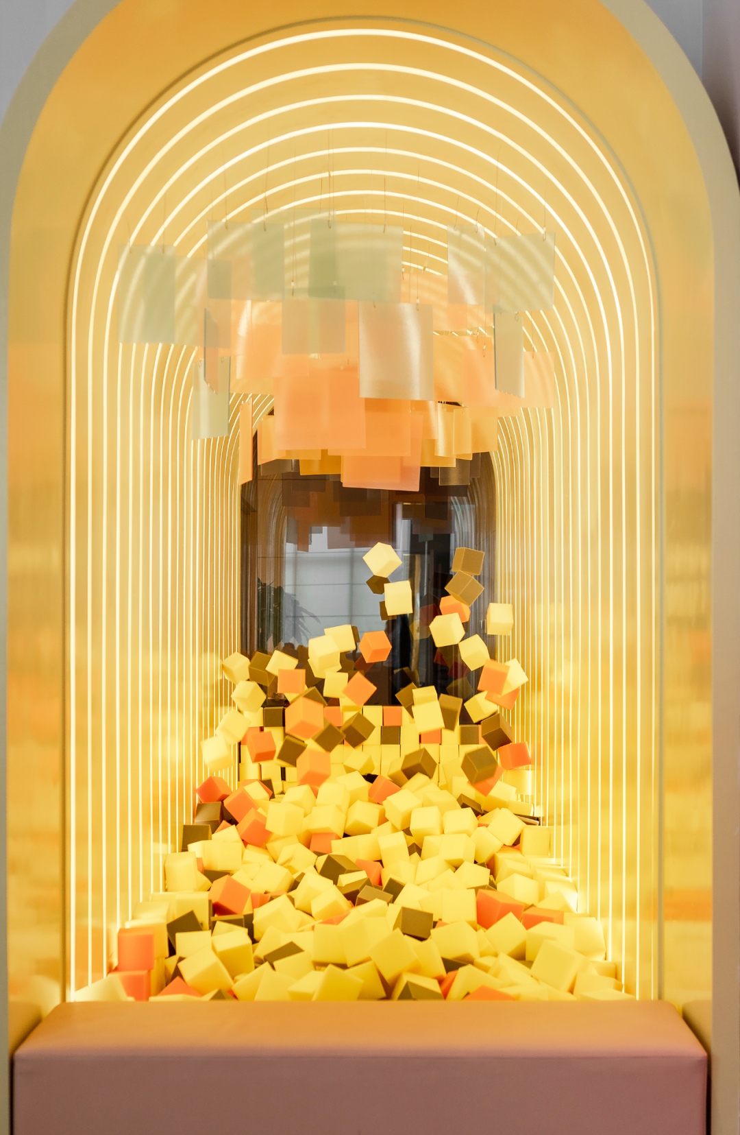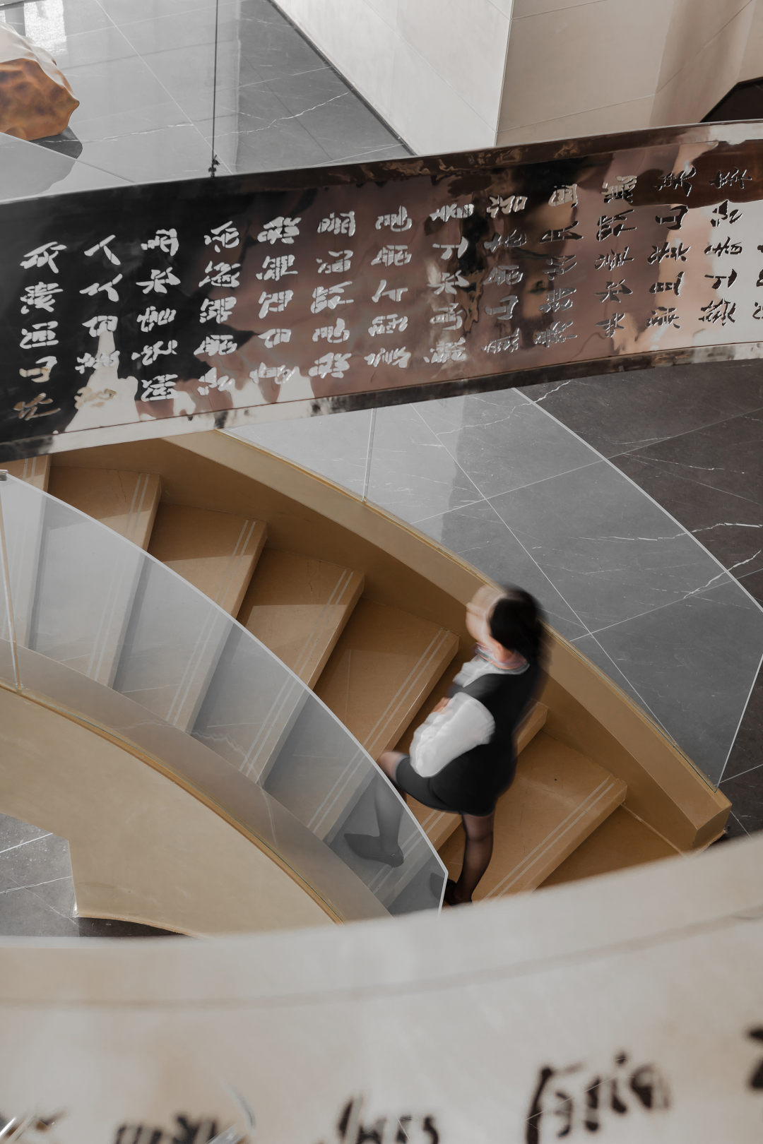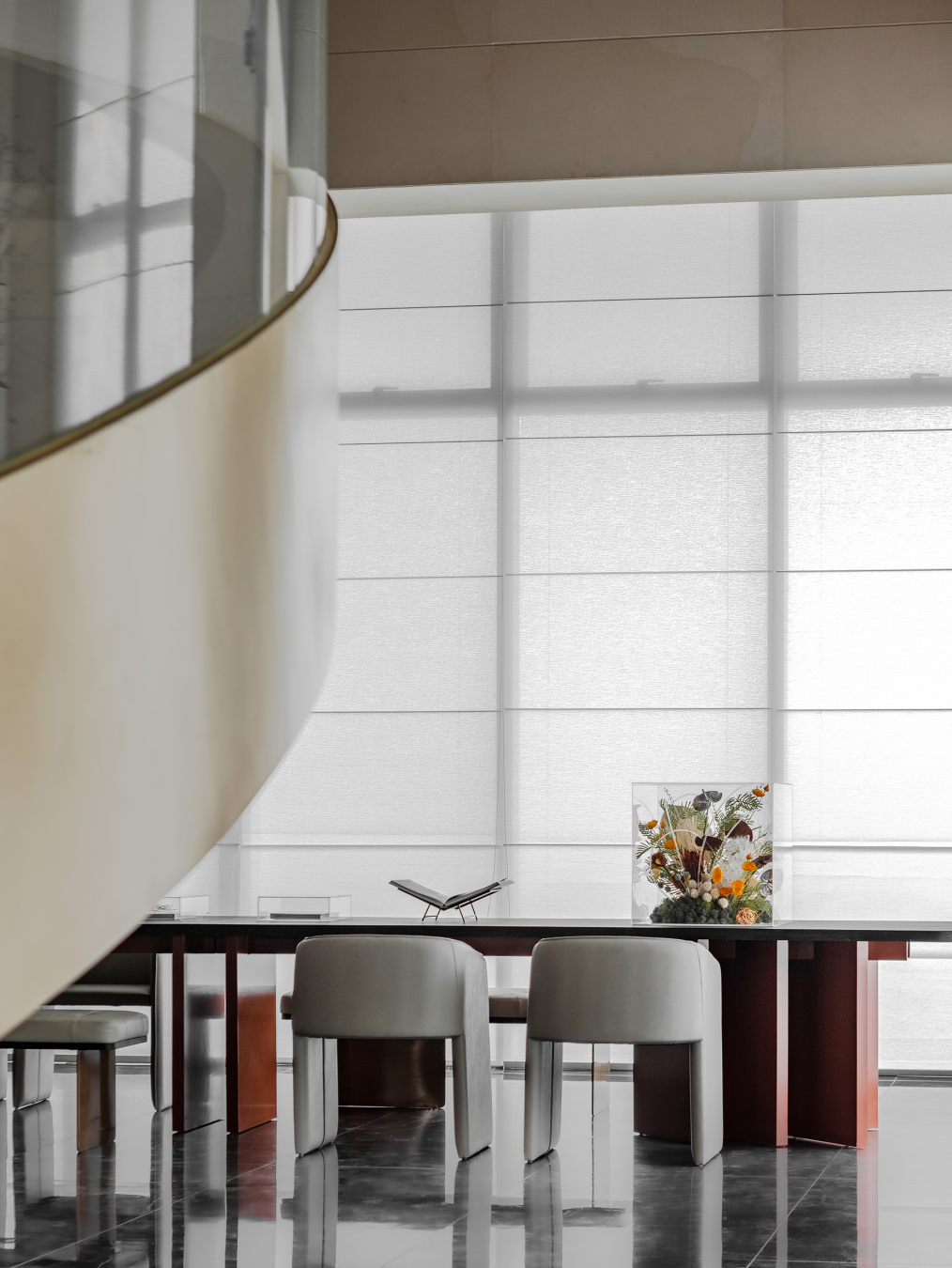 时空纽带划过高空,与旋转楼梯相拥舞蹈。步伐进行至前,纽带越向上,色彩越鲜明,空间仿佛注入了一股生机蓬勃的力量。