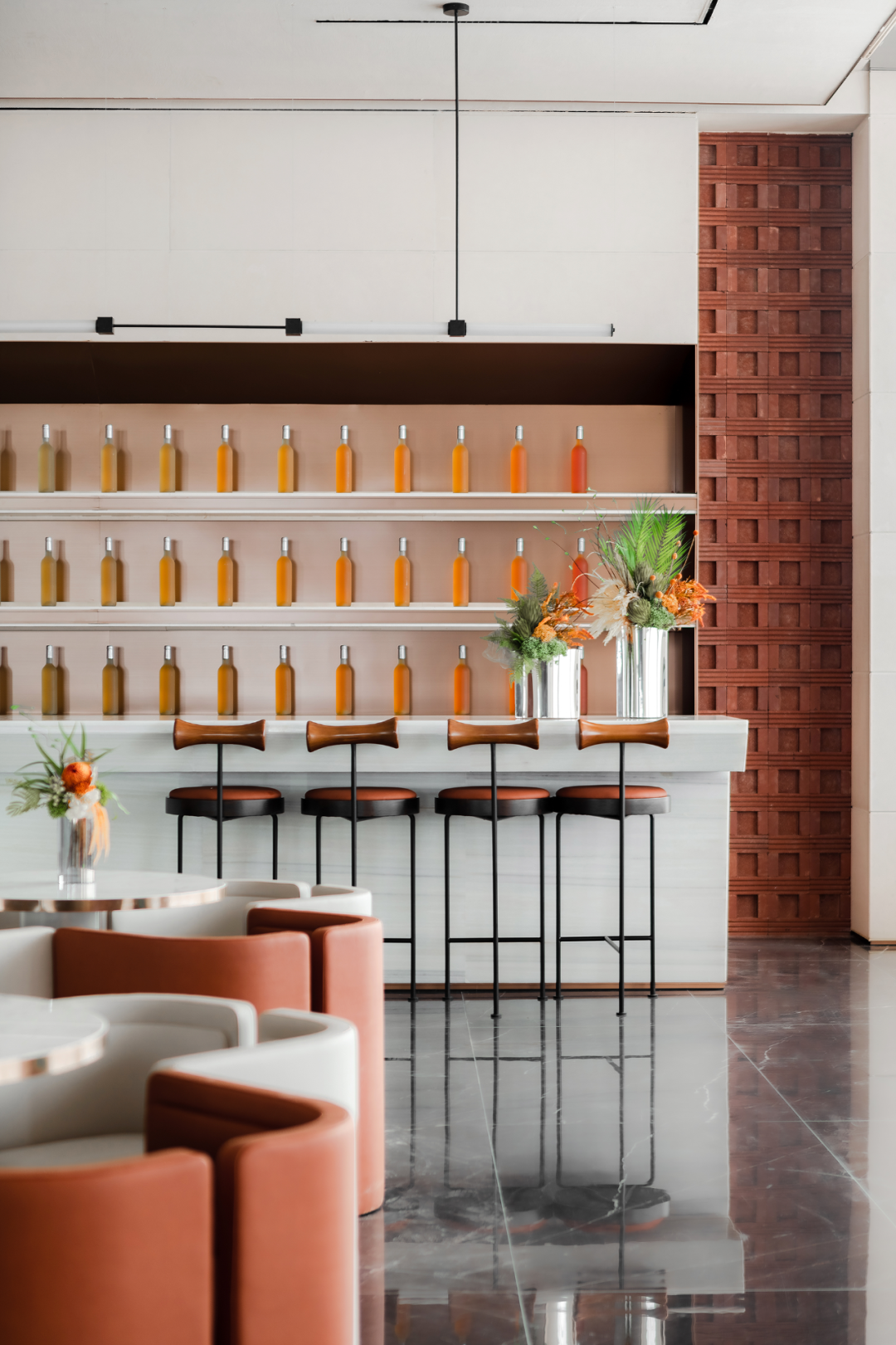传统红砖墙面耀眼并稳重,桌椅选择与墙面配色相和谐的座椅布置,将襄阳文化可视化呈现,让来者沉浸丰富的人文之旅。