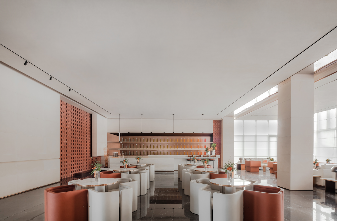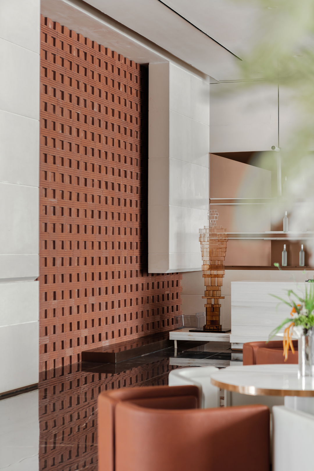 迈入室内是满眼的干净纯粹,大面积留白的墙面配合质朴的红砖点缀,似透非透,勾勒清雅的生活美学意境。